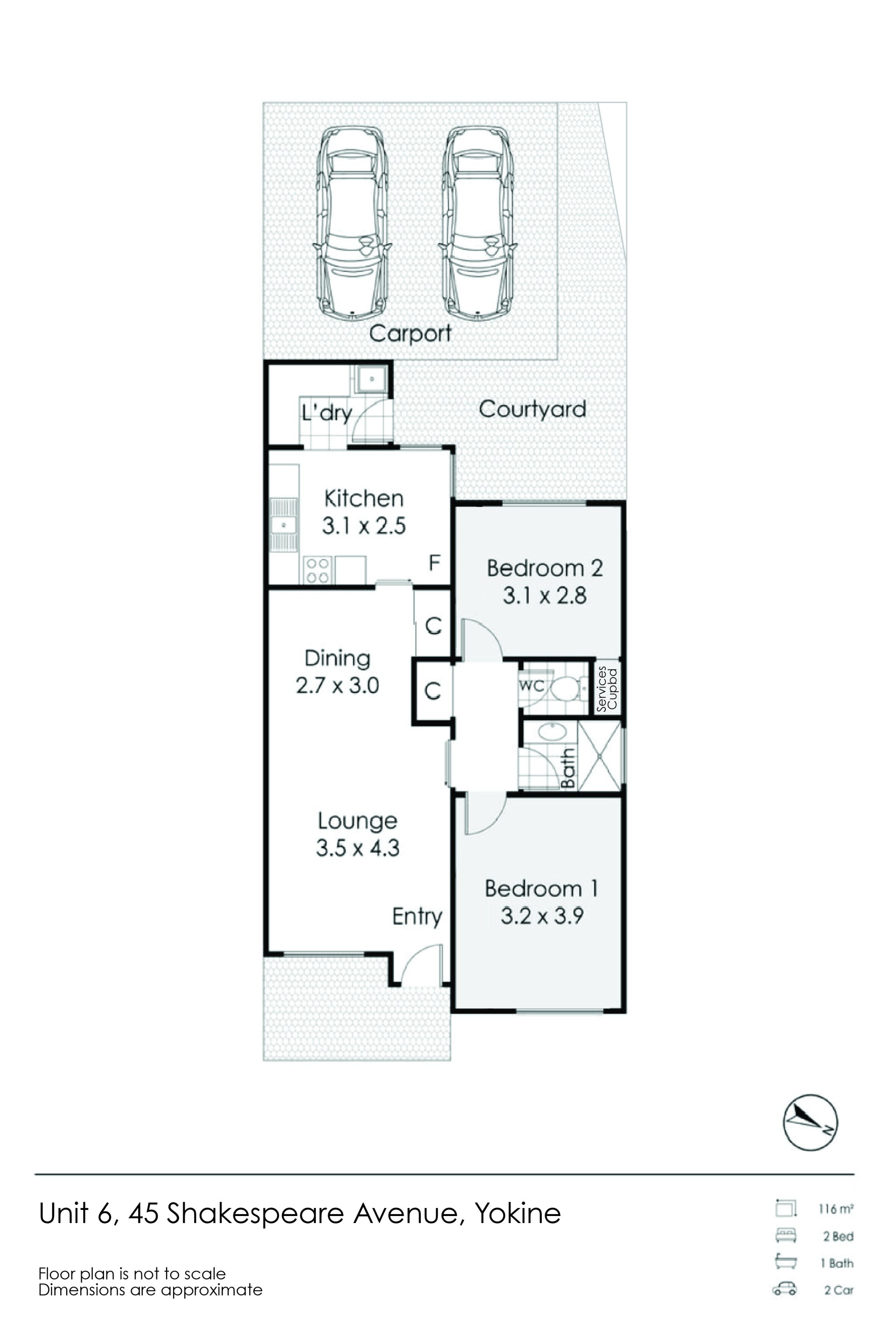 Featuring 2 bedrooms, 1 bathroom, courtyard and parking for 2 cars at the back door.