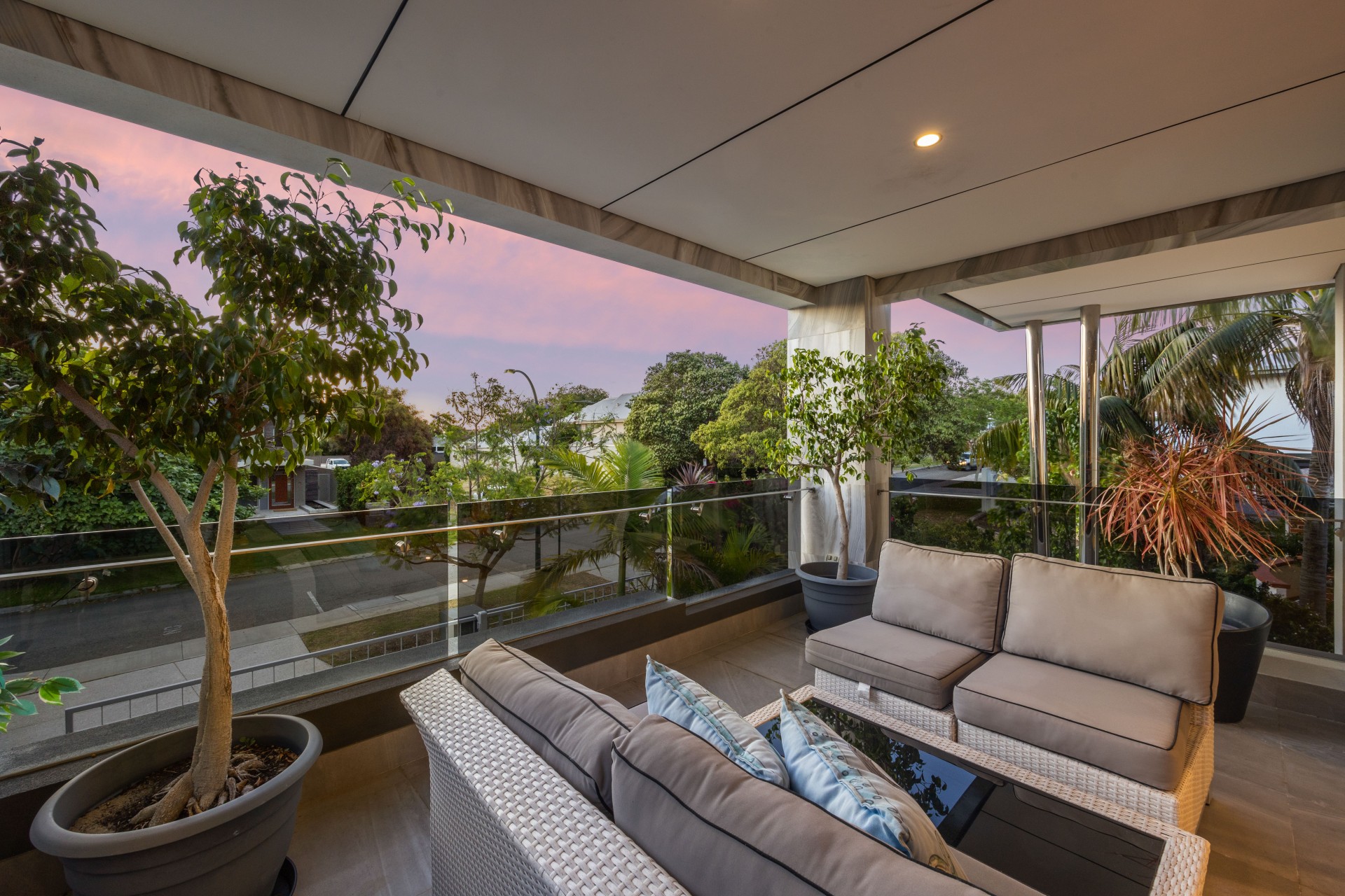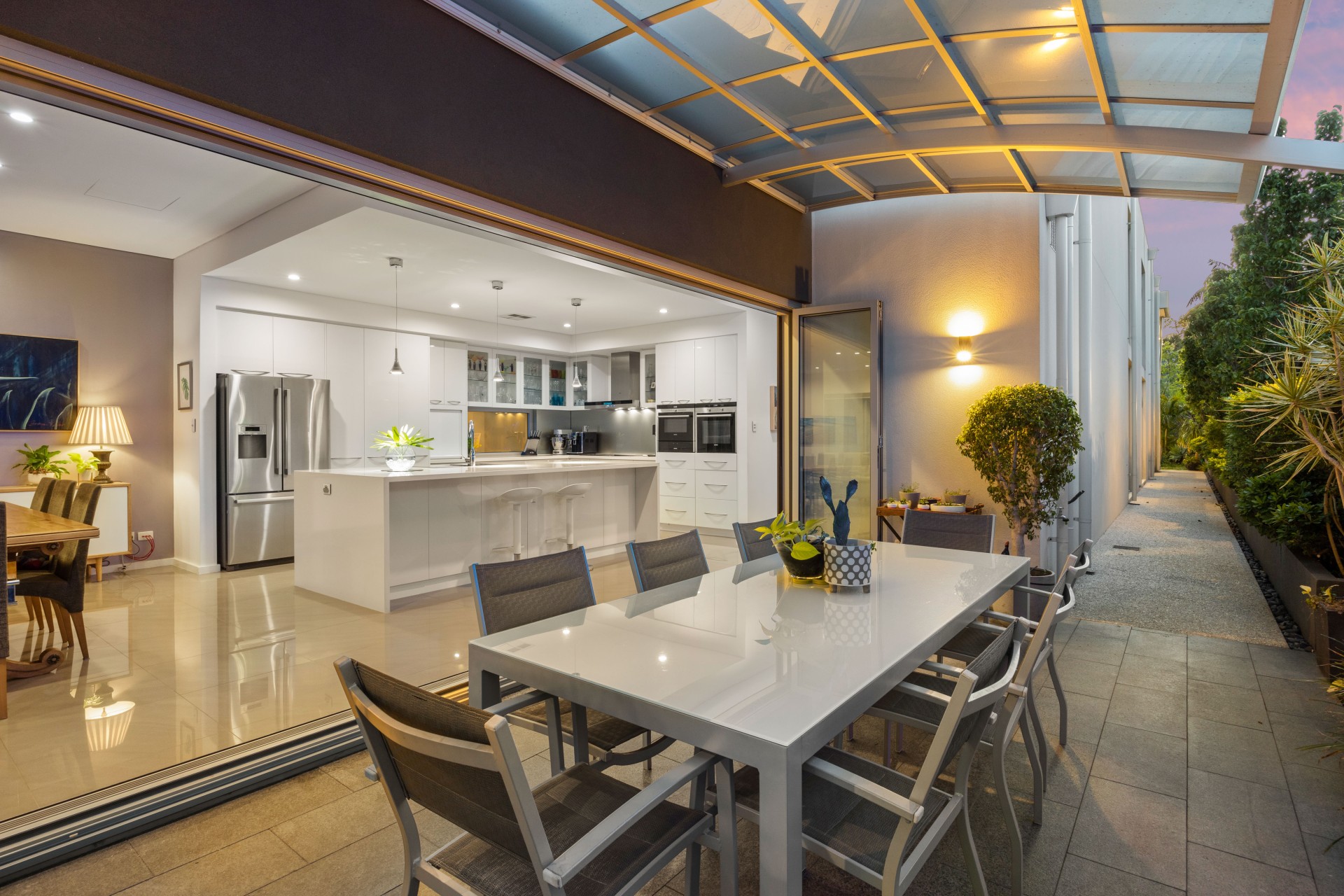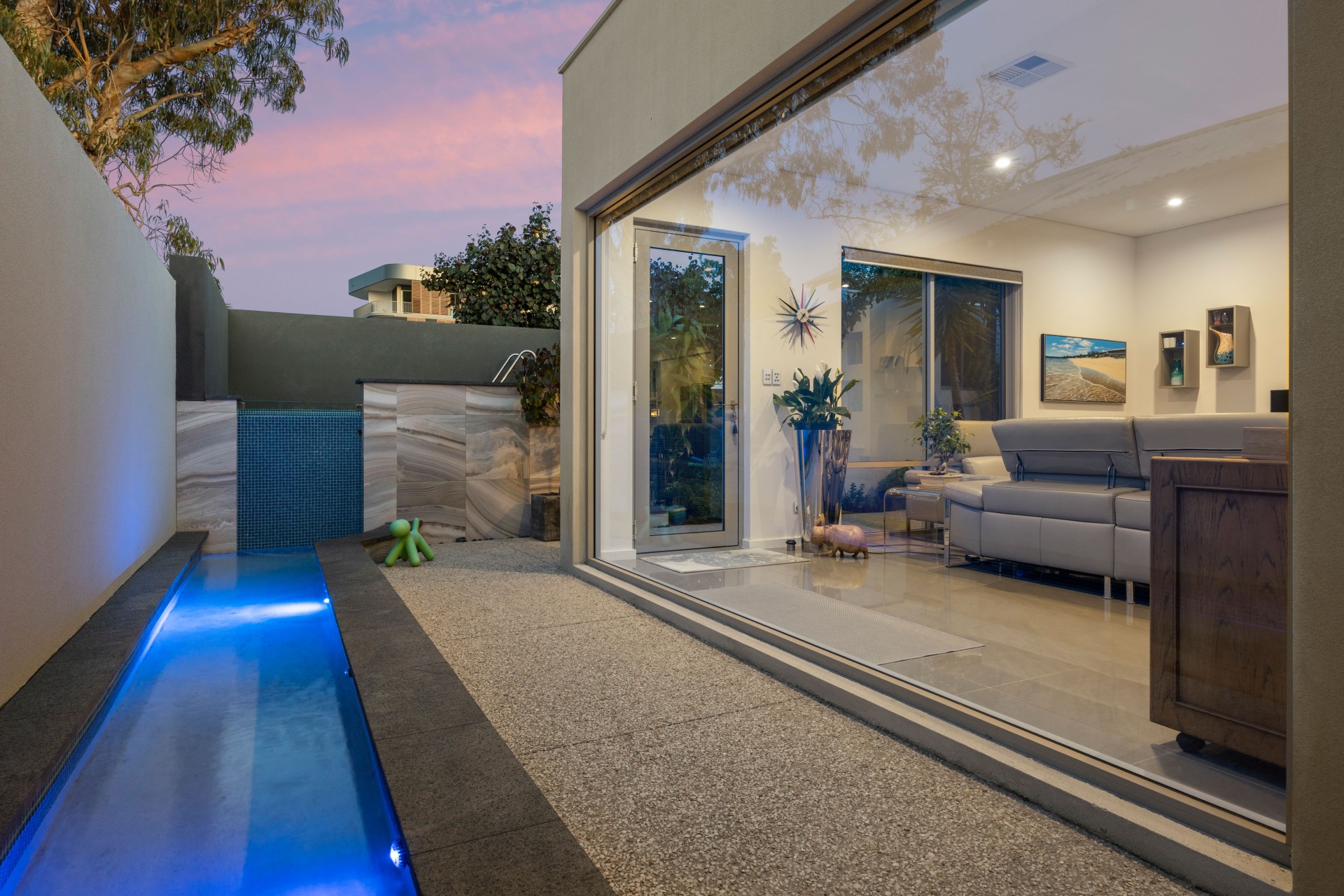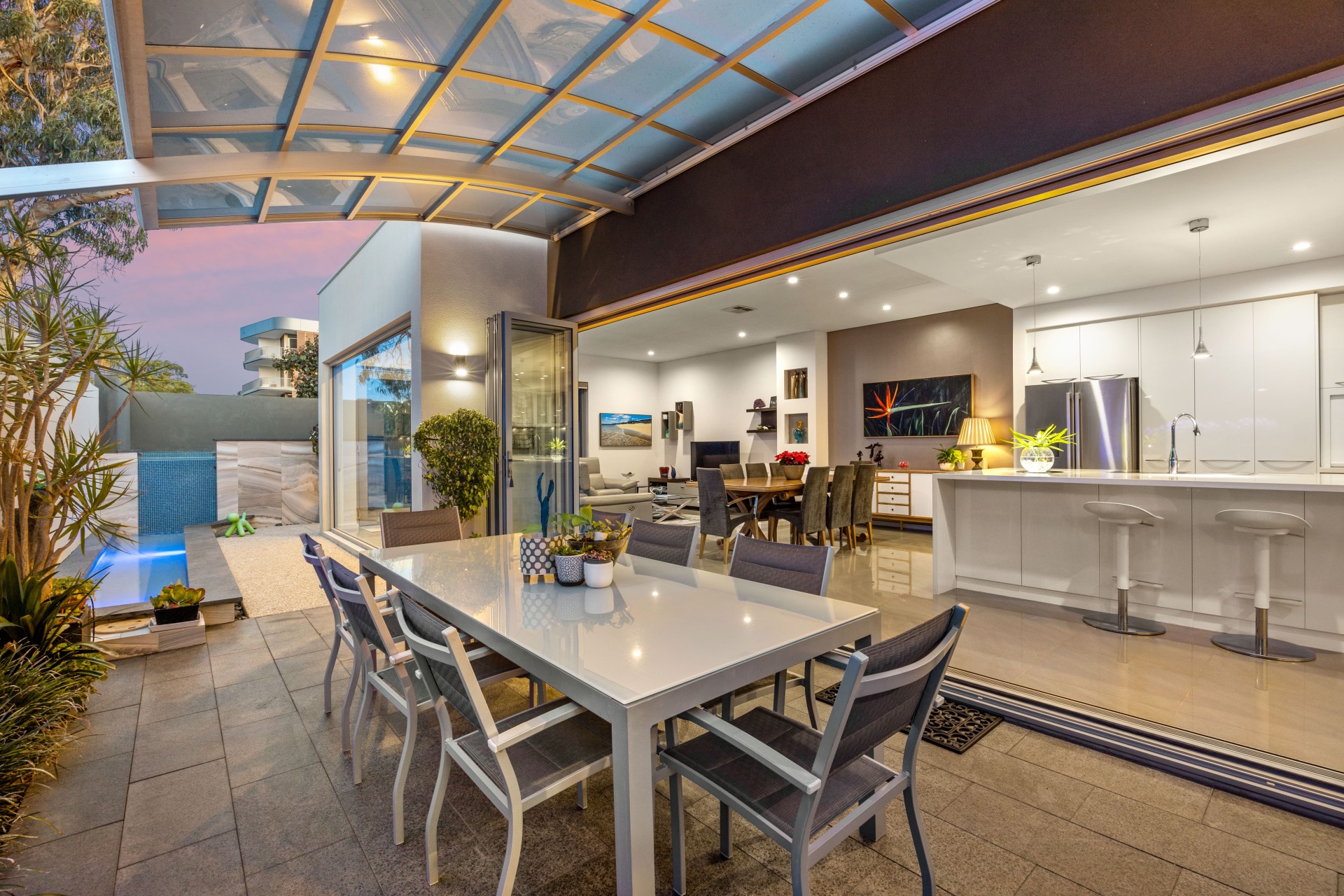 The open-plan kitchen/dining/lounge seamlessly extends to a protected courtyard with a custom-made aluminum pergola and a special 50% UV rays reduction roof. A refreshing plunge pool with a waterfall feature over a decorative pond is seen through the massive lightly tinted Windows. An outdoor shower in a tropical garden completes the functionality of the pool area.