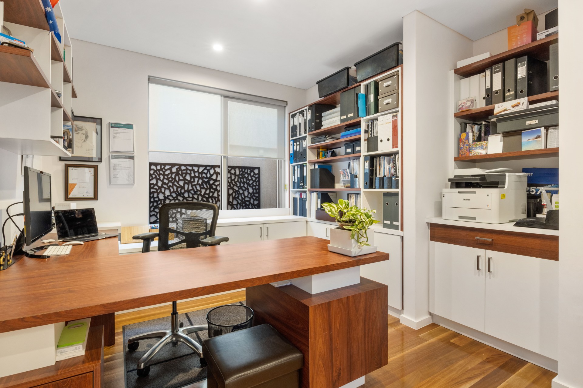 On the ground floor, you'll find a lavish master suite with a KING bed boasting a sprawling walk-in wardrobe, ensuite with 2 showers, and deluxe finishes. An executive home with a fully built-in office/study, laundry with built-in sewing or hobby area, and a powder room further complement the luxurious living space.
