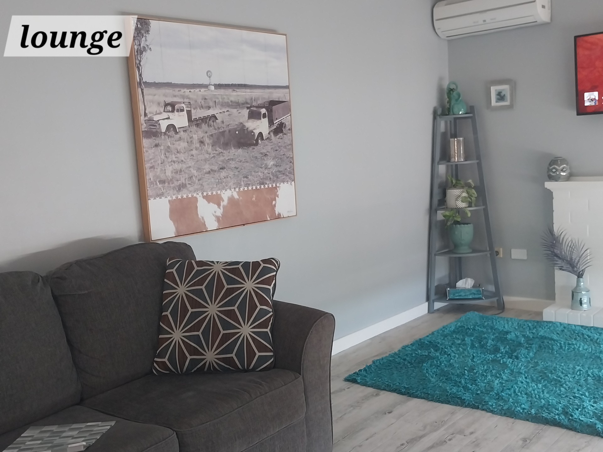 The interior is painted neutral with air con and working fireplace in the lounge. A spacious linen closet in the passageway, double laundry cupboard and built ins in each bedroom offer tons of storage.