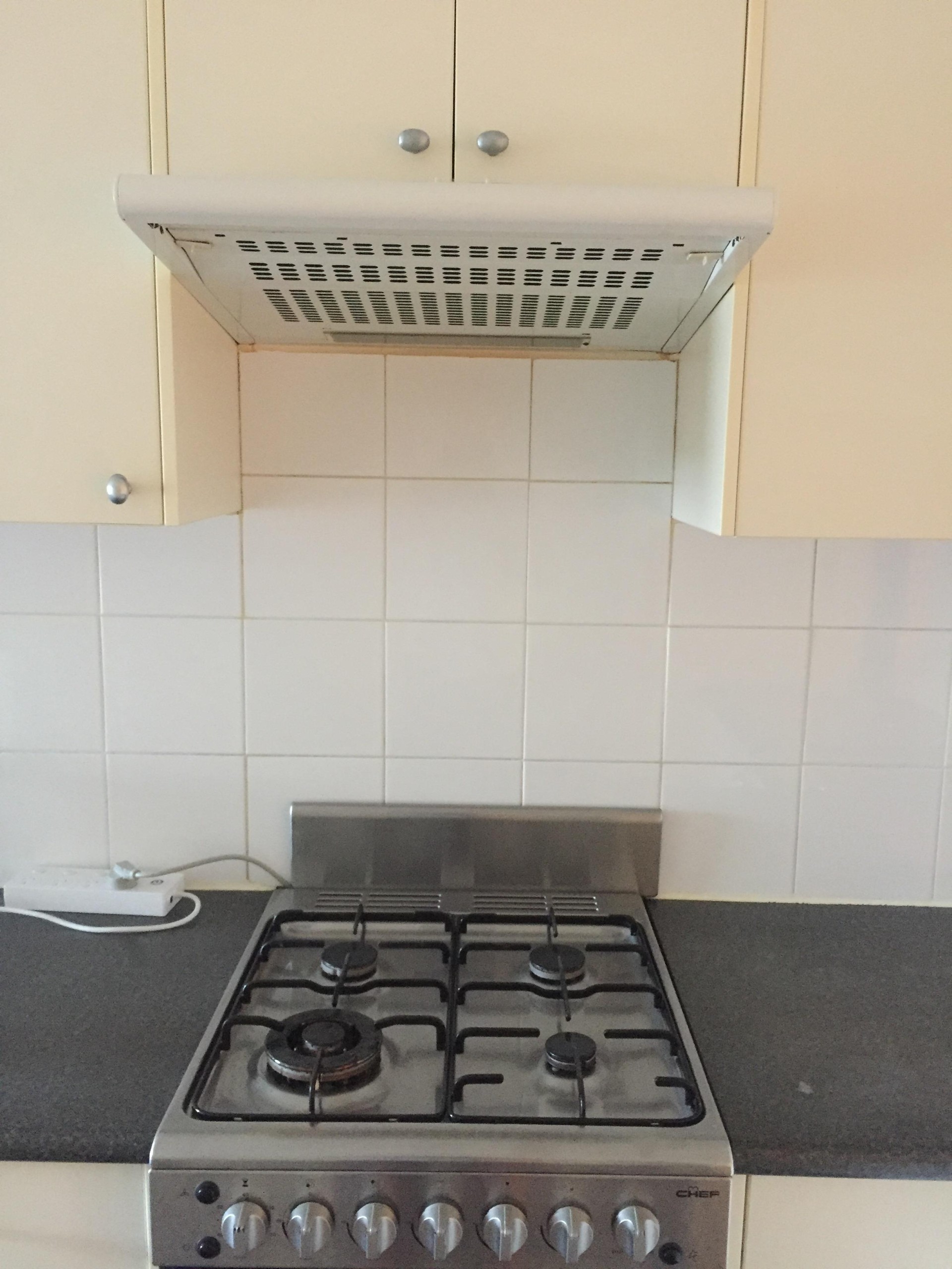 Kitchen has a gas stove with range hood