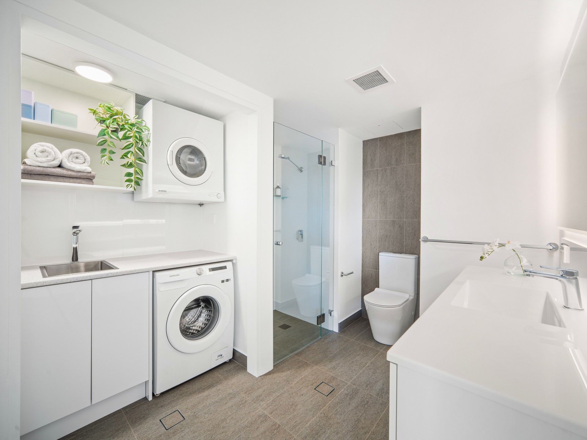 • Stylish, new bathroom with laundry including washer, dryer and large