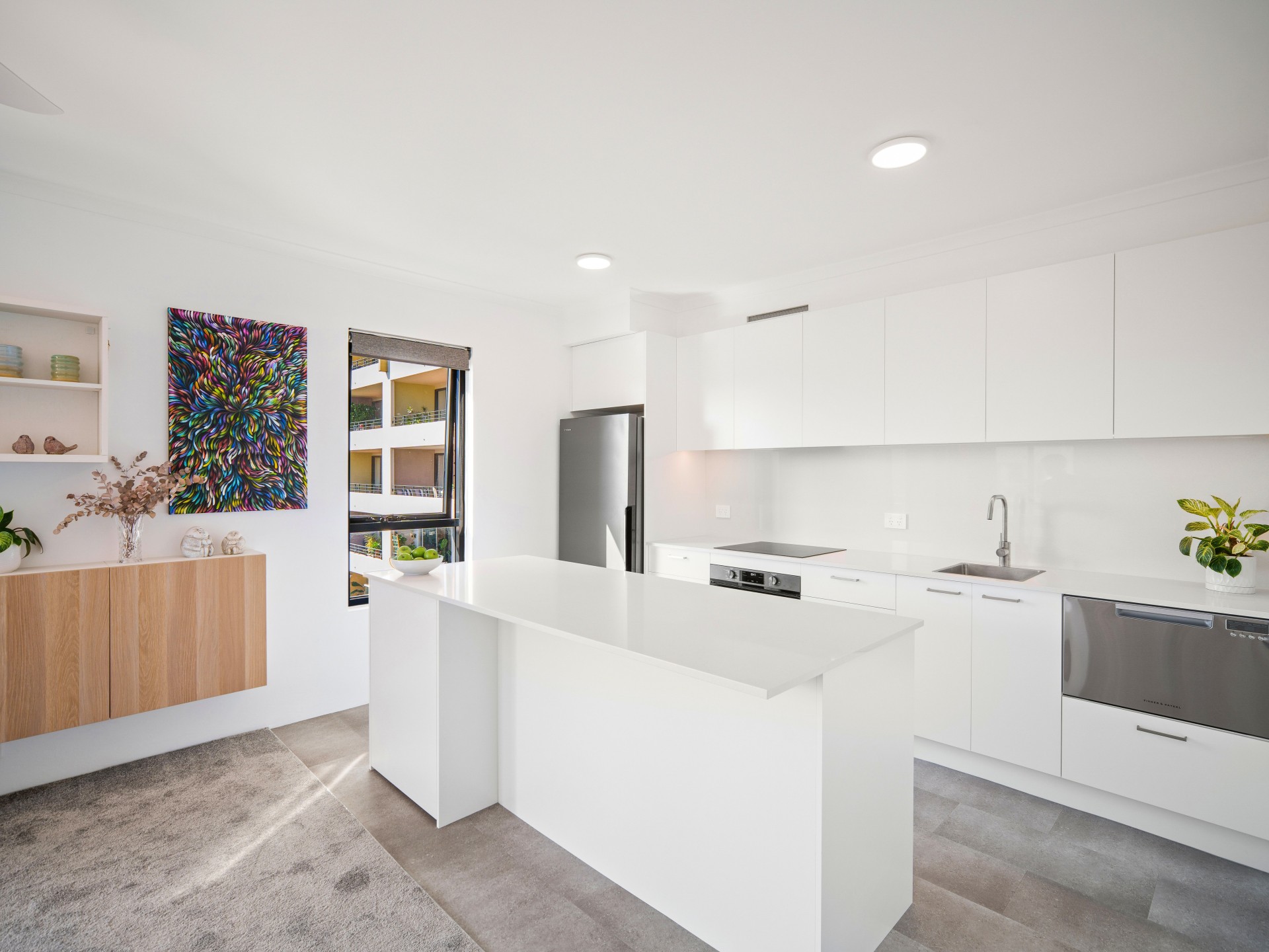 back, induction cooktop, air-fryer oven, drawer dishwasher, fridge