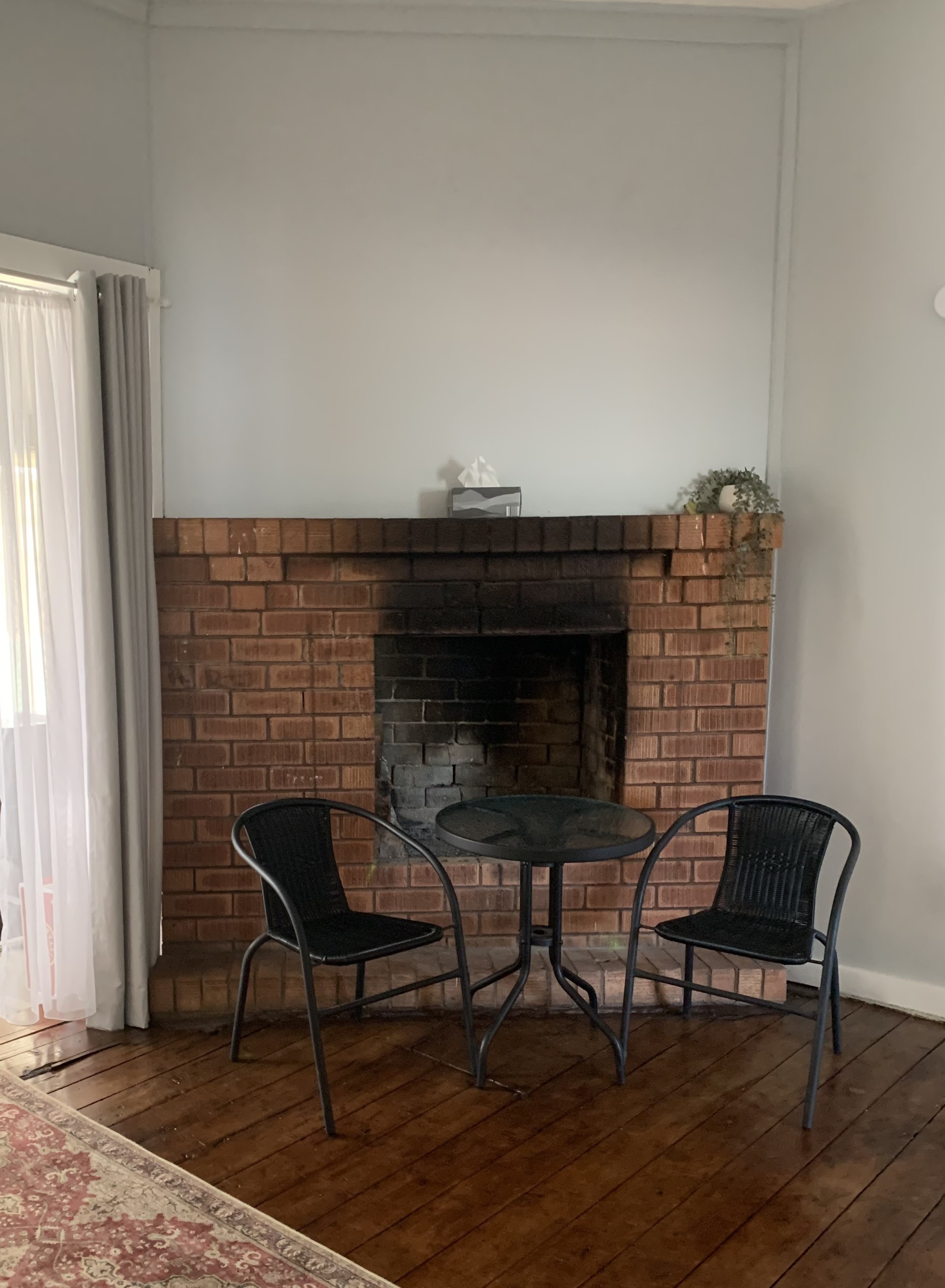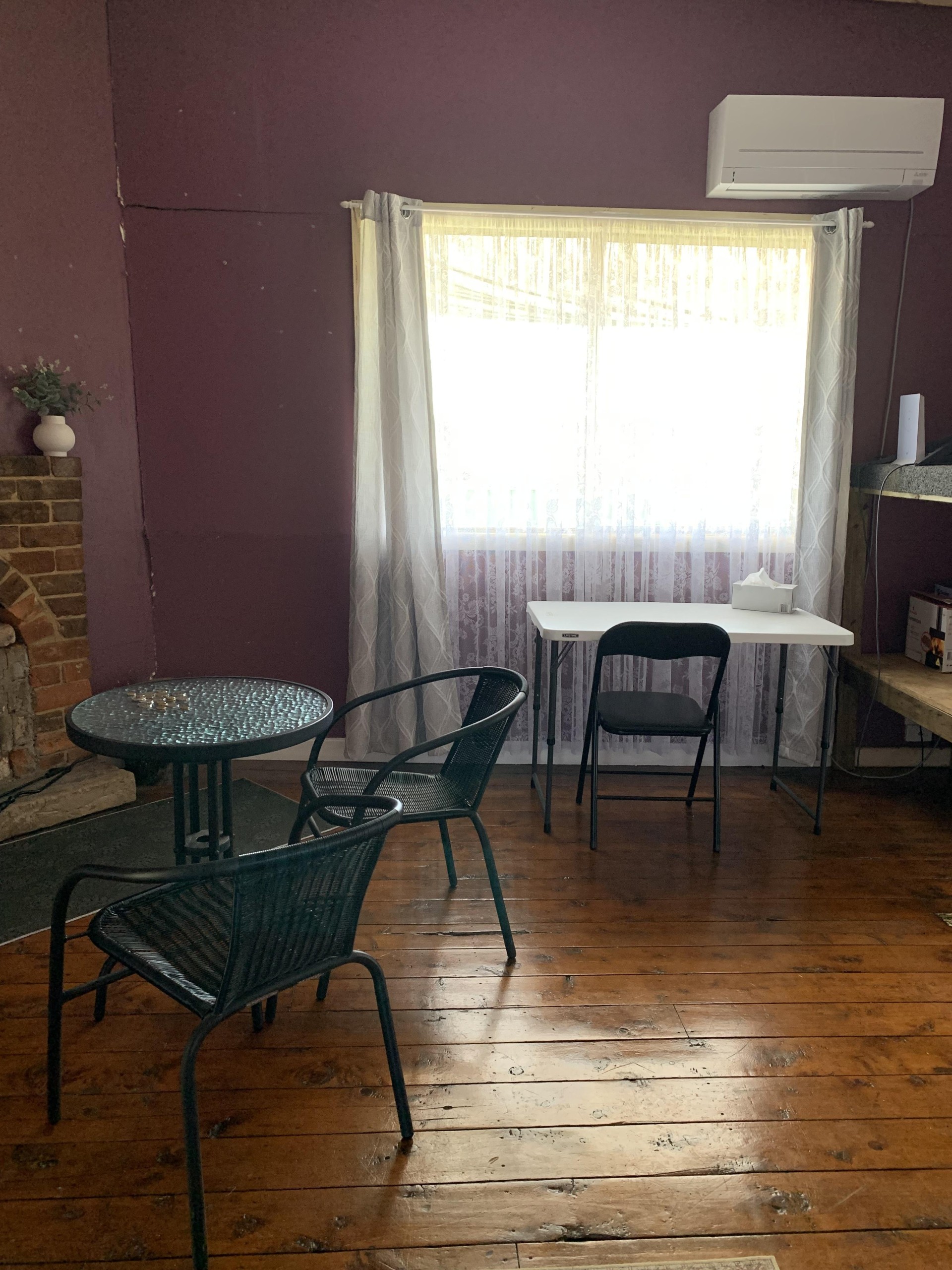 Two large bedrooms, plus another small bedroom or office, partially renovated bathroom, sunny kitchen with dining area, lounge room with open fire and sitting/living room with another fire, split systems in the main bedroom and also in the lounge room.