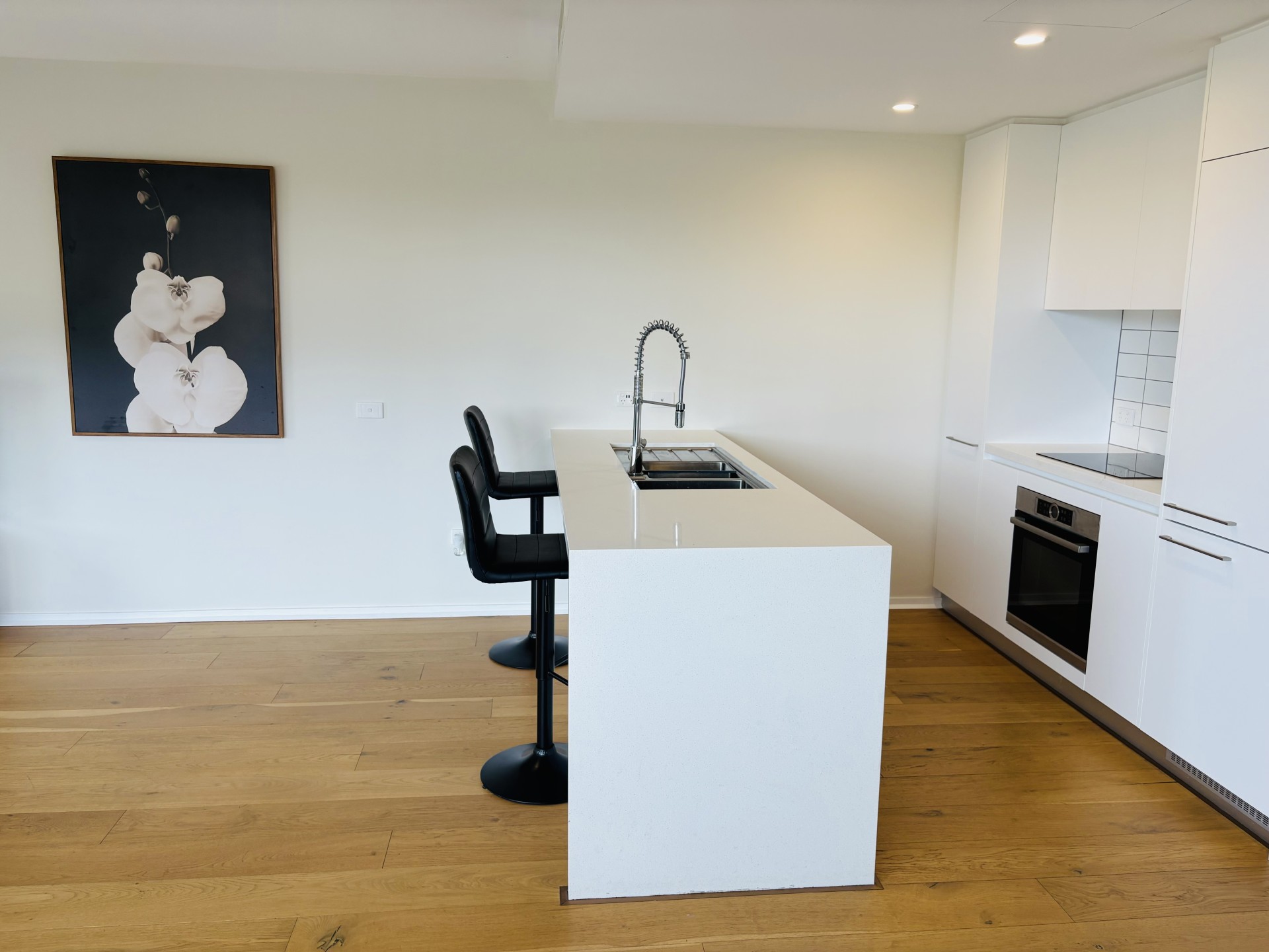 The compact modern fitted kitchen includes an integrated fridge/freezer & dishwasher, electric oven & induction cooktop with 2.8m meter bench top (1.5 sink plus drainer), a microwave and plenty of drawers and cupboard space.