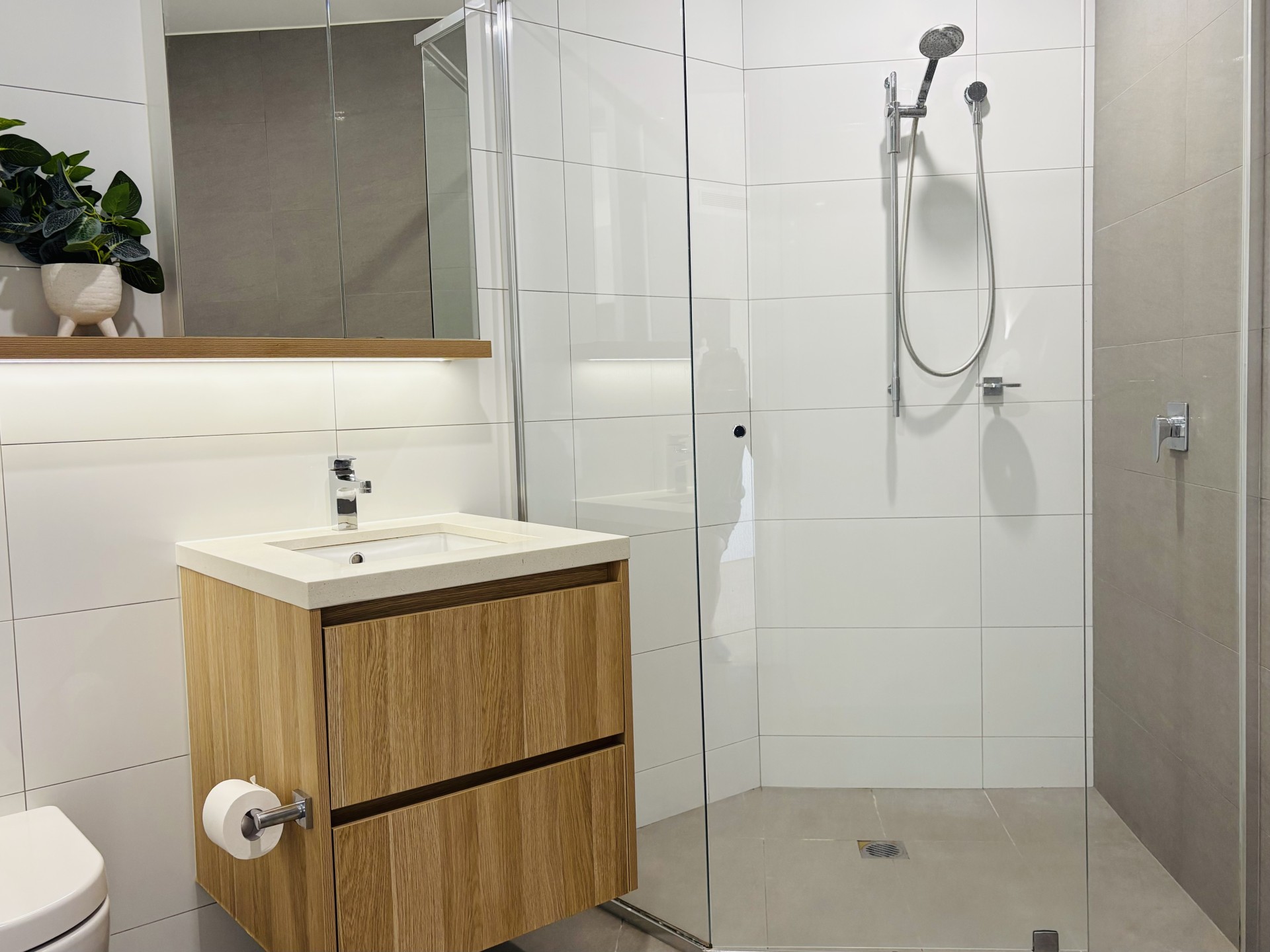 The fully tiled bathroom has a large shower, vanity and a mirrored shaving cabinet.