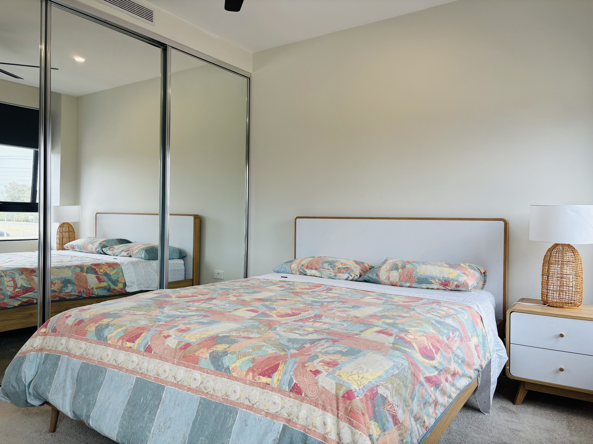 Bed 1 comfortably fits a Queen bed and two bedside tables and has a large (full wall in length ) mirrored robe which includes drawers.