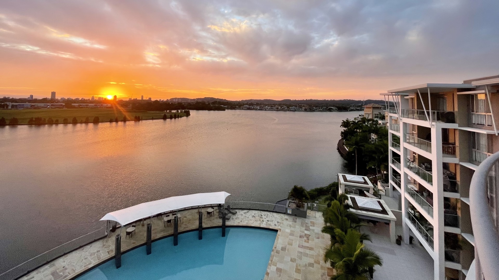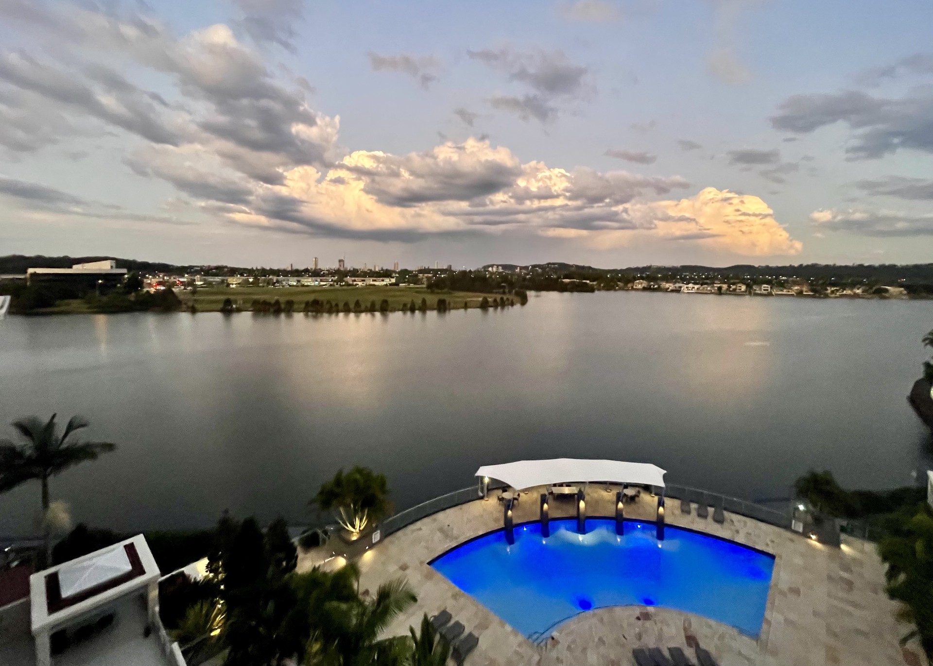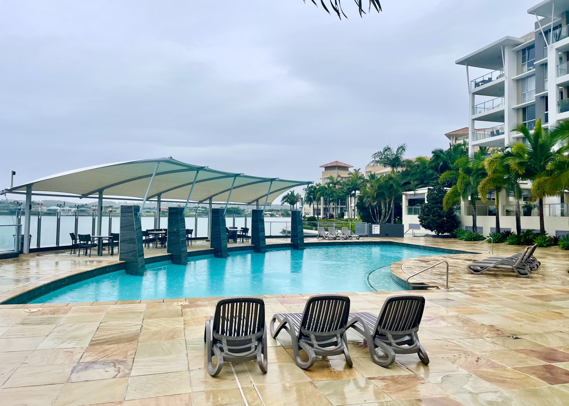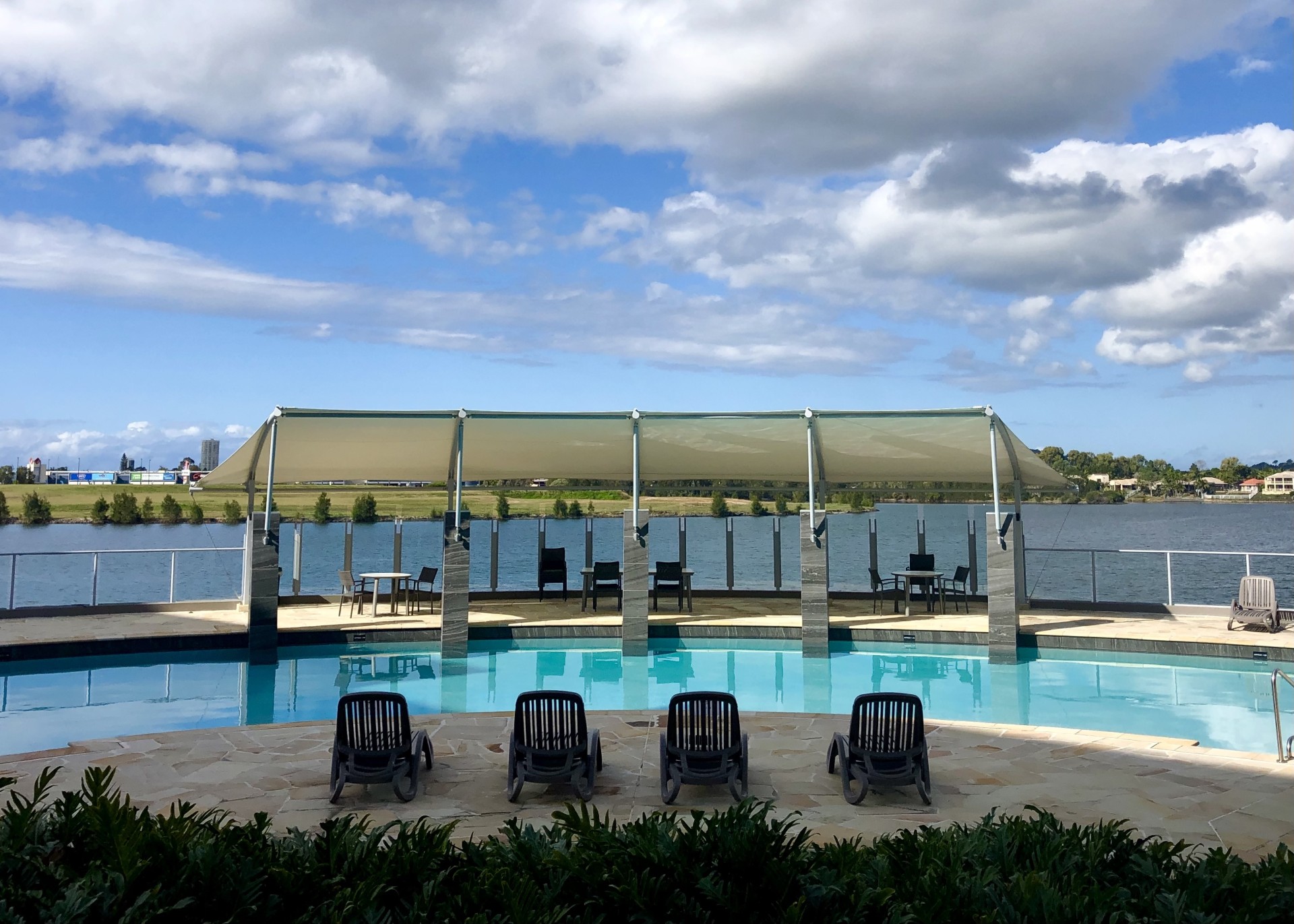 -large complex pool overlooking Lake Orr with undercover seating and bbq area
