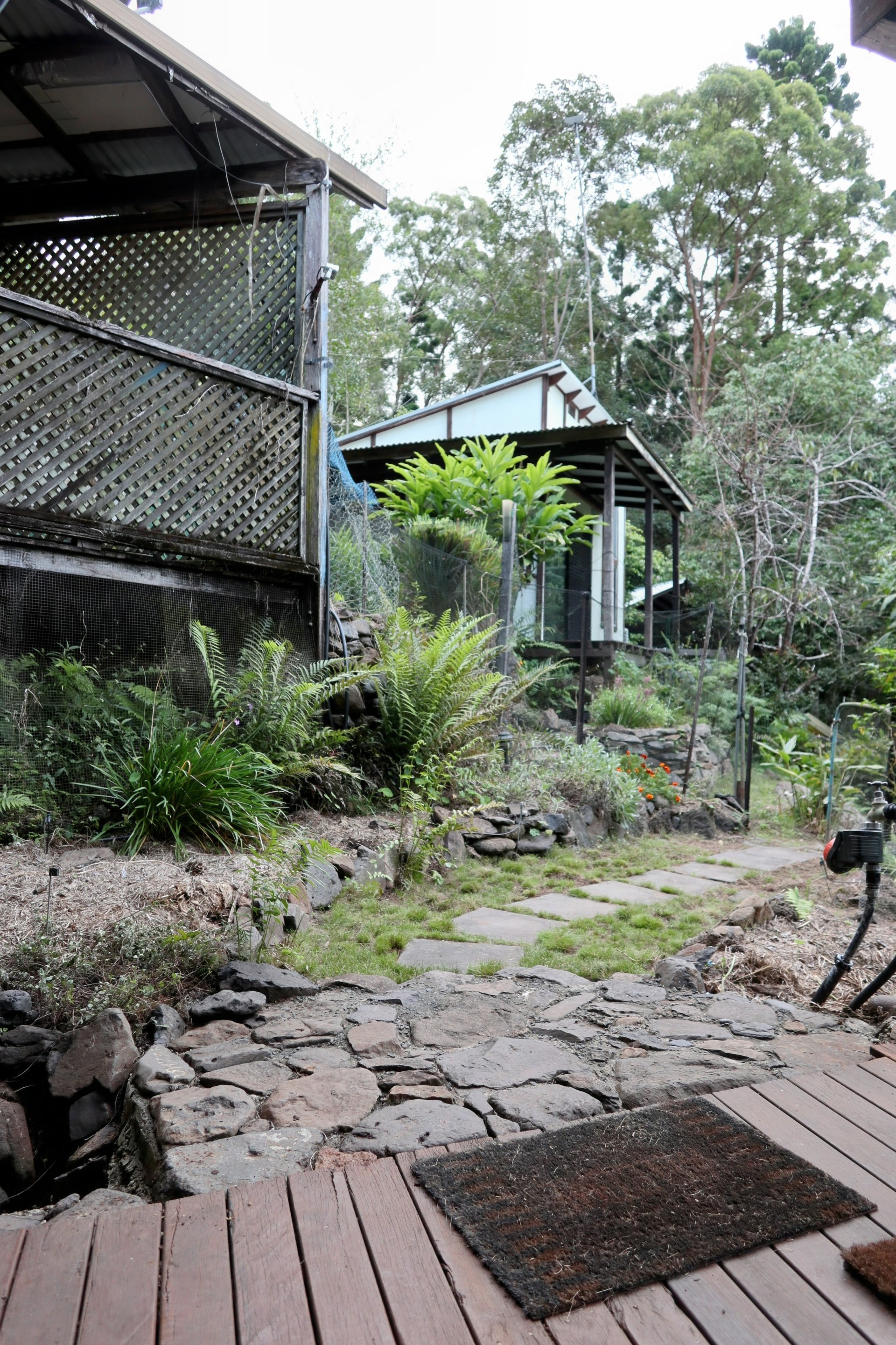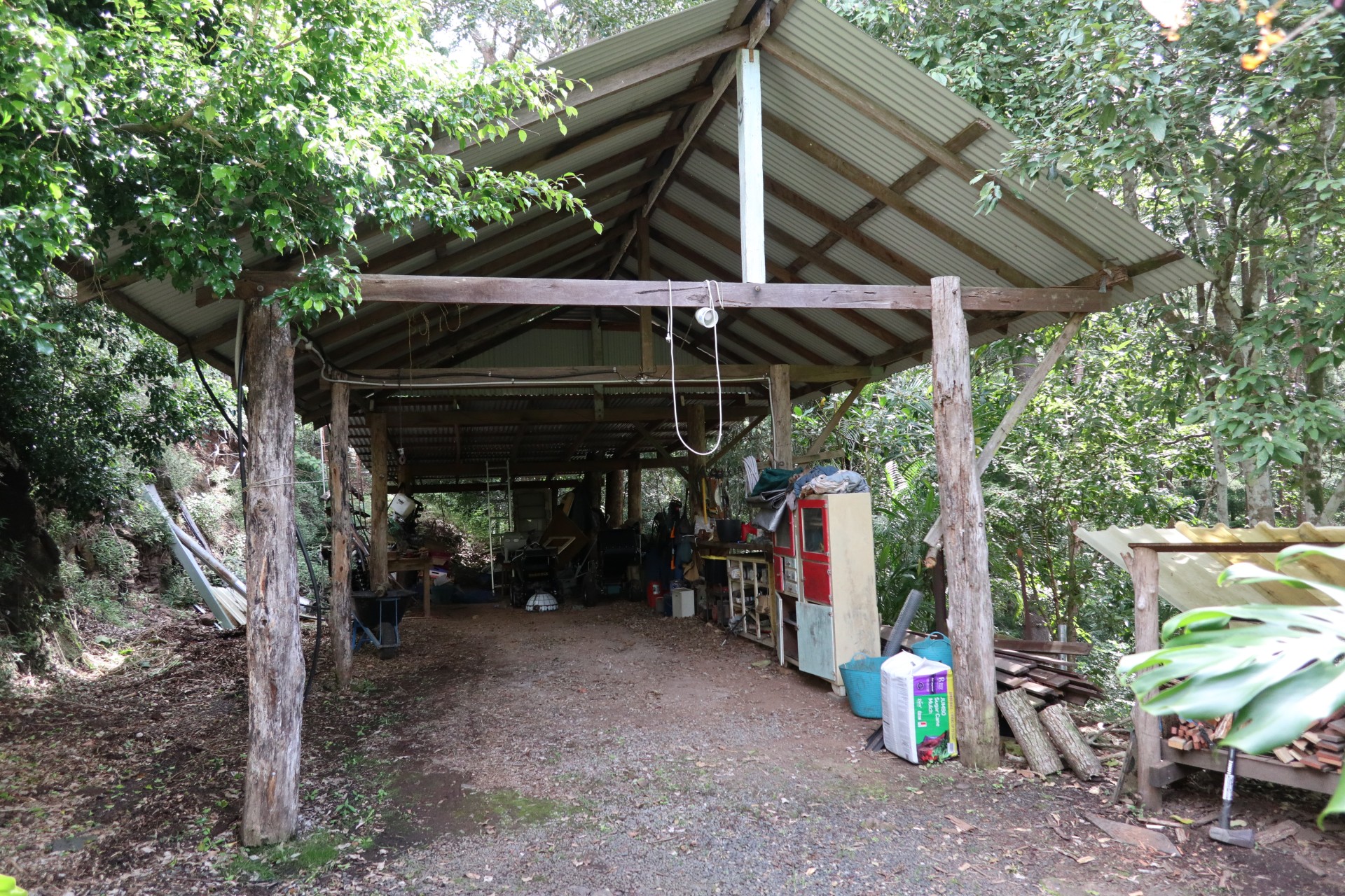 The property features a huge deck looking over the rainforest, two original council approved hexagons, a sleep out, studio and large carport/workshop. Water is supplied by two spring fed 25,000 litre tanks, and there is a full off-grid solar system with 21 KWhrs of battery storage and a fire bunker.