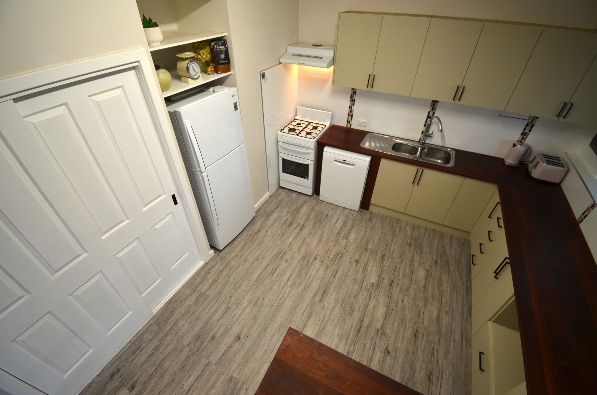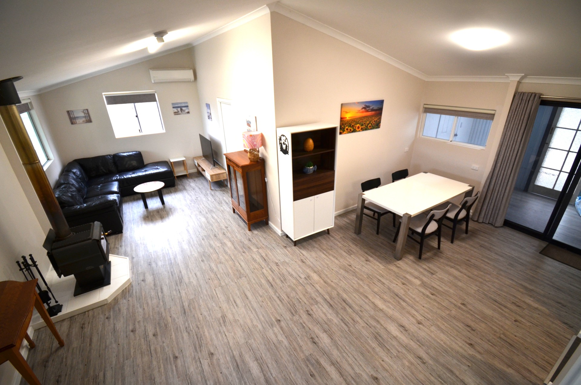 Step inside and be greeted by the raked ceilings and open-plan living, dining and kitchen areas allowing natural light to flood the space, accentuating the warm feeling of the cozy fireplace. The kitchen features timber benchtops, soft-close drawers, and a new Bosch dishwasher. The double sink is equipped with a pull-out sink mixer tap and complements the ample bench and storage space available.