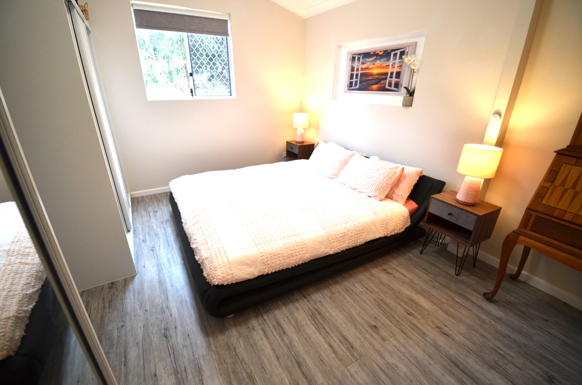 The newly renovated bathroom, laundry and toilet areas boast floor-to-ceiling tiles, adding a touch of elegance to the home. The main bedroom offers plenty of space for a king size bed and furniture with two built in robes with the second bedroom being perfect for children or guests. The office is in the rear section of the garage next to the large storage room. The opportunities for expansion here are endless.