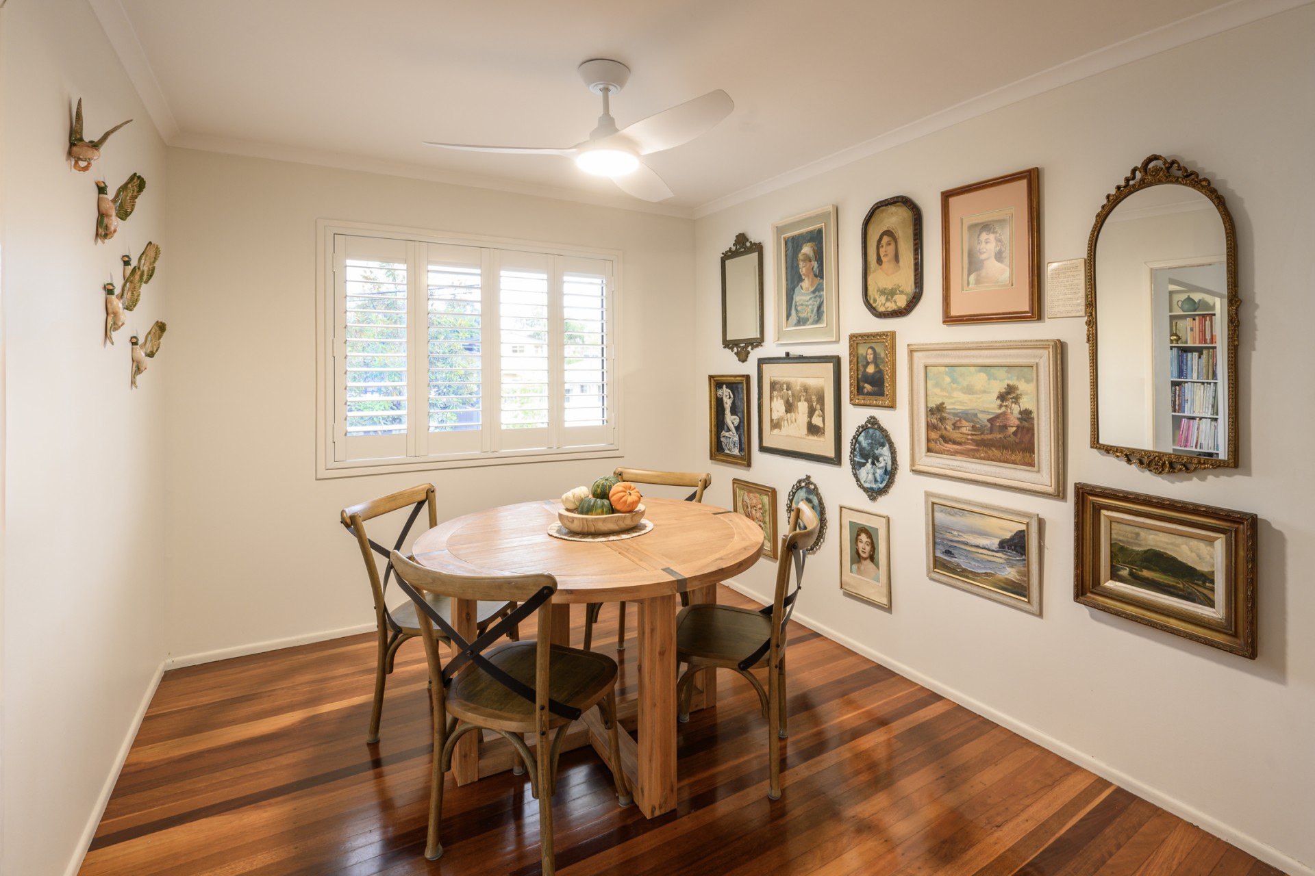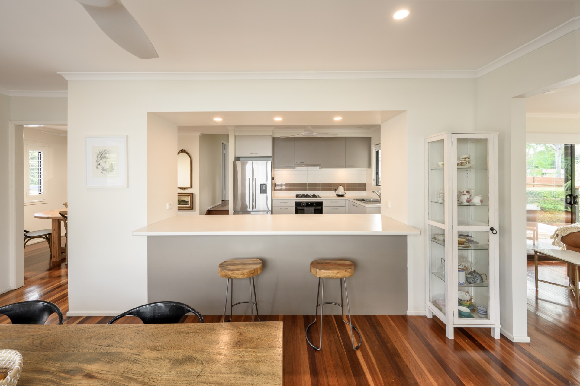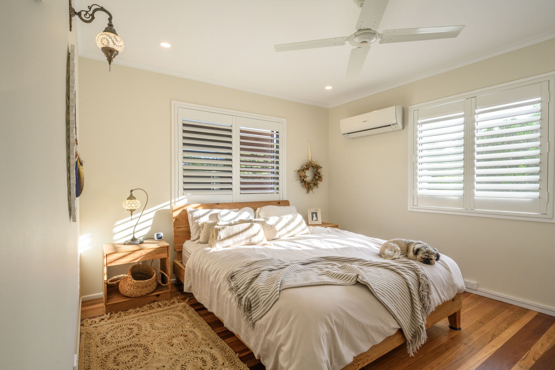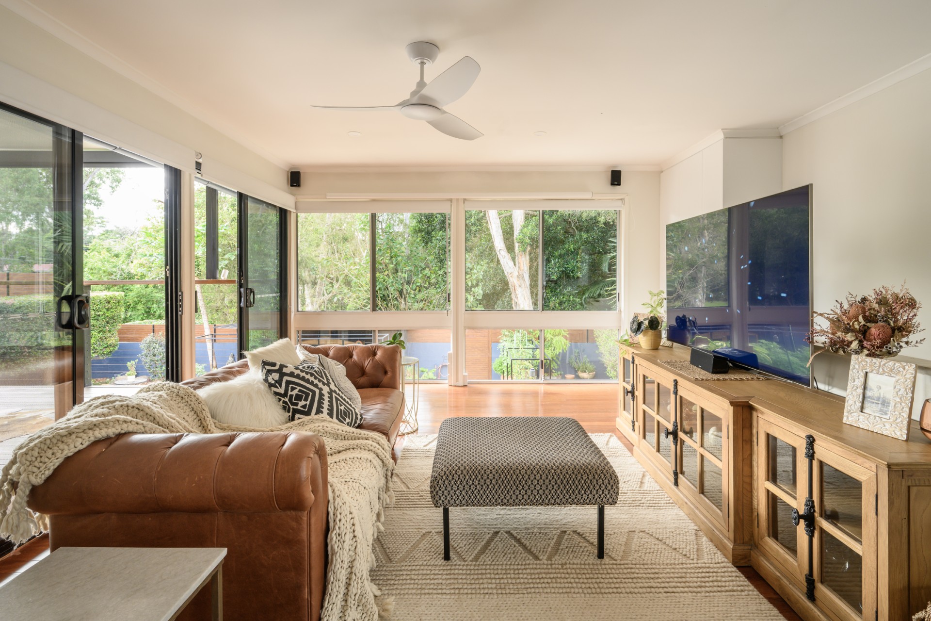 The bedroom wing features three bedrooms adorned with box brush floors, sliding wardrobes, and a newly renovated toilet and wet room bathroom with double sinks, rain shower, and a luxurious bath.