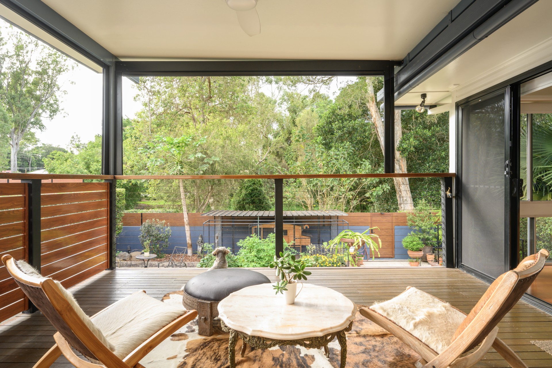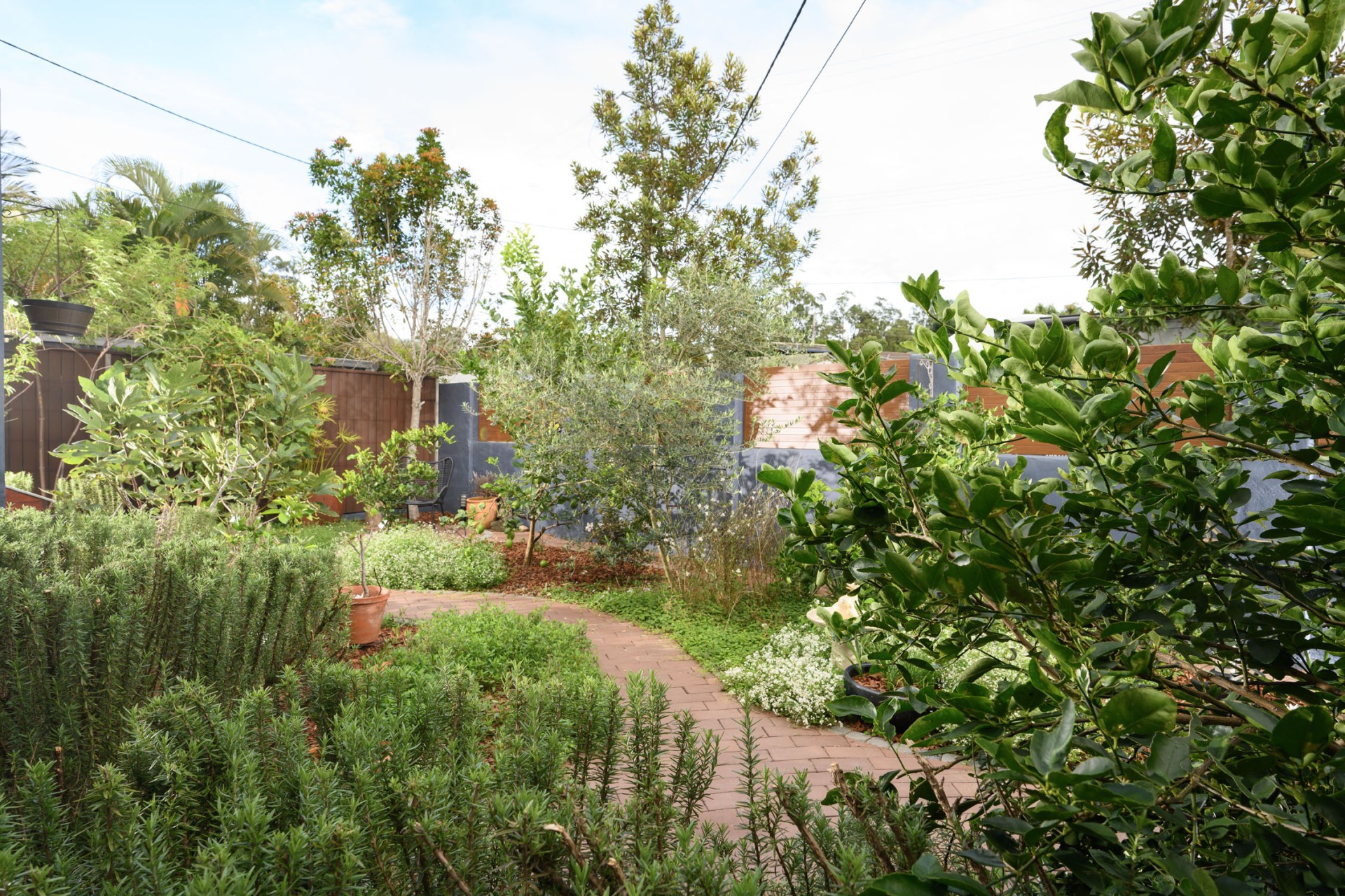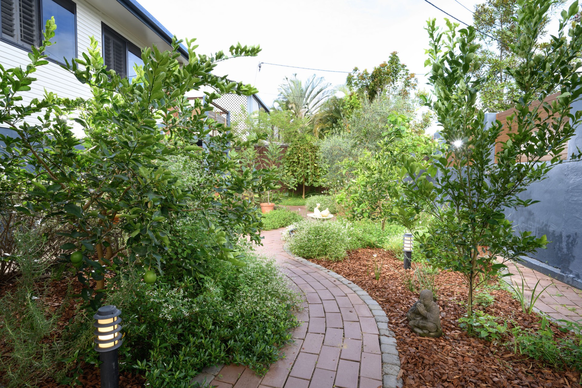 Upon arrival, you'll be greeted by state-of-the-art, low-maintenance fencing featuring an automatic driveway gate and keypad personal gate. The front garden sets a serene tone with its organic edible cottage garden, showcasing an assortment of citrus, olive, fig, mulberry, and elderberry trees, along with herbs and perennials to attract pollinators. A tranquil sitting area under the shade of a tree invites relaxation beside a trickling water bowl.