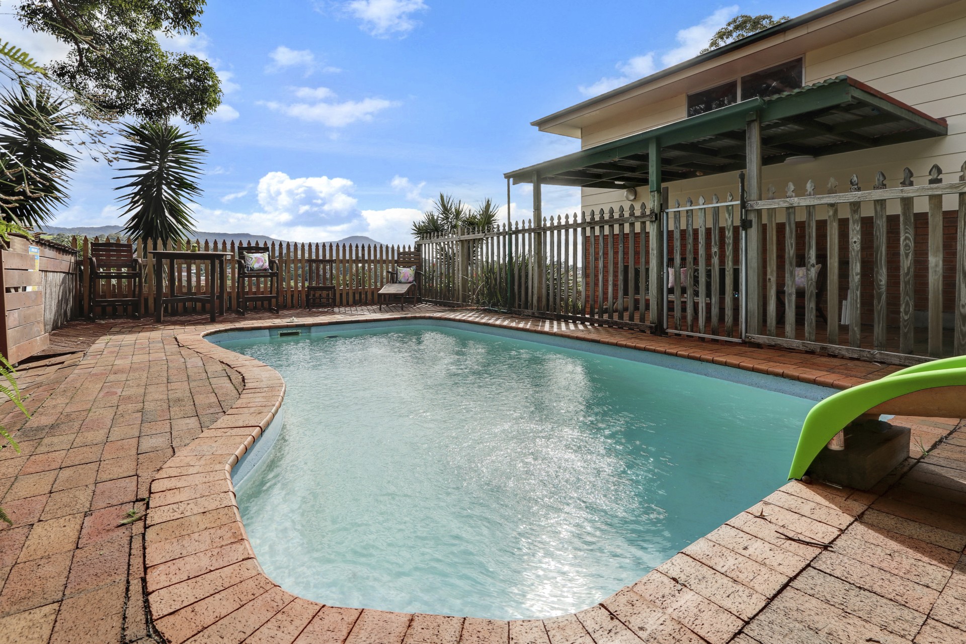 Private backyard with swimming pool and covered BBQ area.