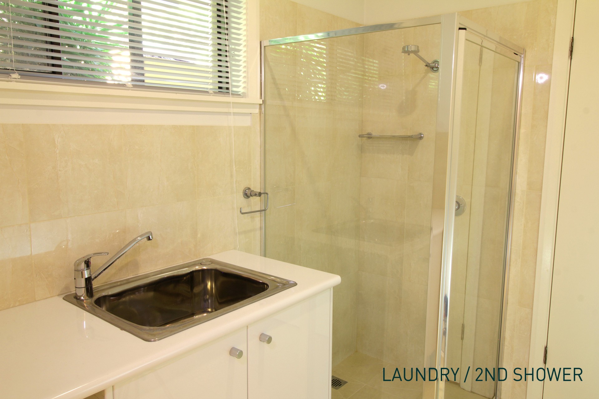 • One bathroom with bath and shower connects to a toilet as well as the laundry area featuring a second shower. This space also incorporates ample built-ins.