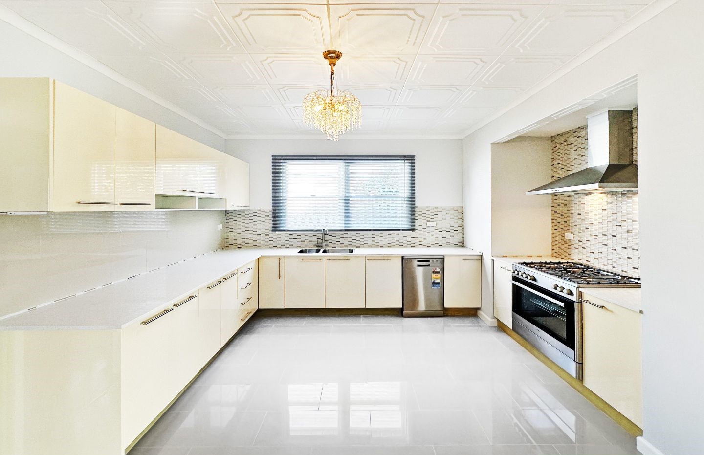 A formal living area includes a solid brass chandelier and new fireplace ready for cosying up on cooler evenings and the kitchen and meals area features brand new appliances including a gas cooktop oven and dishwasher, and an impressive, authentic crystal chandelier. Meal prep is made easier with loads of bench and cupboard space and tiled splashback.