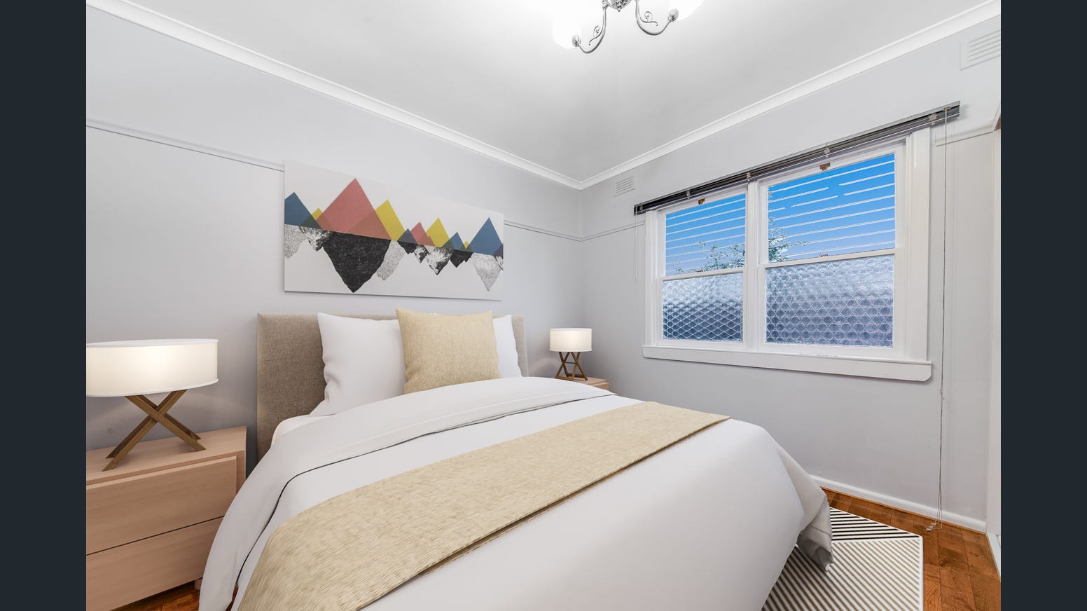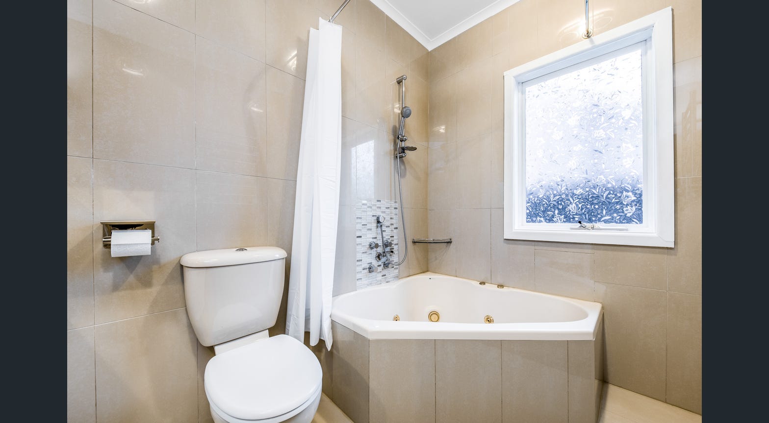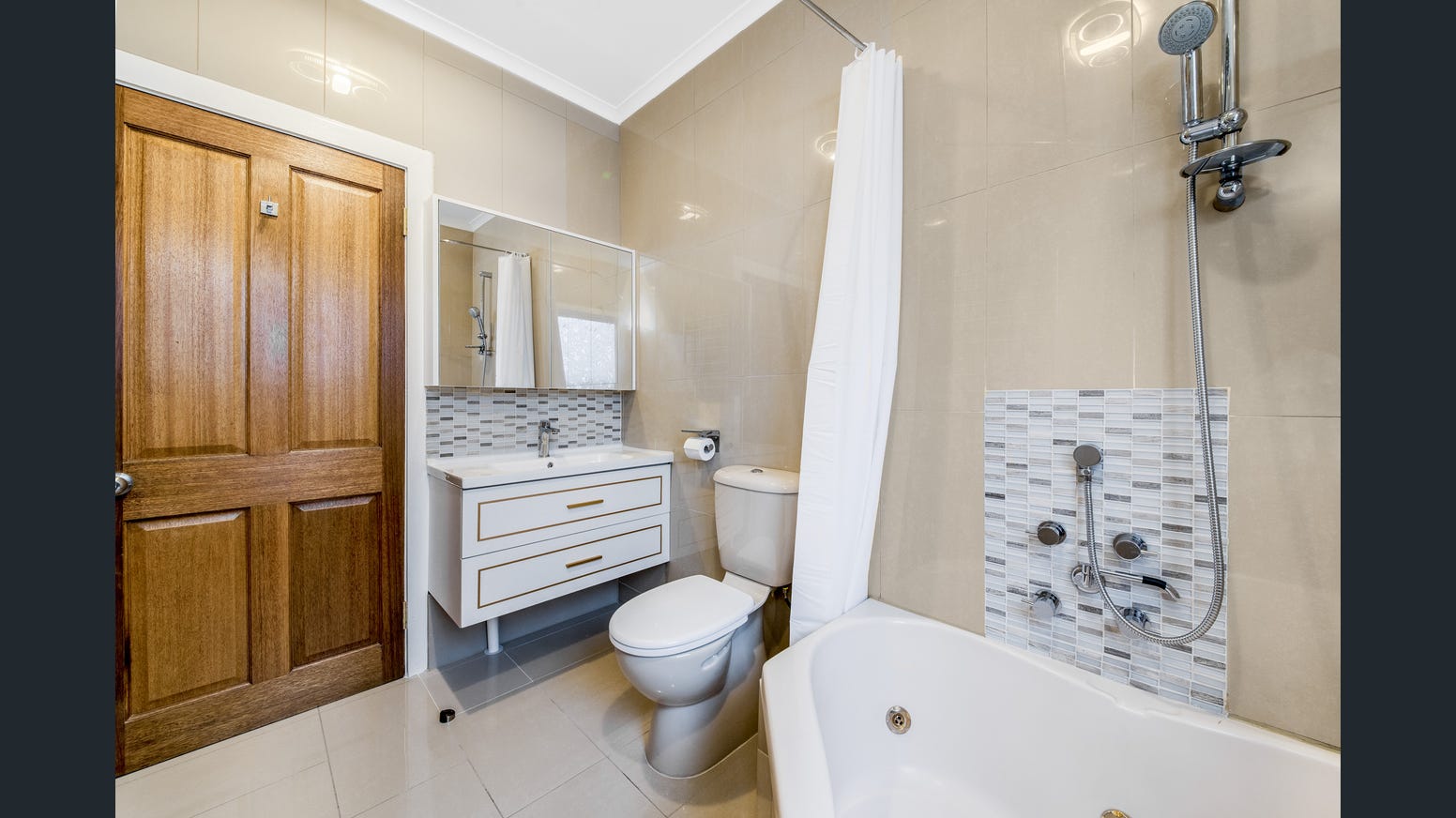 Bedrooms also include decorative brass chandelier lighting and a central, fully-tiled family bathroom includes a corner spa bath for a relaxing soak after a long day. A combined, fully-tiled laundry and the second bathroom include a shower and extra under-vanity storage.