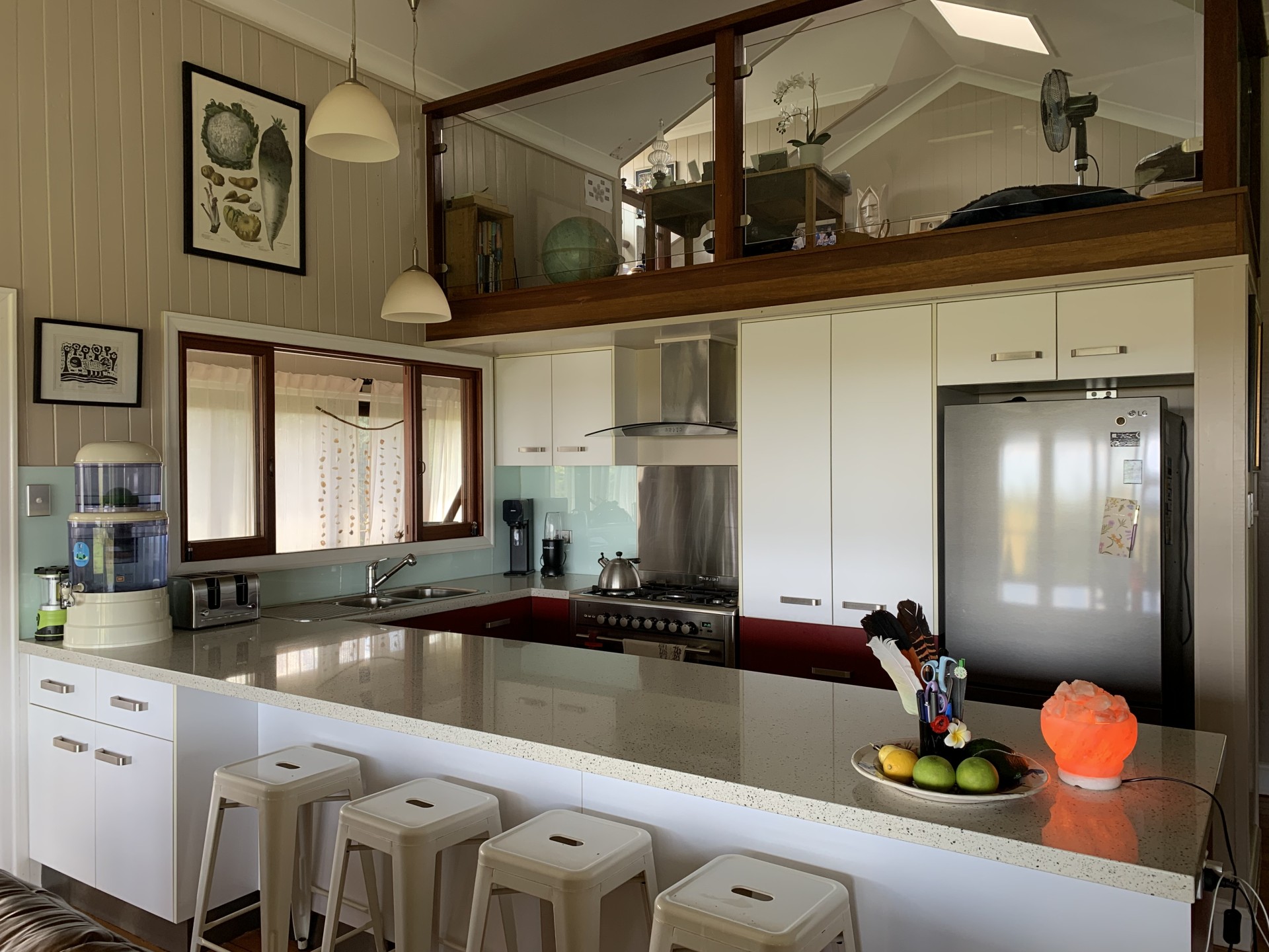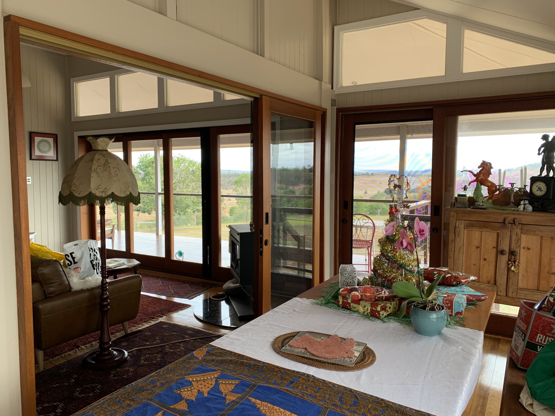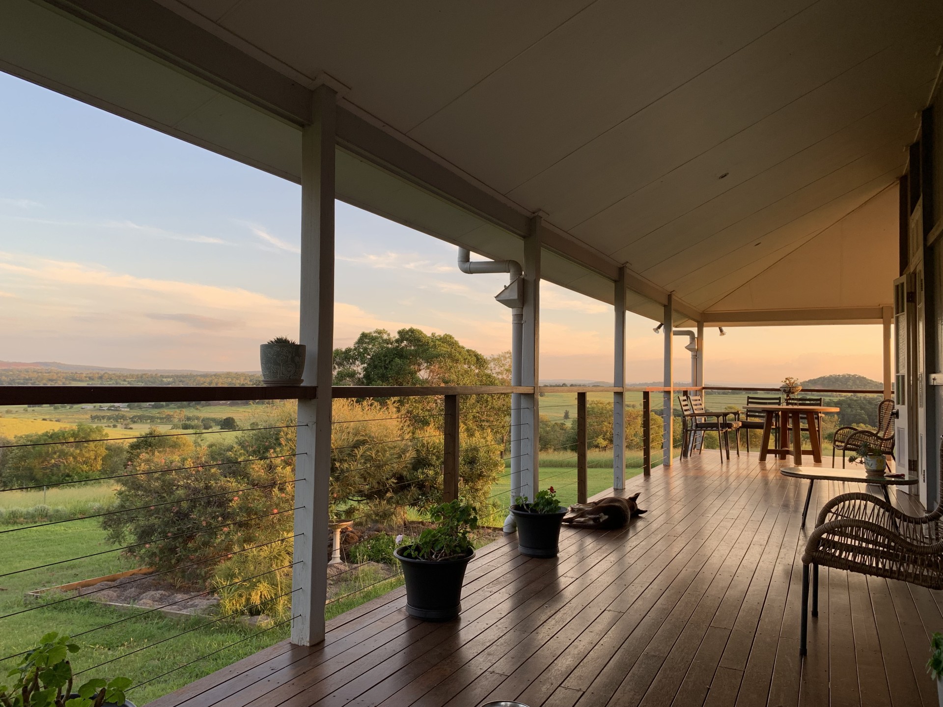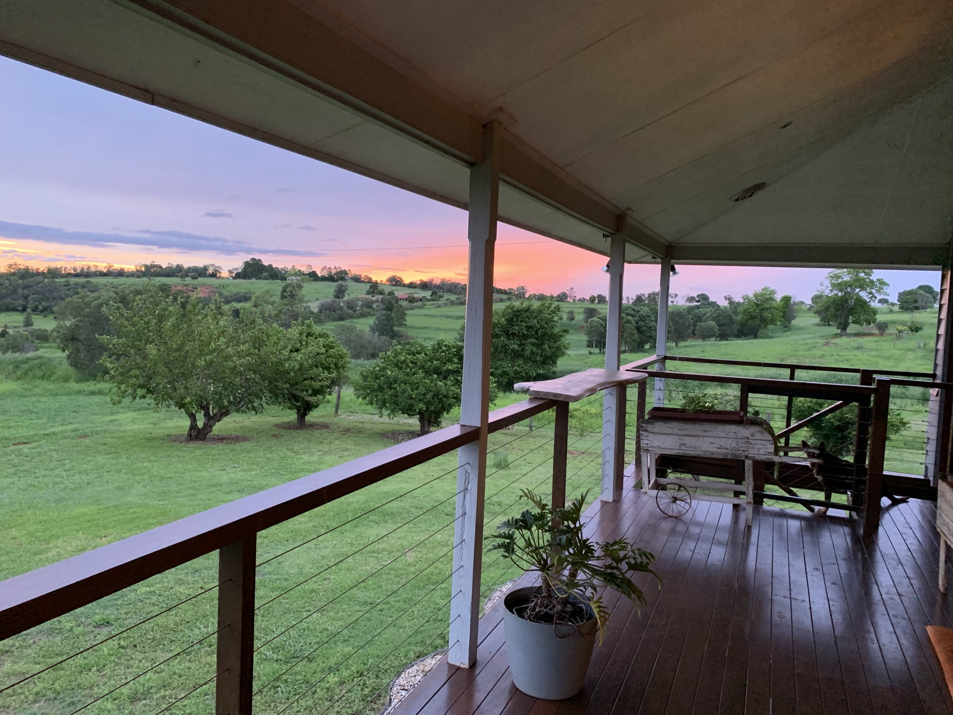 The original farmhouse (built circa 1910) has been exquisitely renovated and consists of original timber flooring, spacious master bedroom with ensuite and built-in robes, 2 queen sized bedrooms, a unique loft-style office/studio space, fireplace, family bathroom, open plan kitchen with dishwasher and 5-burner stove with bi-energy oven (gas and electric). The original 12-foot ceilings have been raked to the roofline creating an unforgettable sense of space and atmosphere. Fans throughout and split system air conditioning in the lounge/dining, master and one bedroom. Wide verandas on 3 sides and spectacular rural views from every room. Enclosed downstairs utility room is very spacious and combines laundry and additional built-in storage. House is connected to 3 rainwater tanks with a first flush system, collectively providing 60,000 litres water storage. The farmhouse boasts an established orchard with lime, lemon, orange, mandarin, grapefruit, cumquat, mulberry, jaboticaba, and bowen mango. There is also a 6m x 3m greenhouse with 4 raised garden beds.