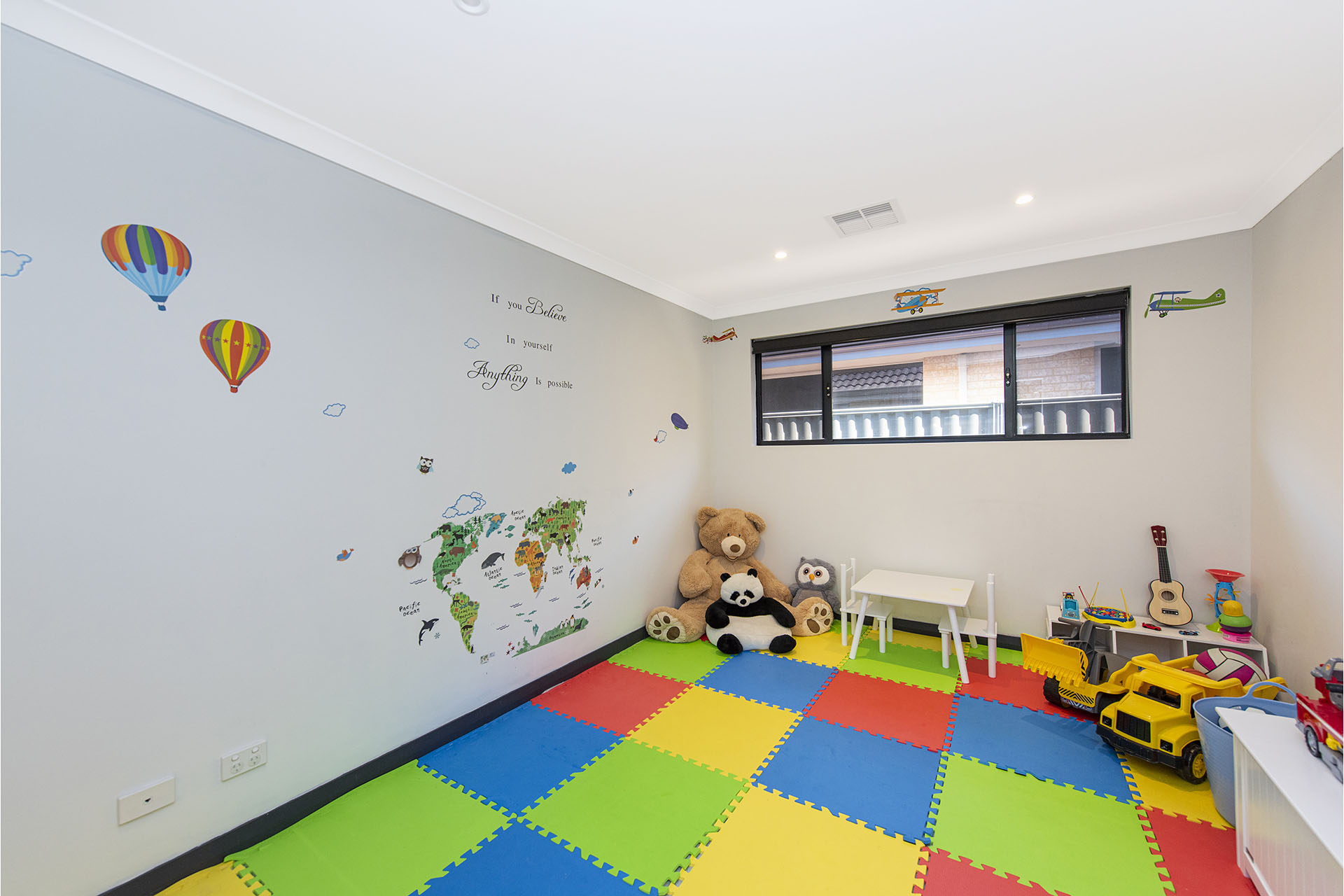 The colourful child's playroom keeping the beloved toddler happy & entertained by his toys, games & books - could be the future theatre or TV room for watching favourite movies and sports or games for snooker/pool table or nursery room or home office or 5th bedroom