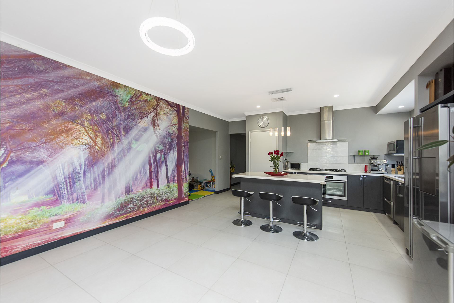 Large family area is brightly lit and inviting with its beautiful, colourful and vibrant nature-inspired wallpaper exuding peace & tranquility.