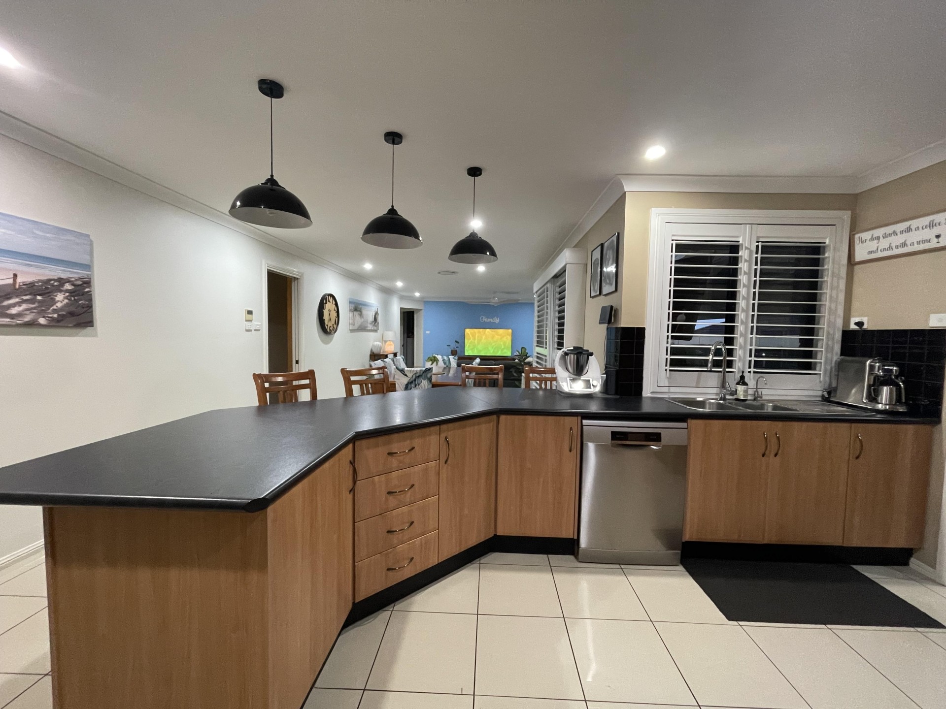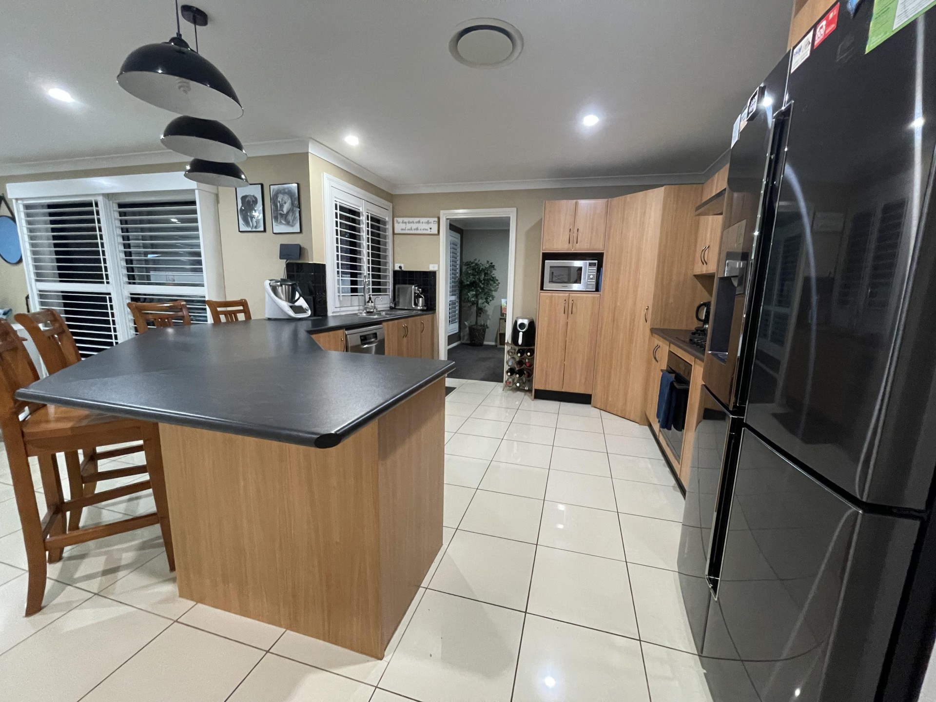 - Large kitchen with lots of cupboard space, large breakfast bar/bench and self-cleaning, steam bake oven with natural gas cooktop.