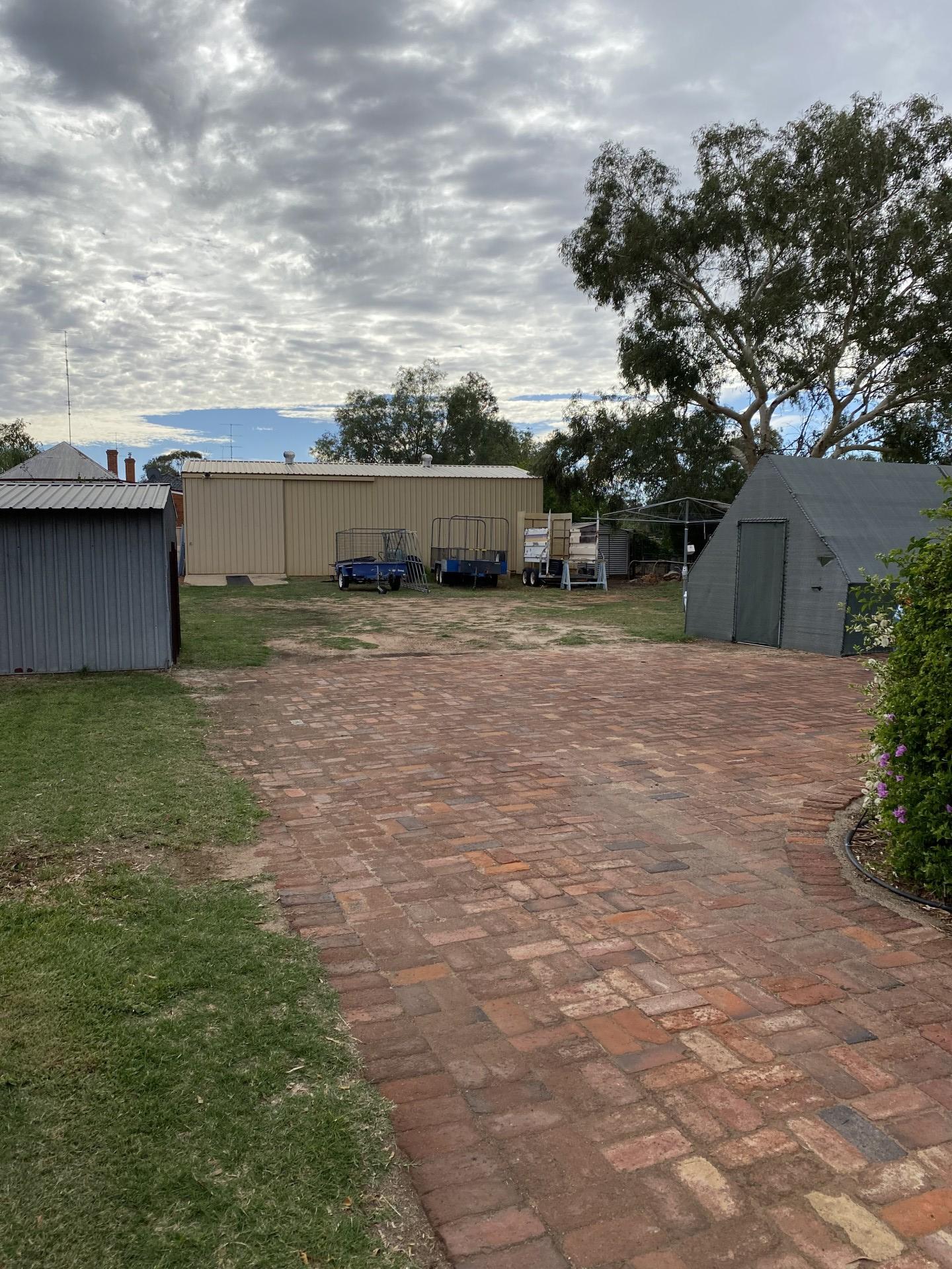 Backyard includes large shed and chook run.