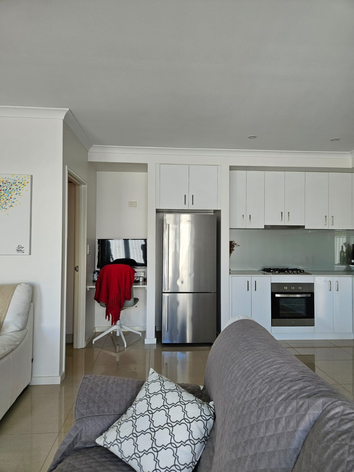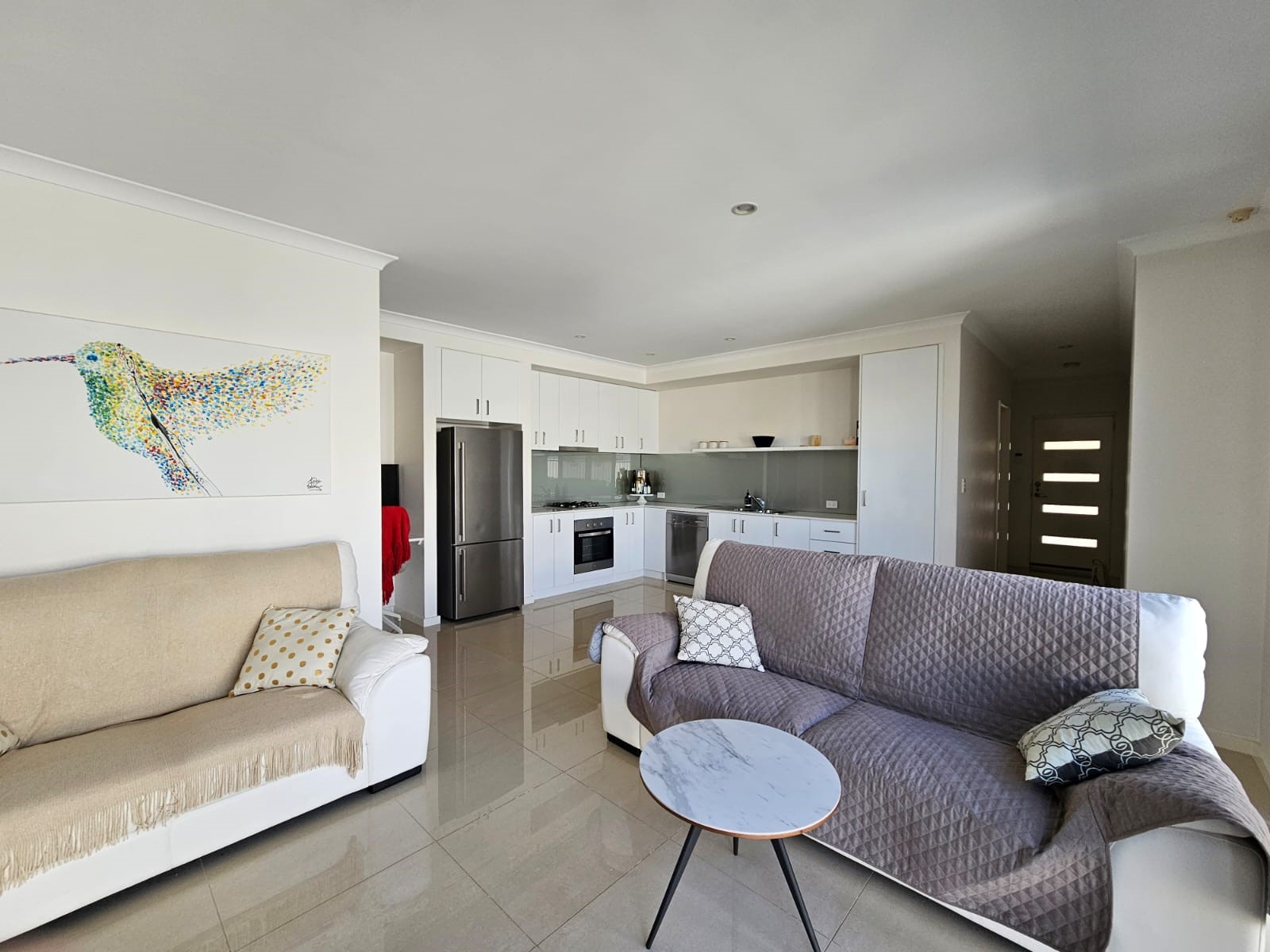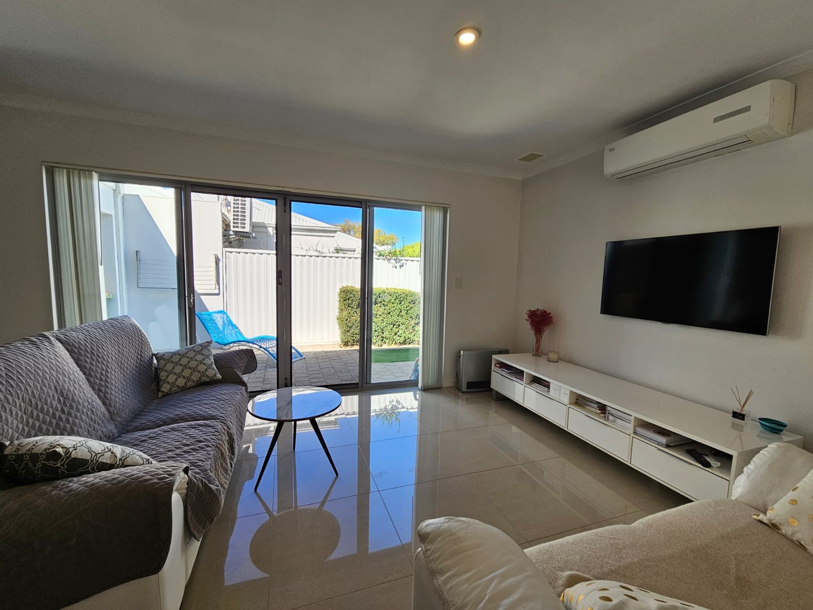 Glossy floor tiling creates a feeling of spaciousness throughout, accentuated by extensive white kitchen cabinets, stone benchtops and glass splashbacks. Expansive windows and sliding doors, which open out to a sizeable paved courtyard.