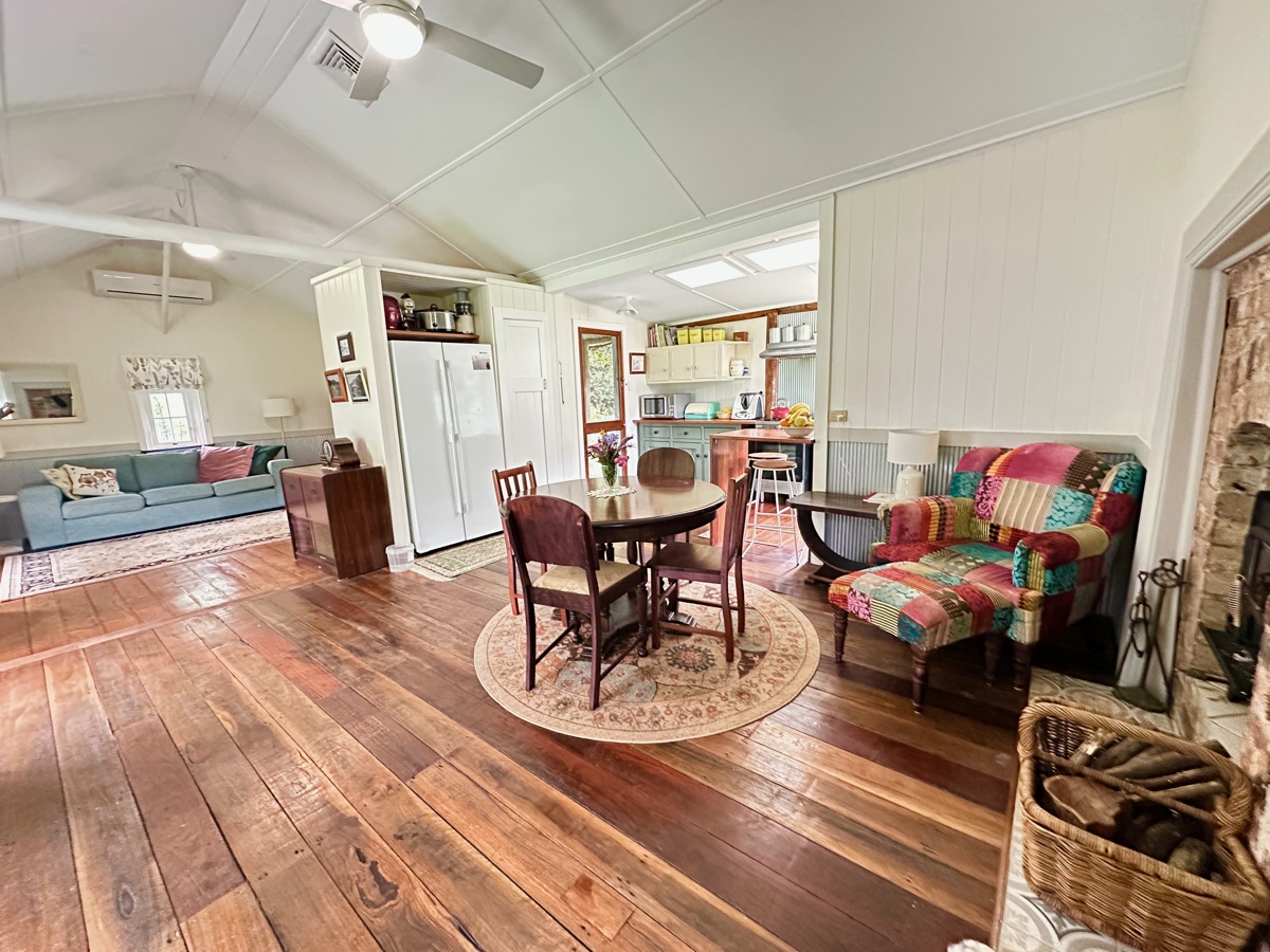 • Interior: Original hardwood floors, brick chimney, and classic fuel stove.