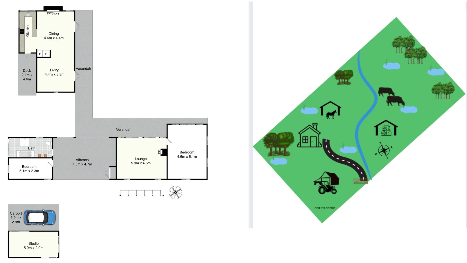 • Structures: Timber cattle and horse yards, horse shelter with feed and tack room, barn-style machinery shed with mezzanine loft, carport, woodshed, chicken coop, and more.