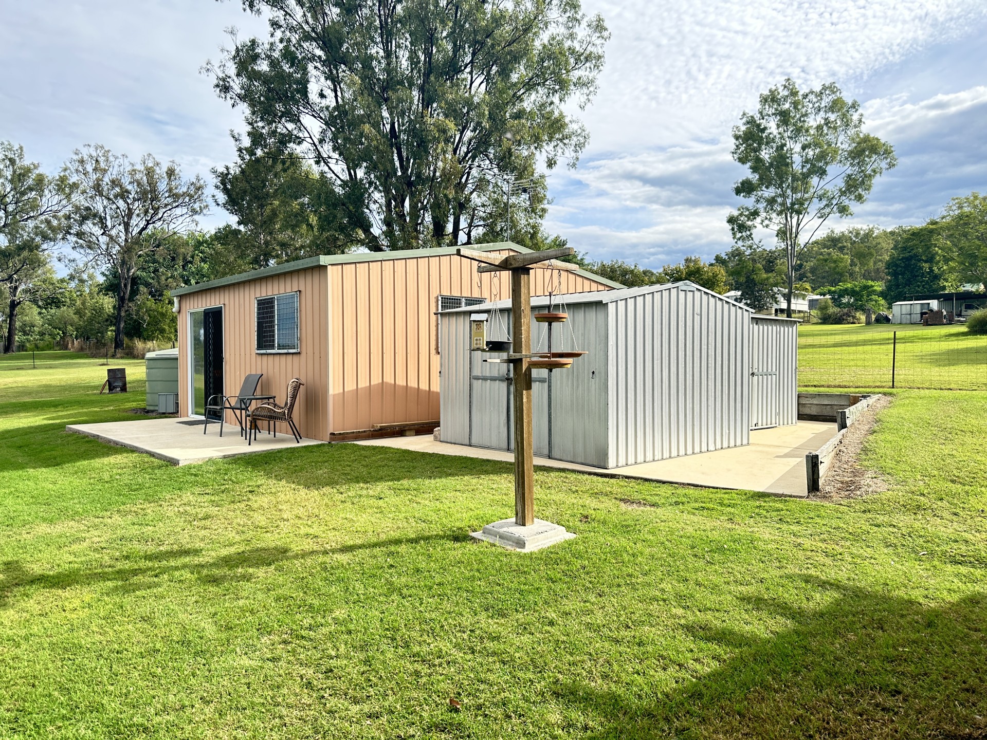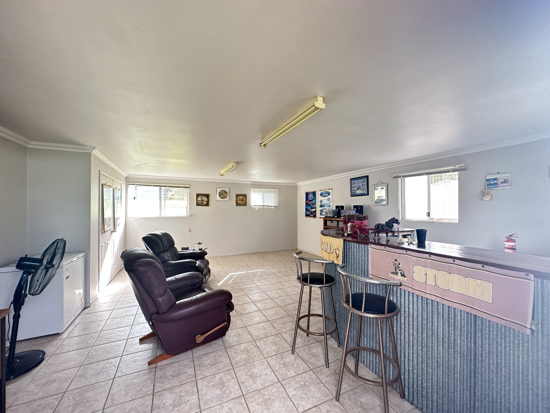 Shed space #1 is 7 x 6 m in size with concrete slab, powered, tiled flooring, built in bar, storage cupboard, outdoor concrete patio area, the space is currently being used as a well loved "man cave".
