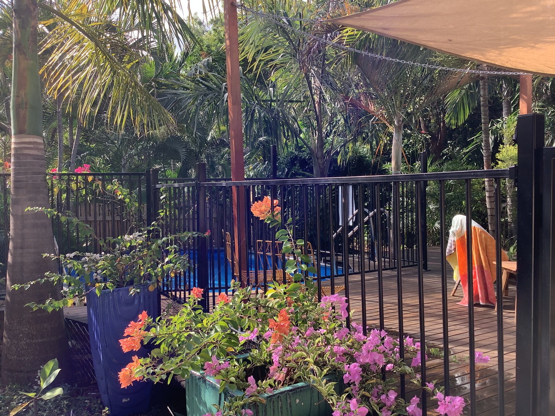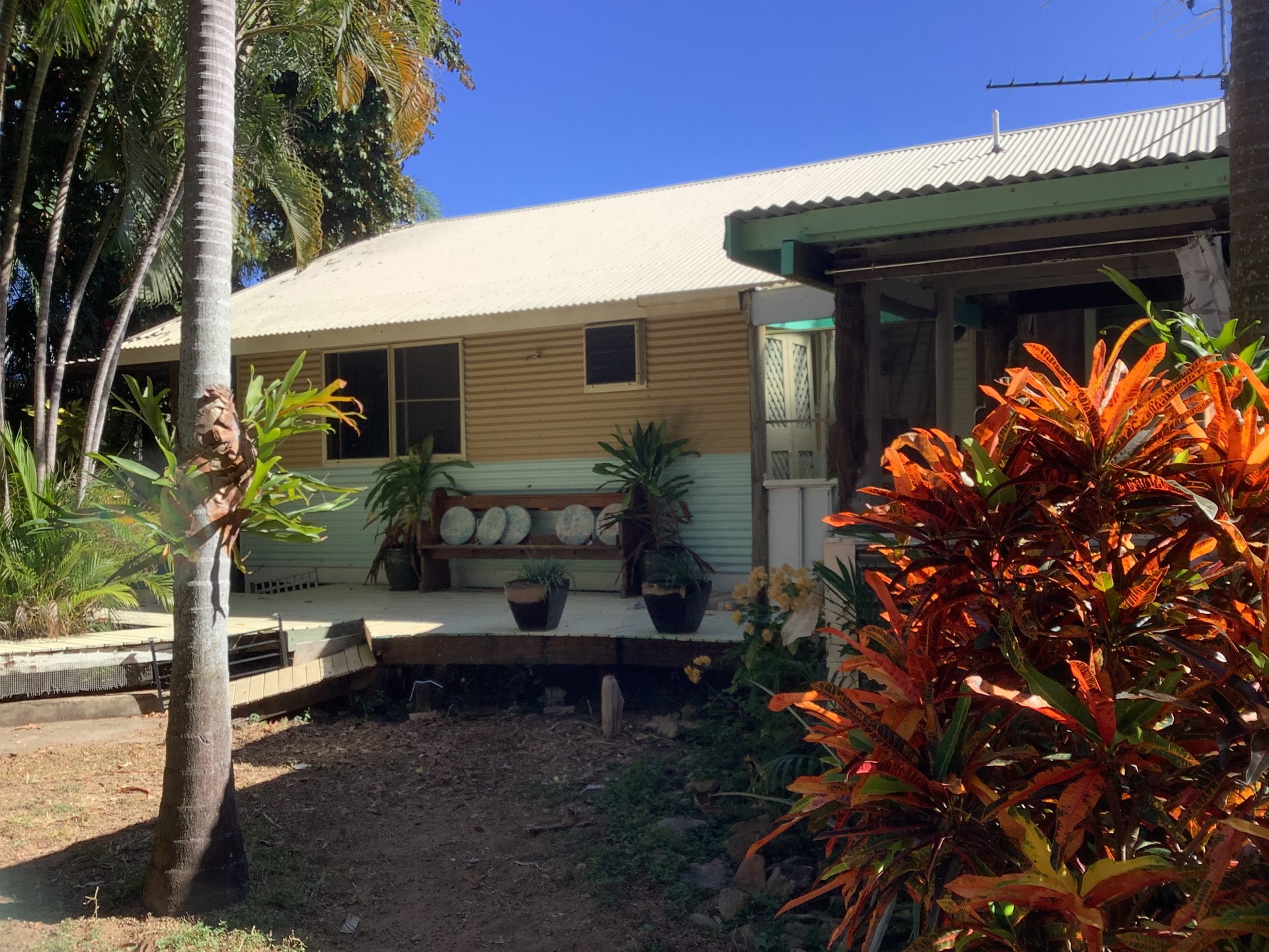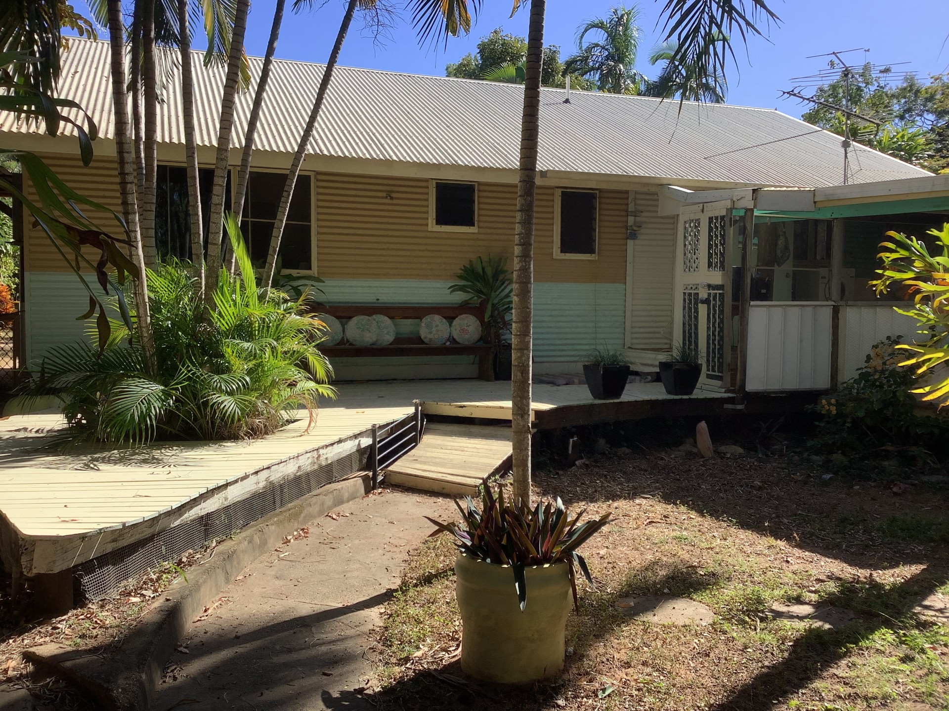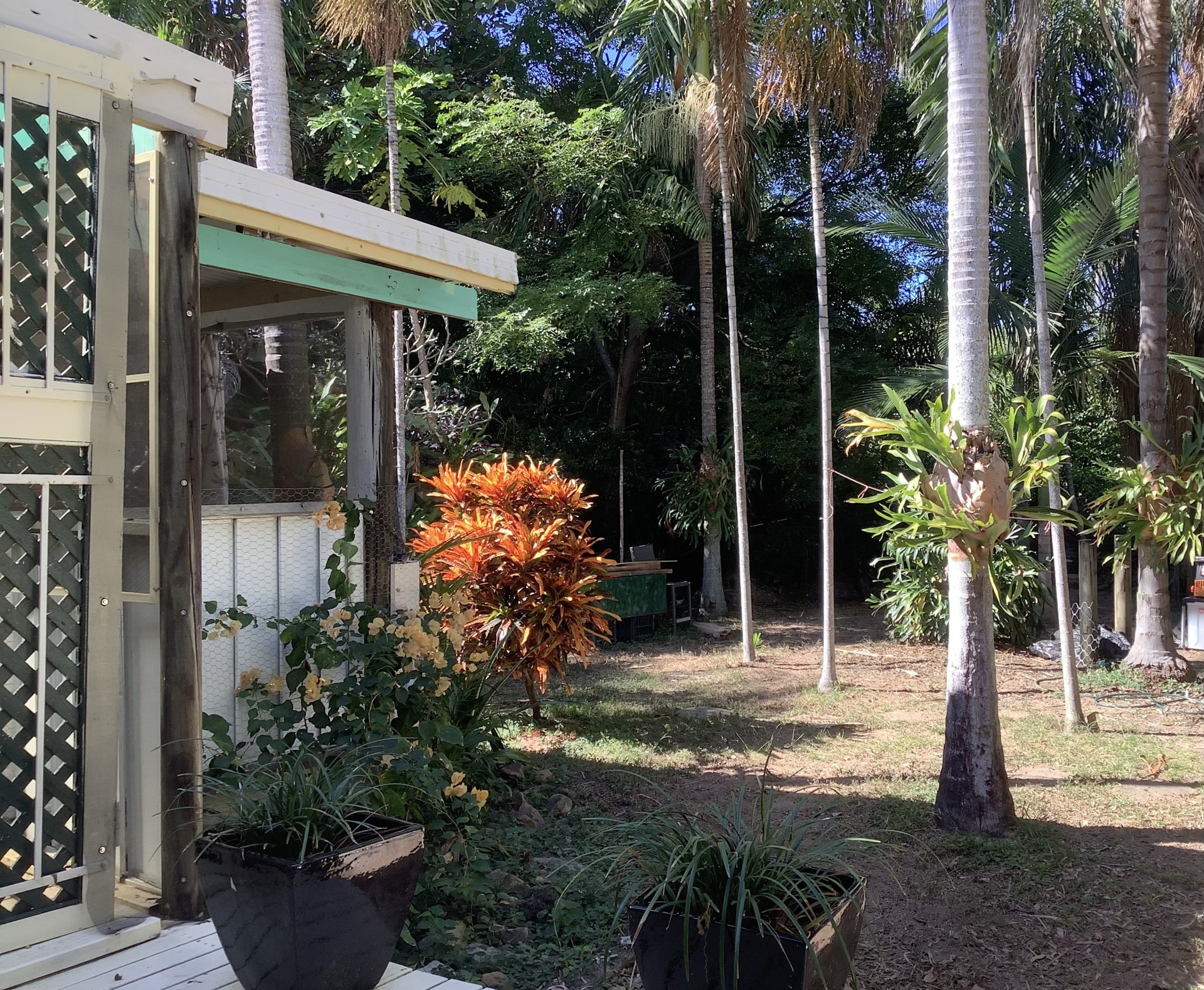The back garden is a shaded tropical oasis featuring numerous elk horns adorning palm trees.