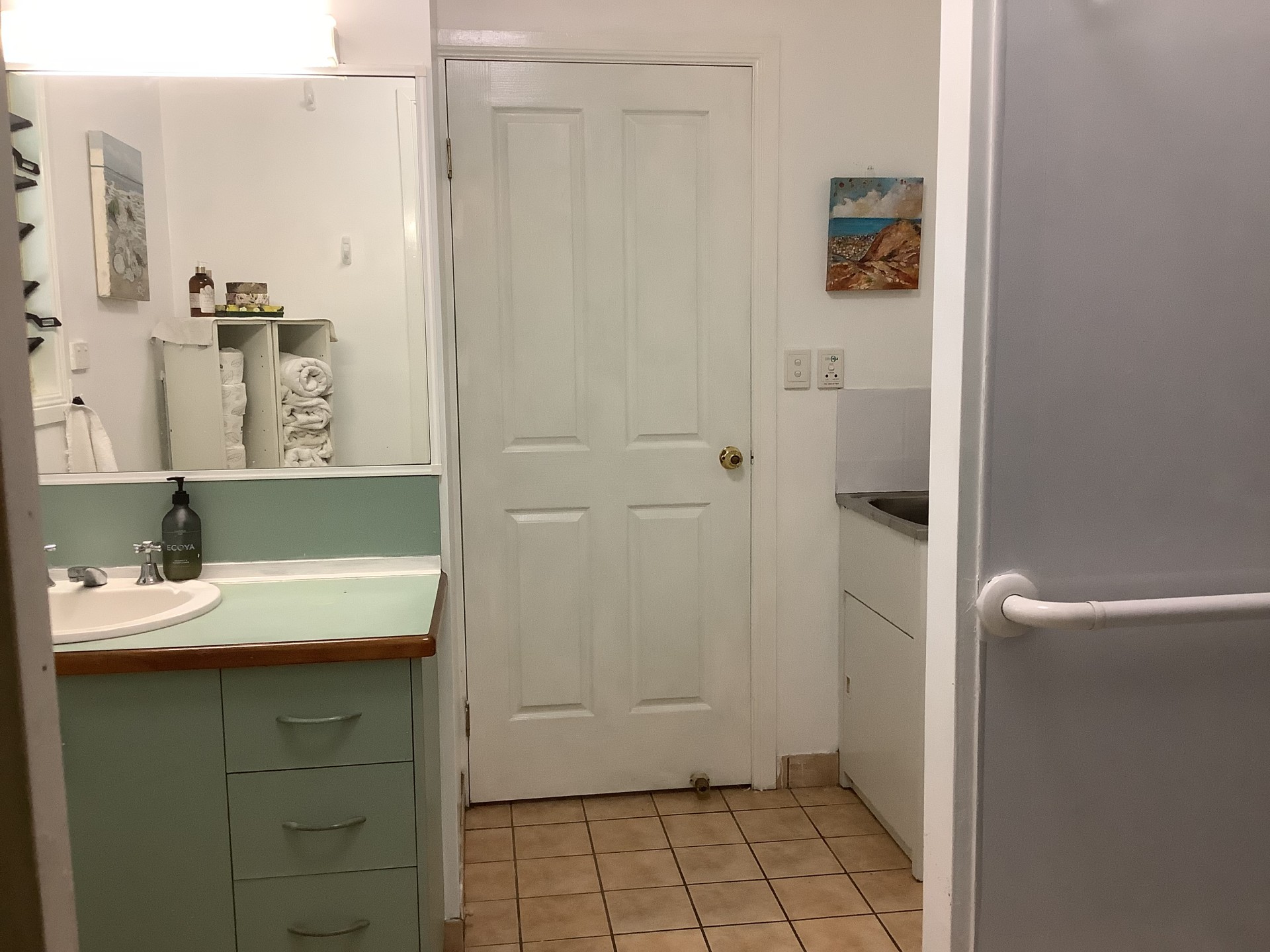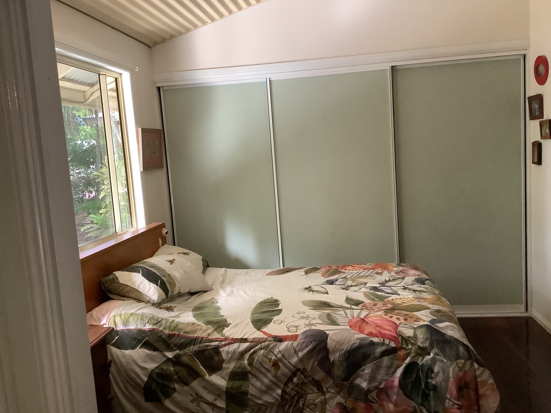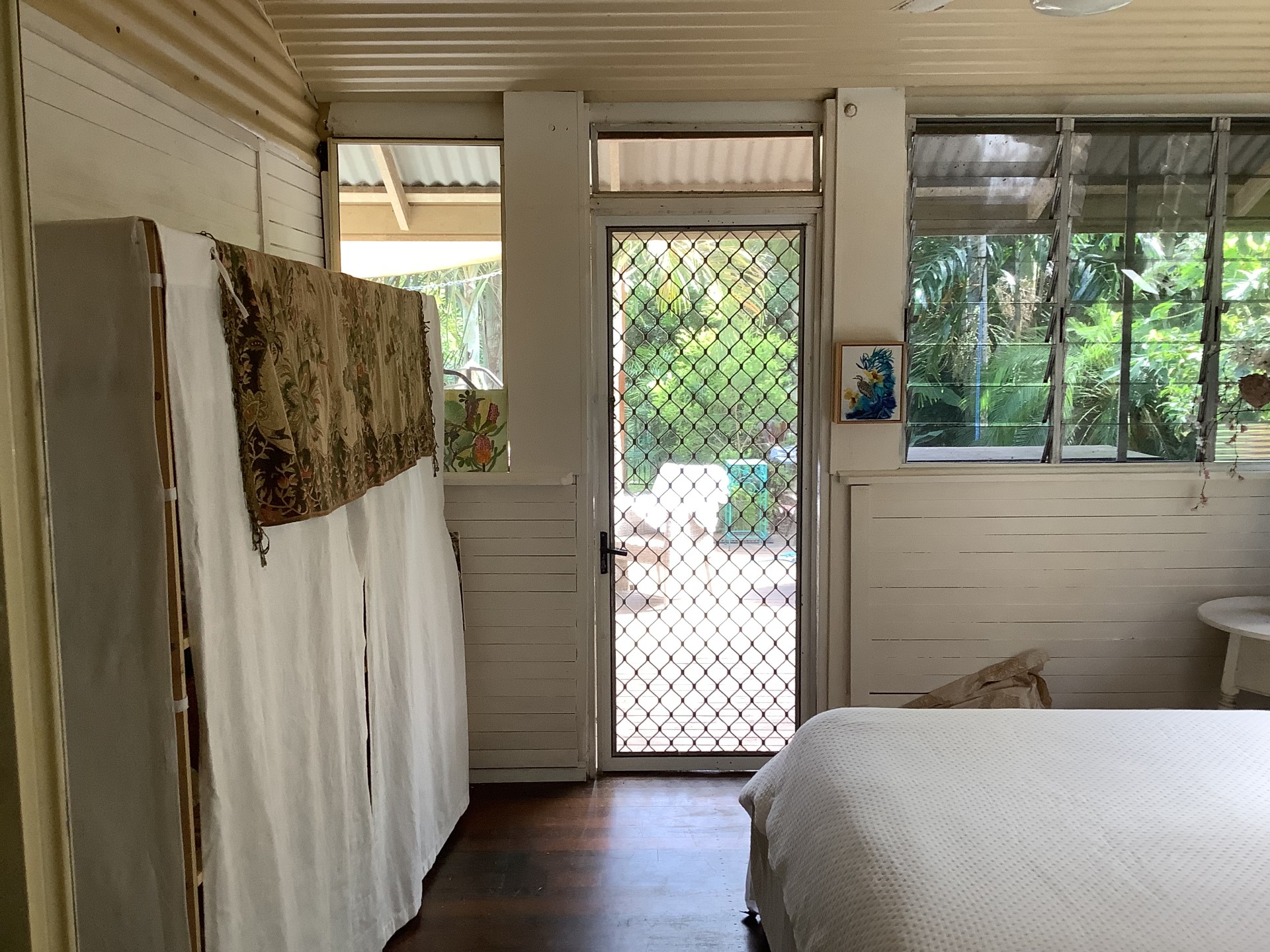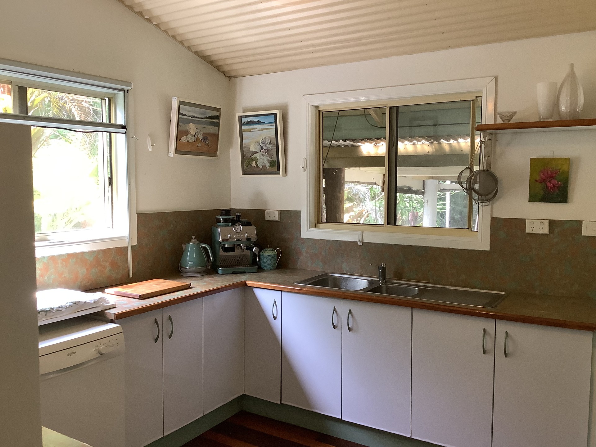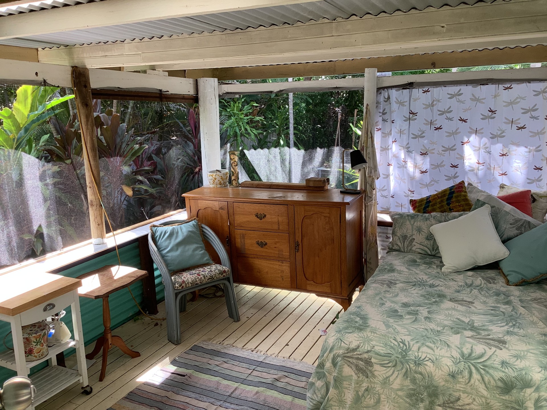 A covered verandah room, off the kitchen, doubles as a sleep out and laundry. It could easily be enclosed to make a third bedroom or lounge area.