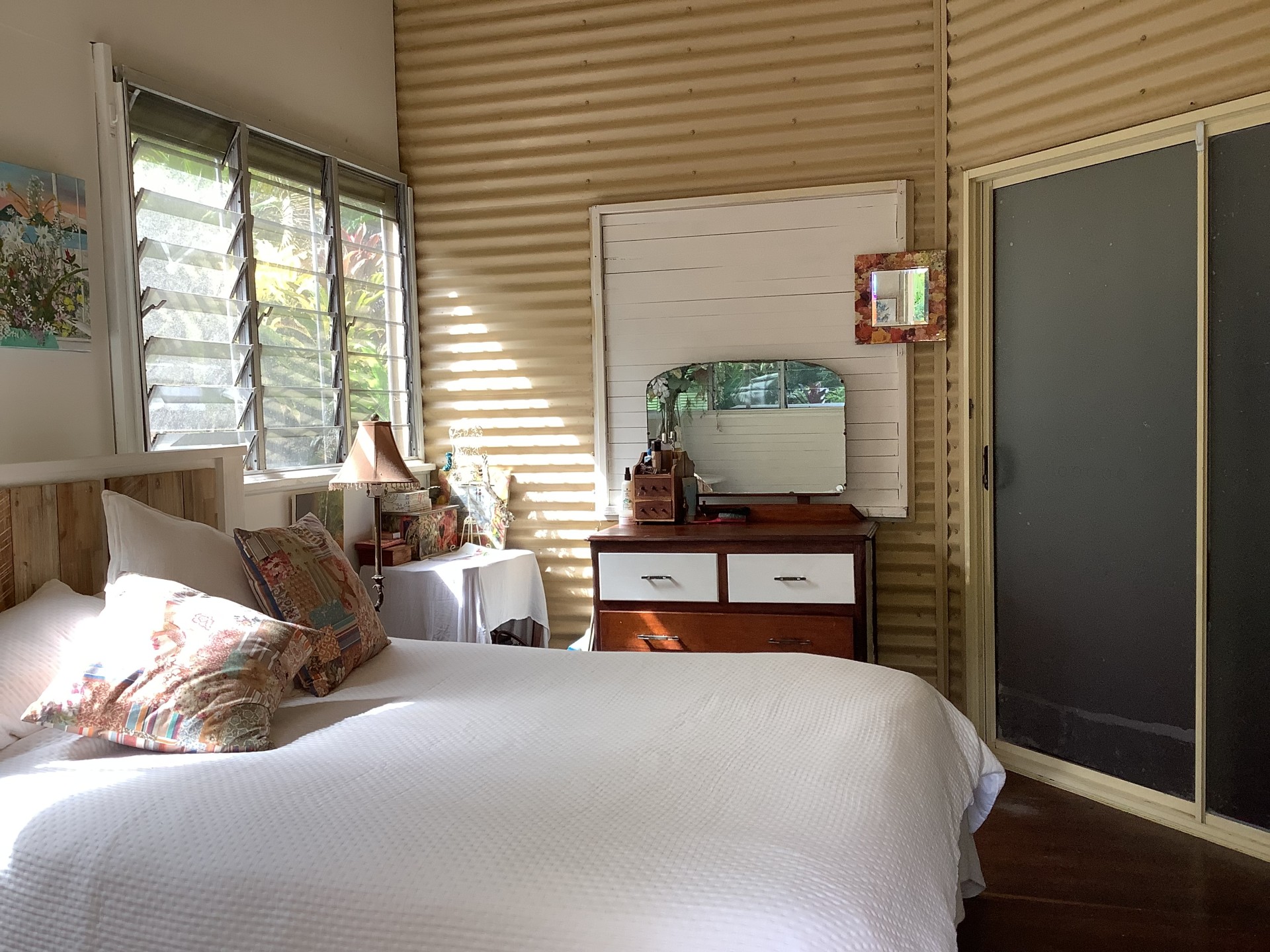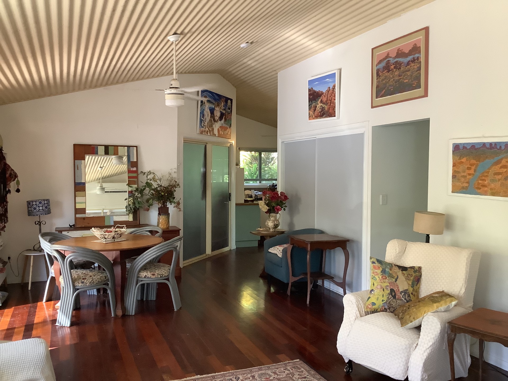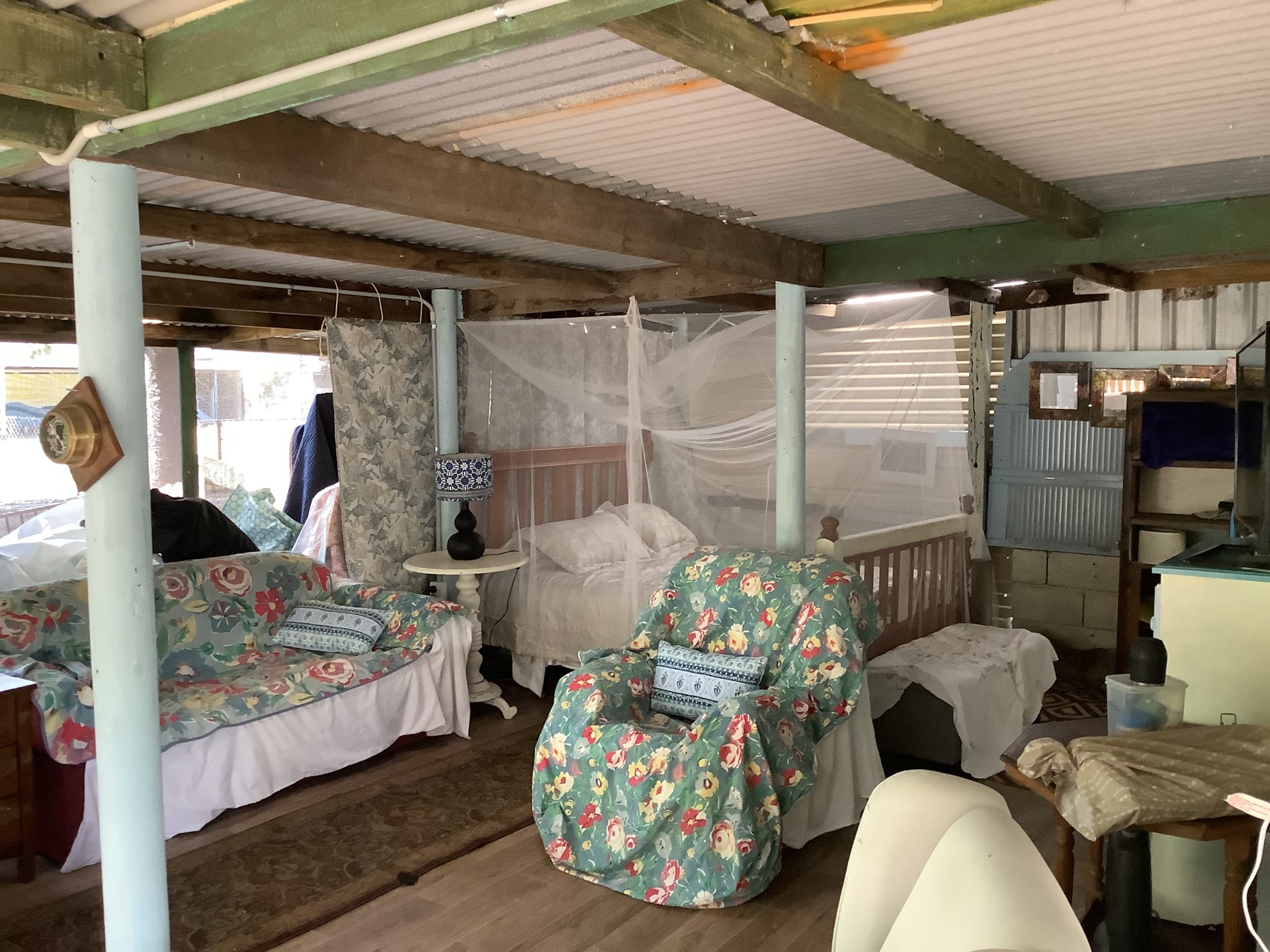 This property also features a huge multi purpose shed ( with lights and power) built from recycled ironwood. It is currently set up as self contained family/guest accommodation and art studio but could convert back to its original vast man shed.