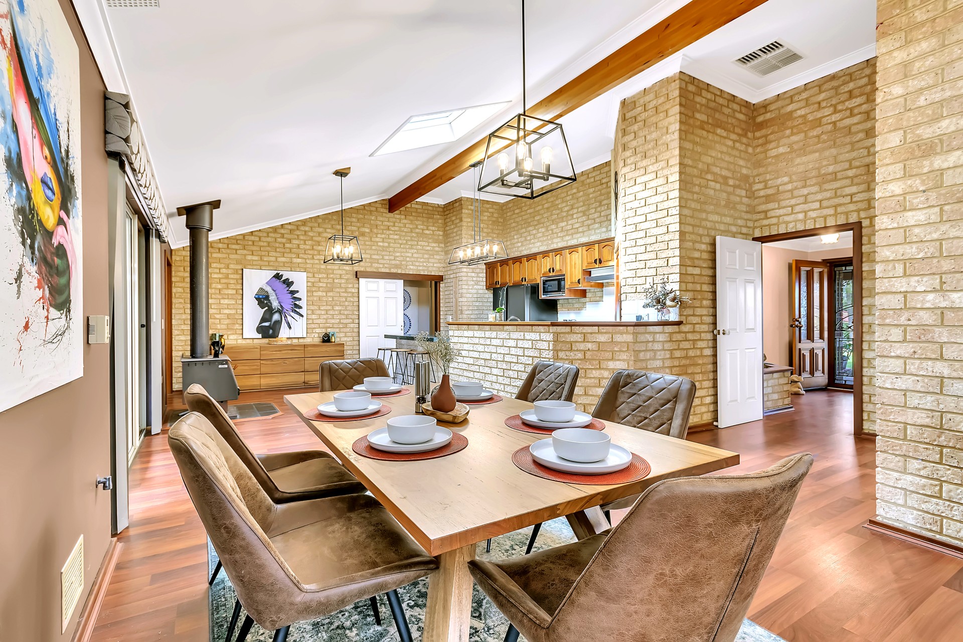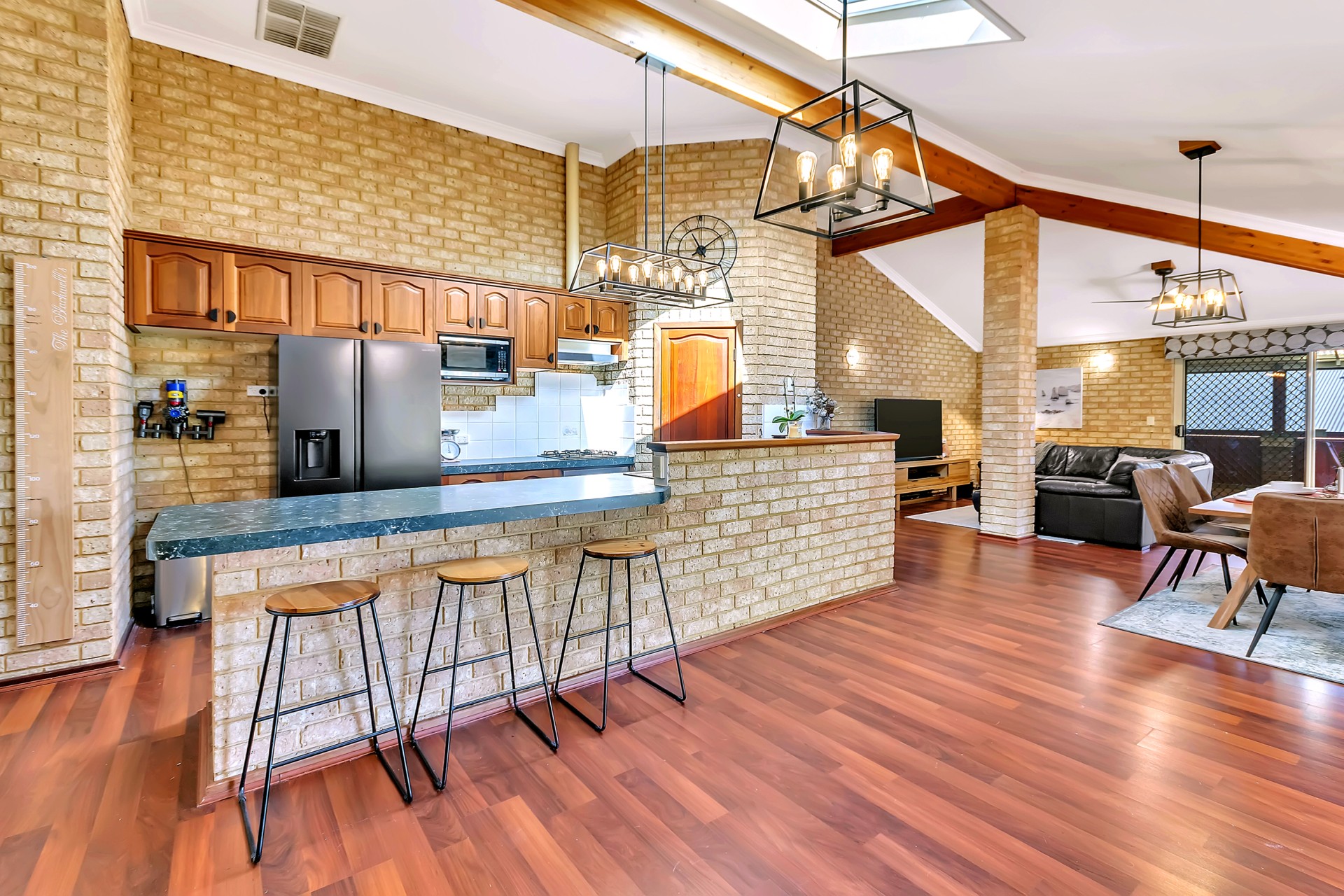 • Vaulted ceilings to the Kitchen -living -Dining with exposed brick and beams.