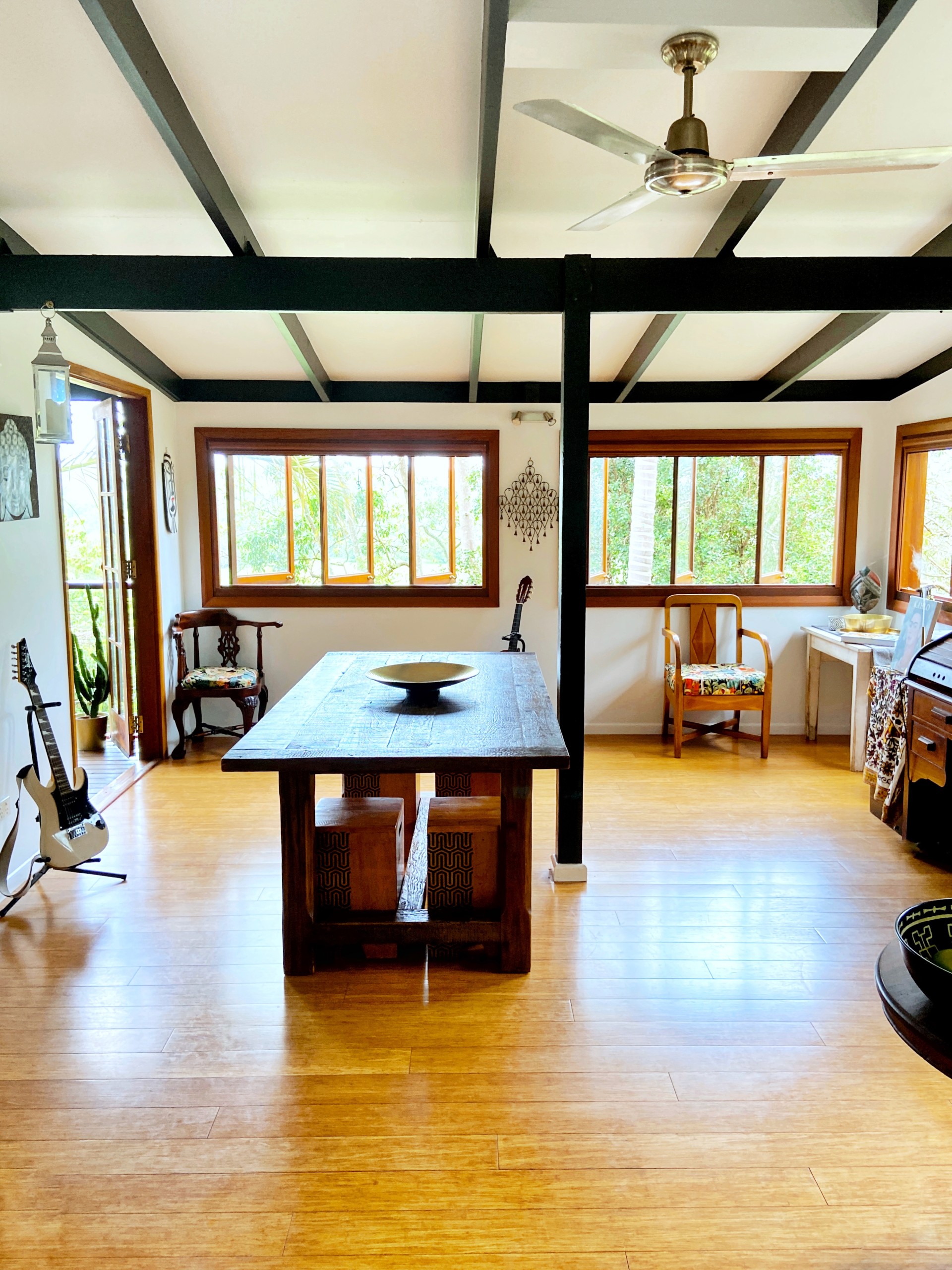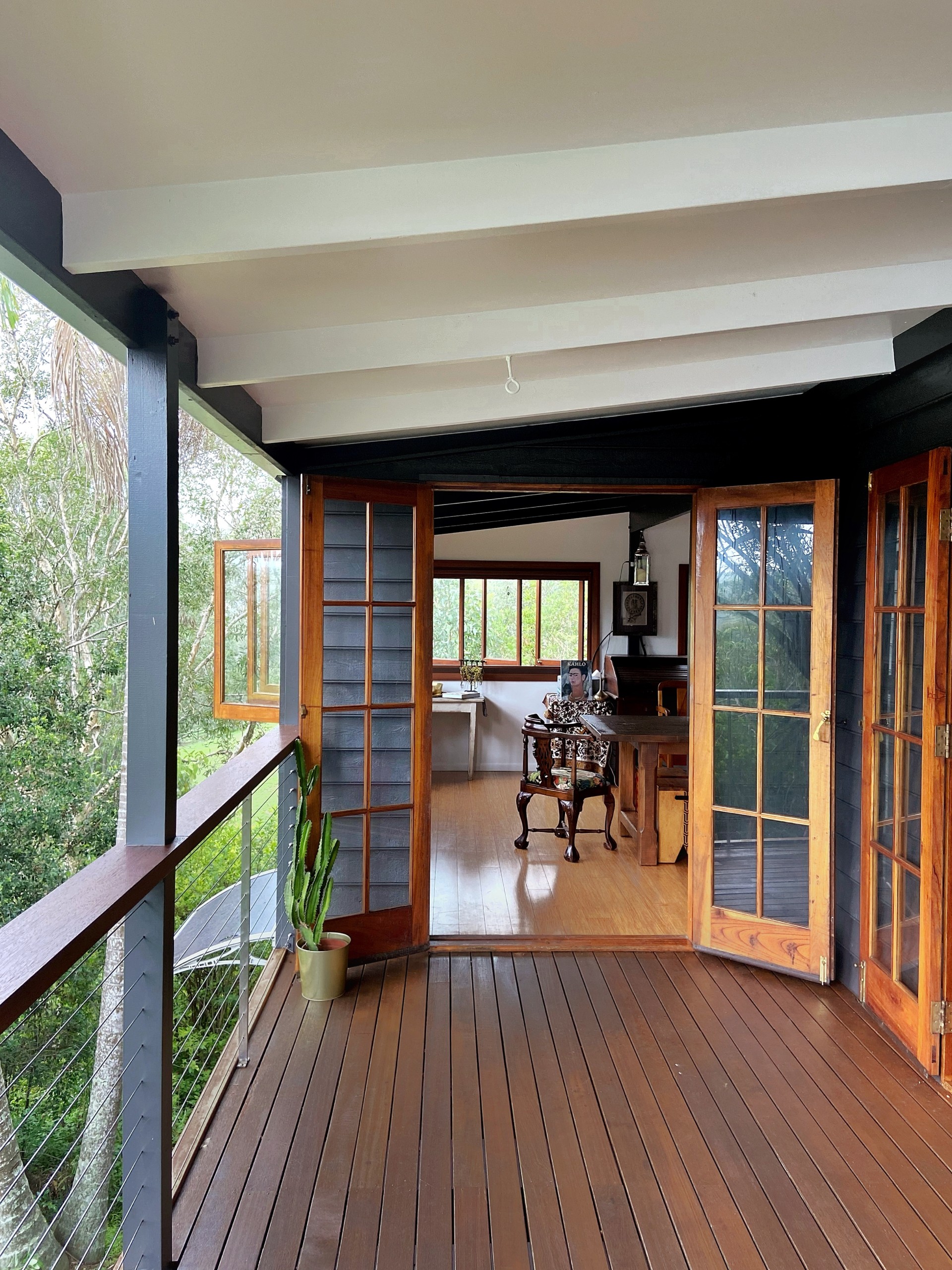 A breezy deck that flows into a spacious dining and living area, with timber French doors and custom screened windows framing those incredible views.