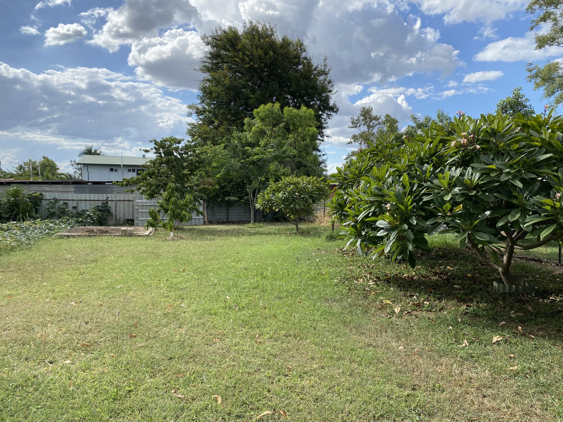 The yard features palm trees at the front. The rear yard has a mature African bean tree, frangipanes, leopard and peanut trees, banana, jackfruit and mulberry.