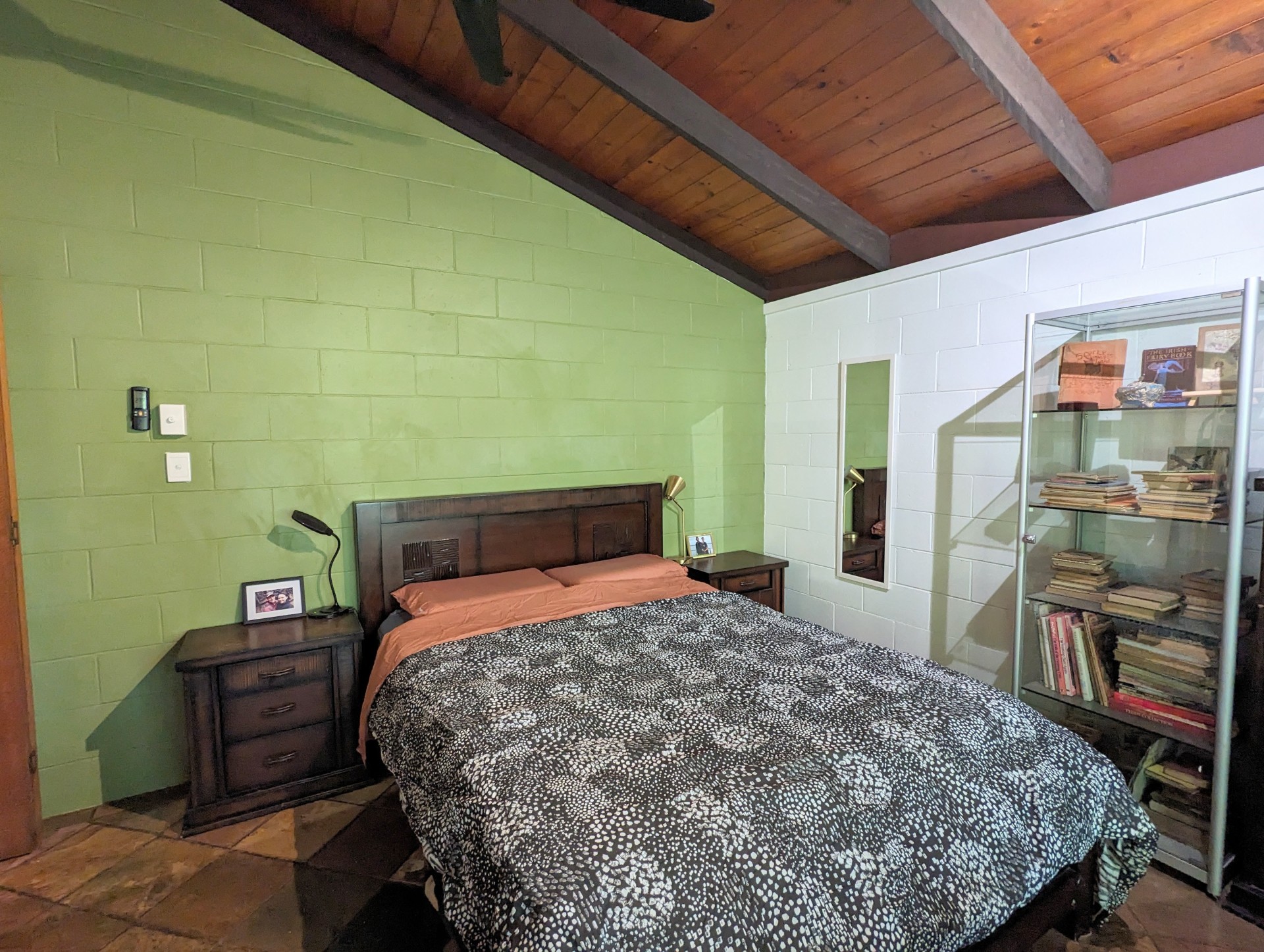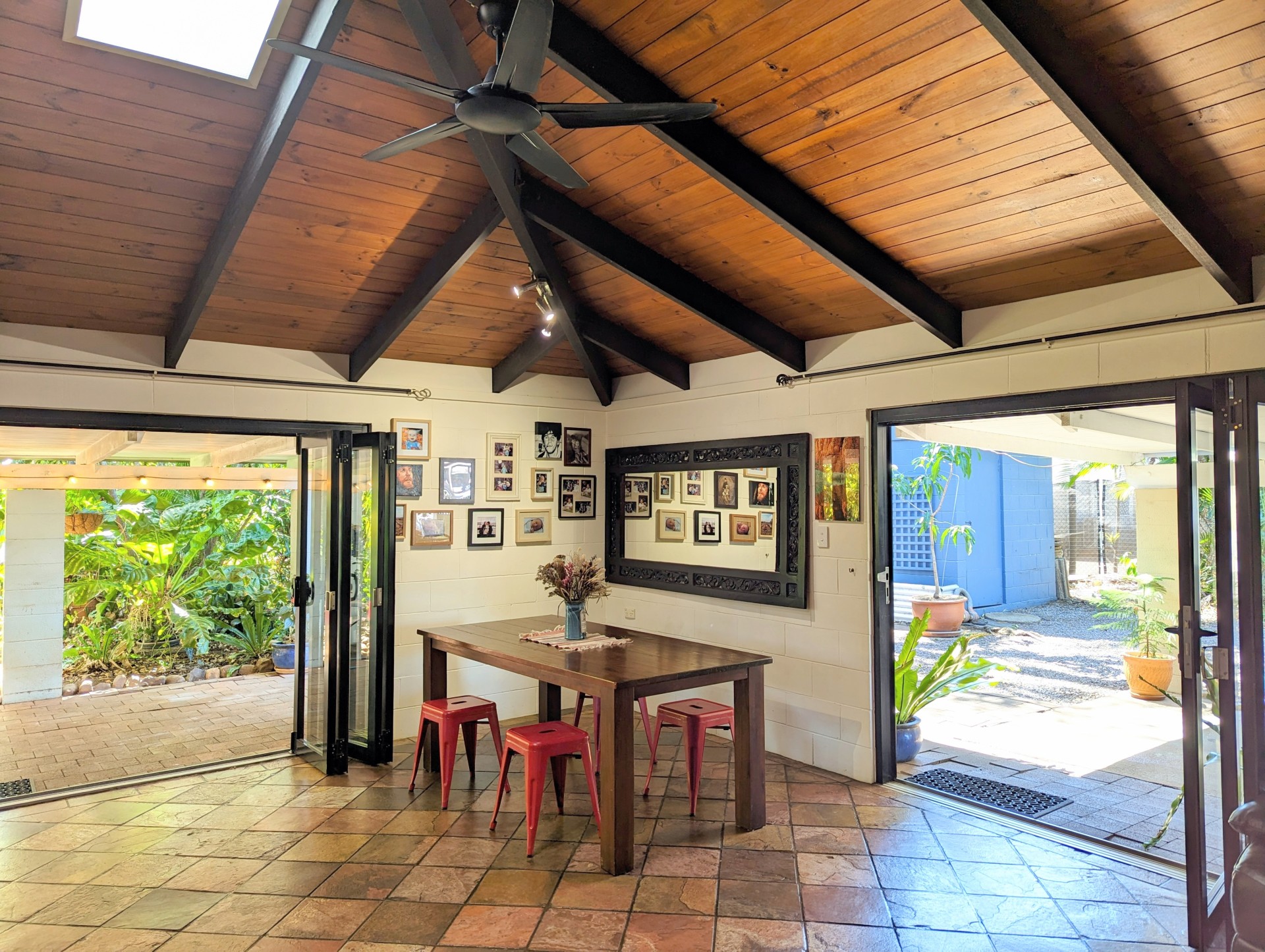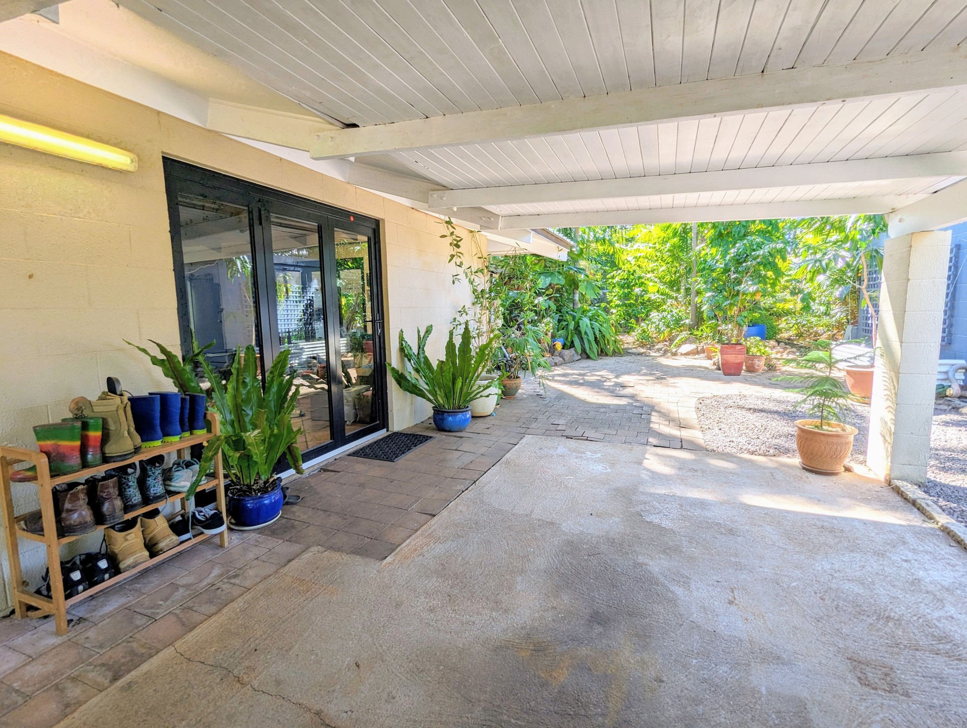 A house for nature-lovers, with bird-song from the canopy of established native Terminalia trees and a huge yard with space for chooks or other pets. A large driveway with plenty of room for a boat or caravan. It's a solid brick home with high ceilings. Modern louvers throughout the house and large bifold doors to open up the living room to the outdoors. Verandahs outside front and back doors. Pink slate flooring throughout the living room and bedrooms.