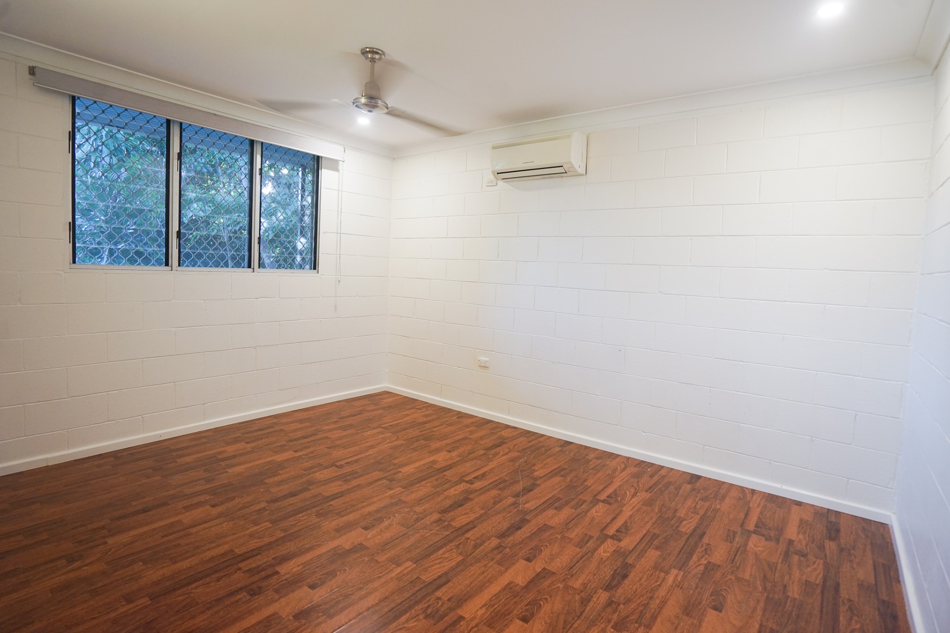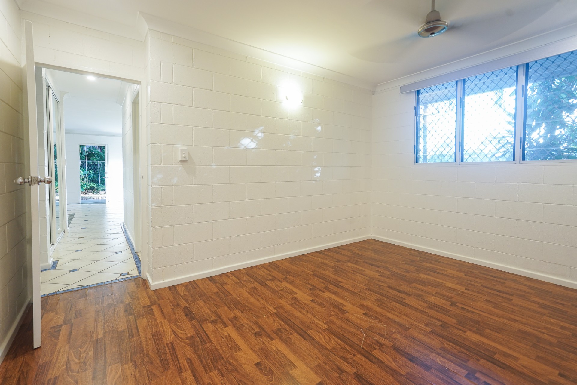 The main bedroom has faux wooden floorboards and room for a king size bed.