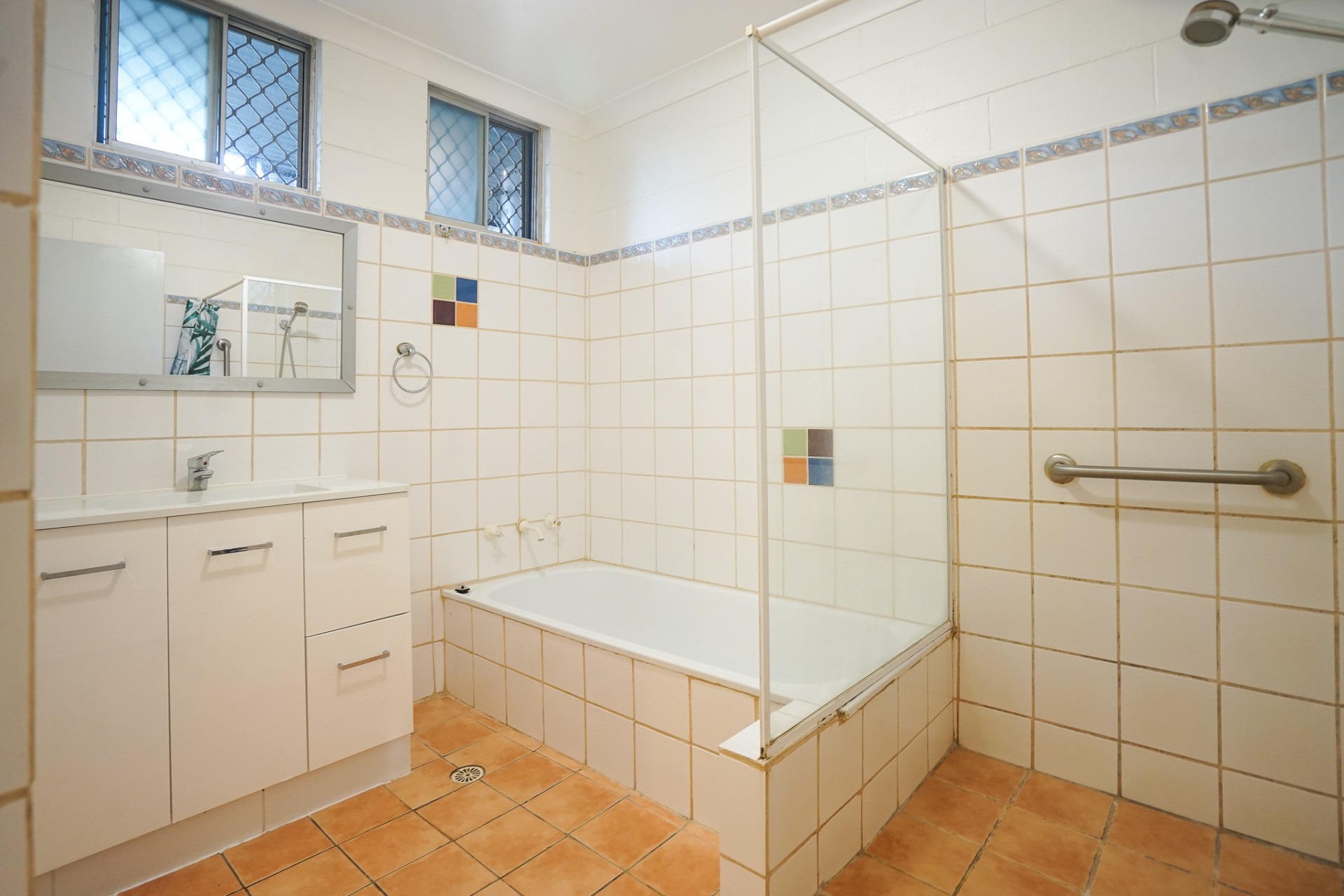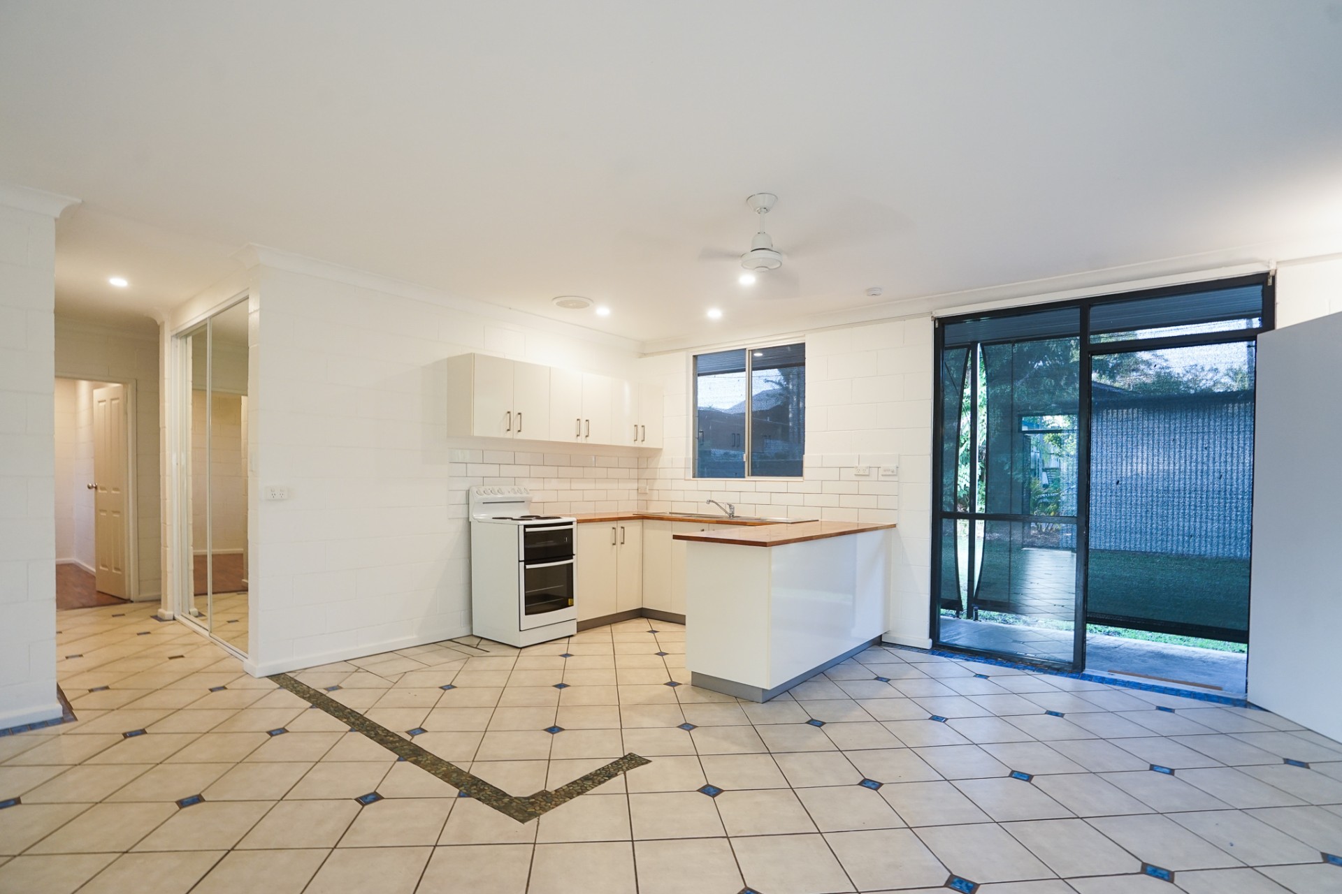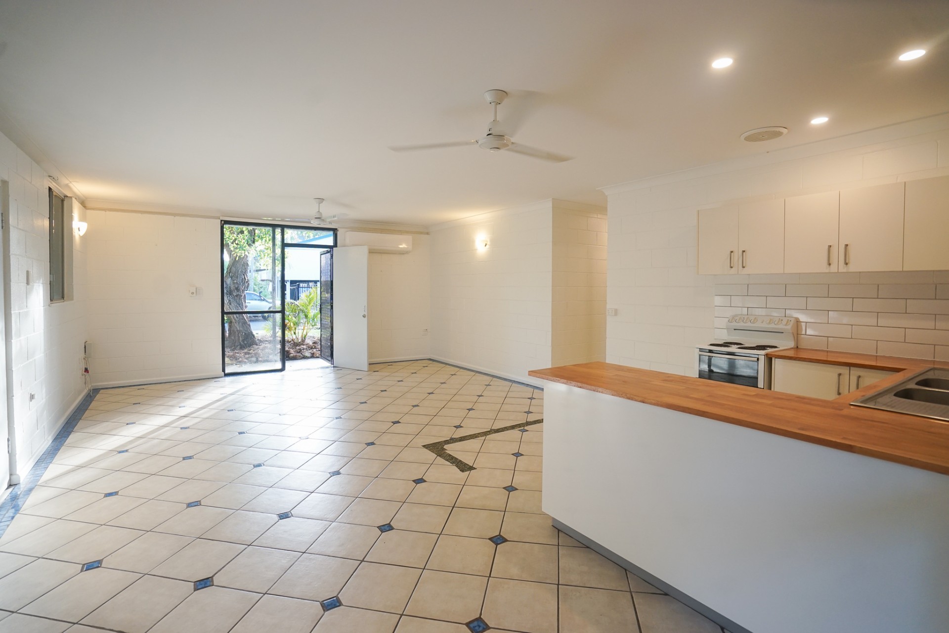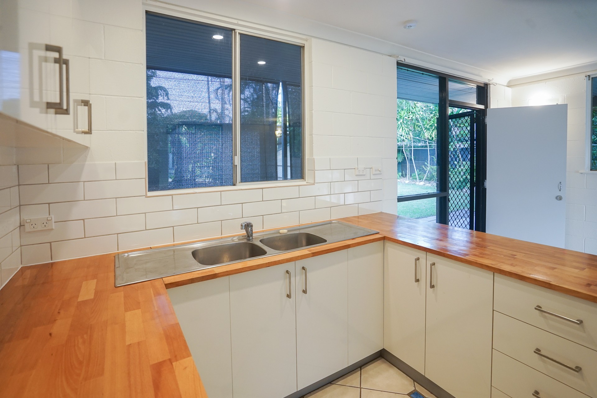 The bathroom has a shower and bath with separate toilet. The kitchen has wooden bench tops, trendy splash back tiles and new cupboard doors.
