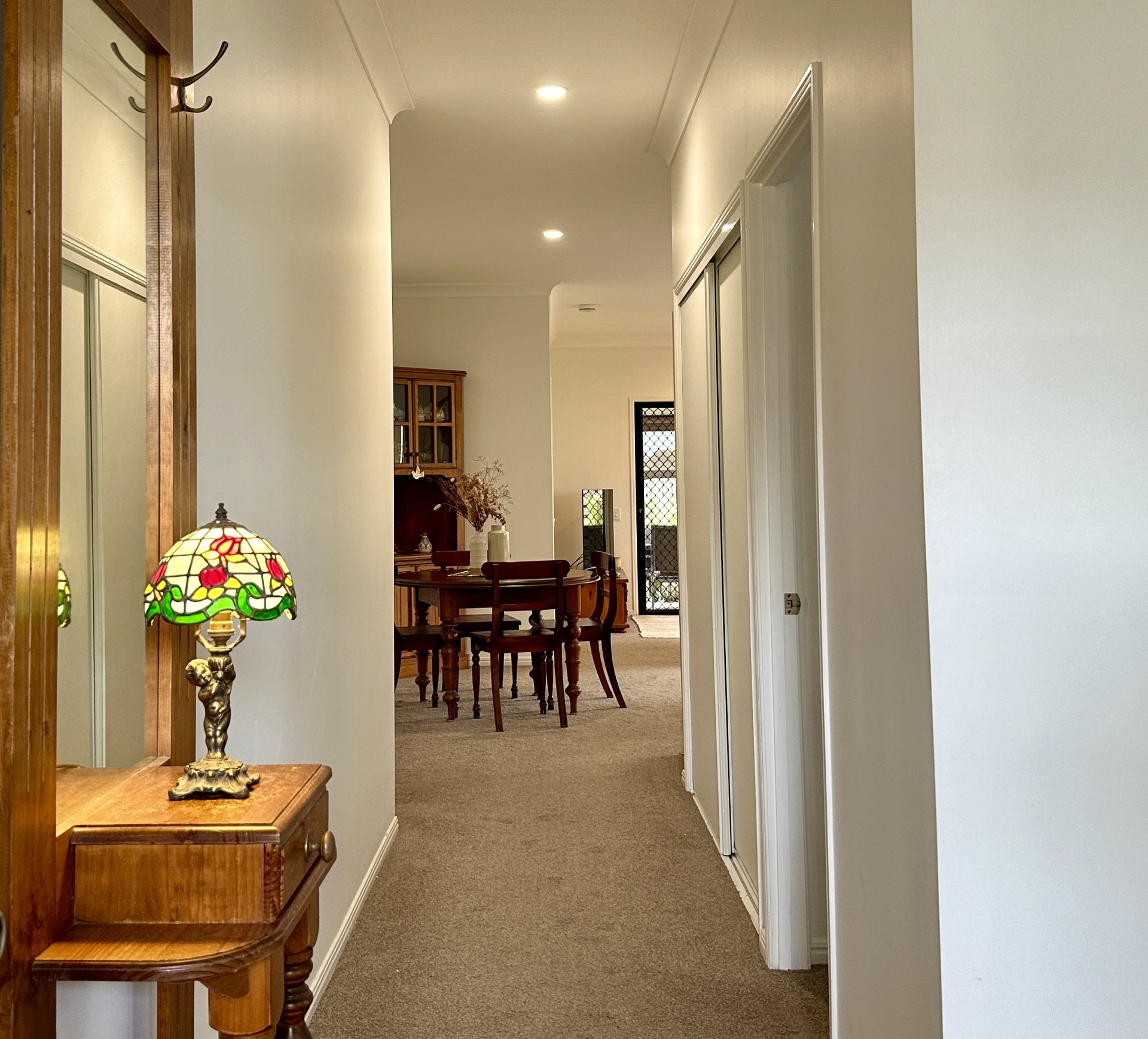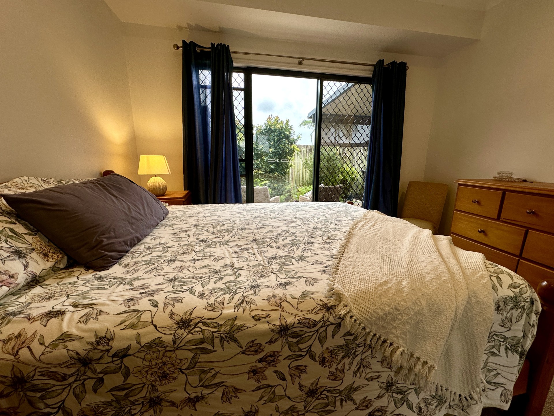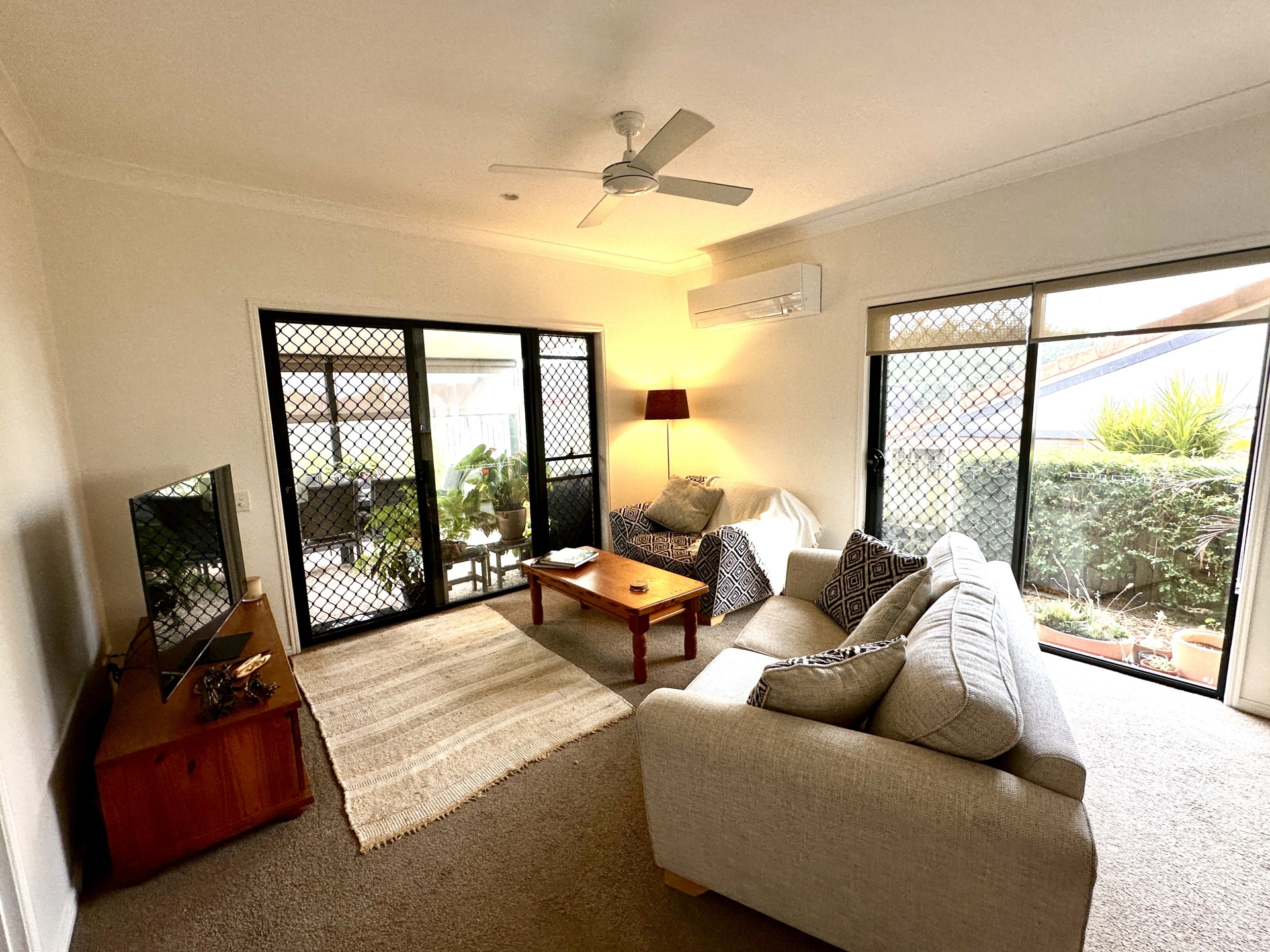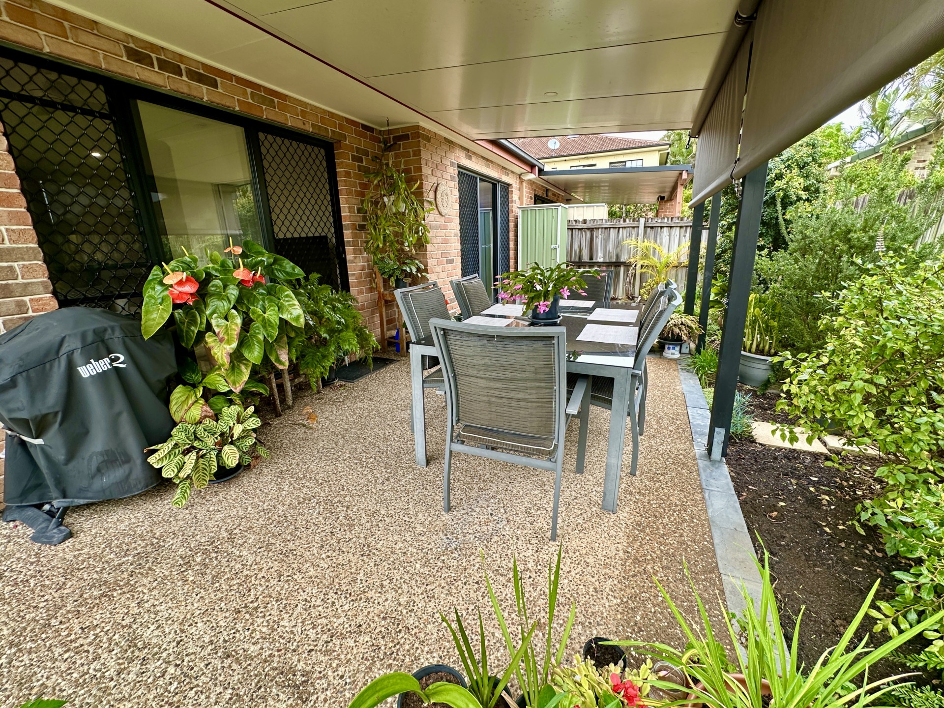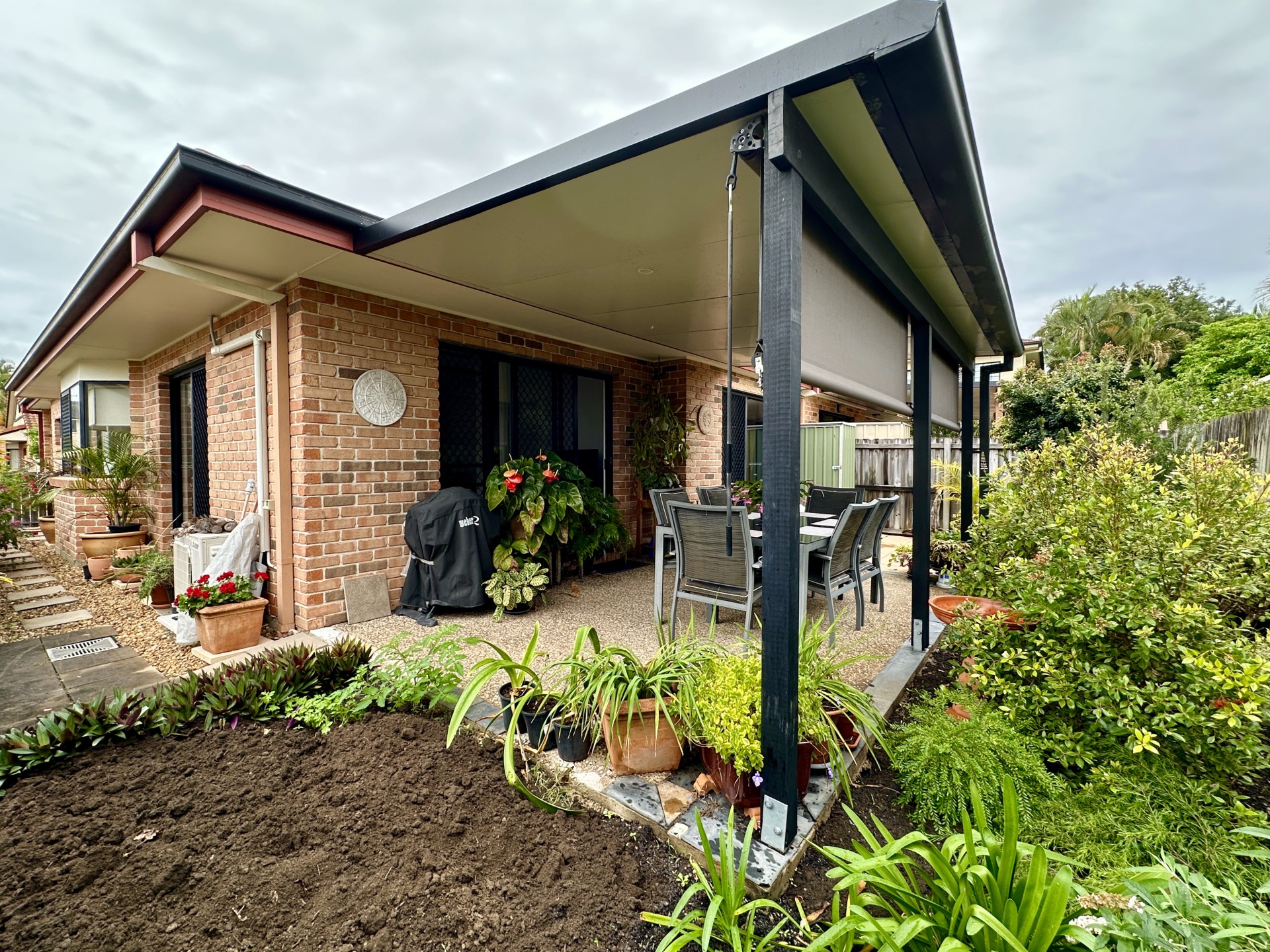 The living room and master bedroom, at the back of the Villa, open on to the fully fenced courtyard and gardens, which have been lovingly tended by the current owner. The courtyard has a large concrete patio with an insulated roof, dimmable downlights and pull-down external shades, which makes for very pleasant outdoor dining. There is also a paved outdoor area with a very handy garden shed.