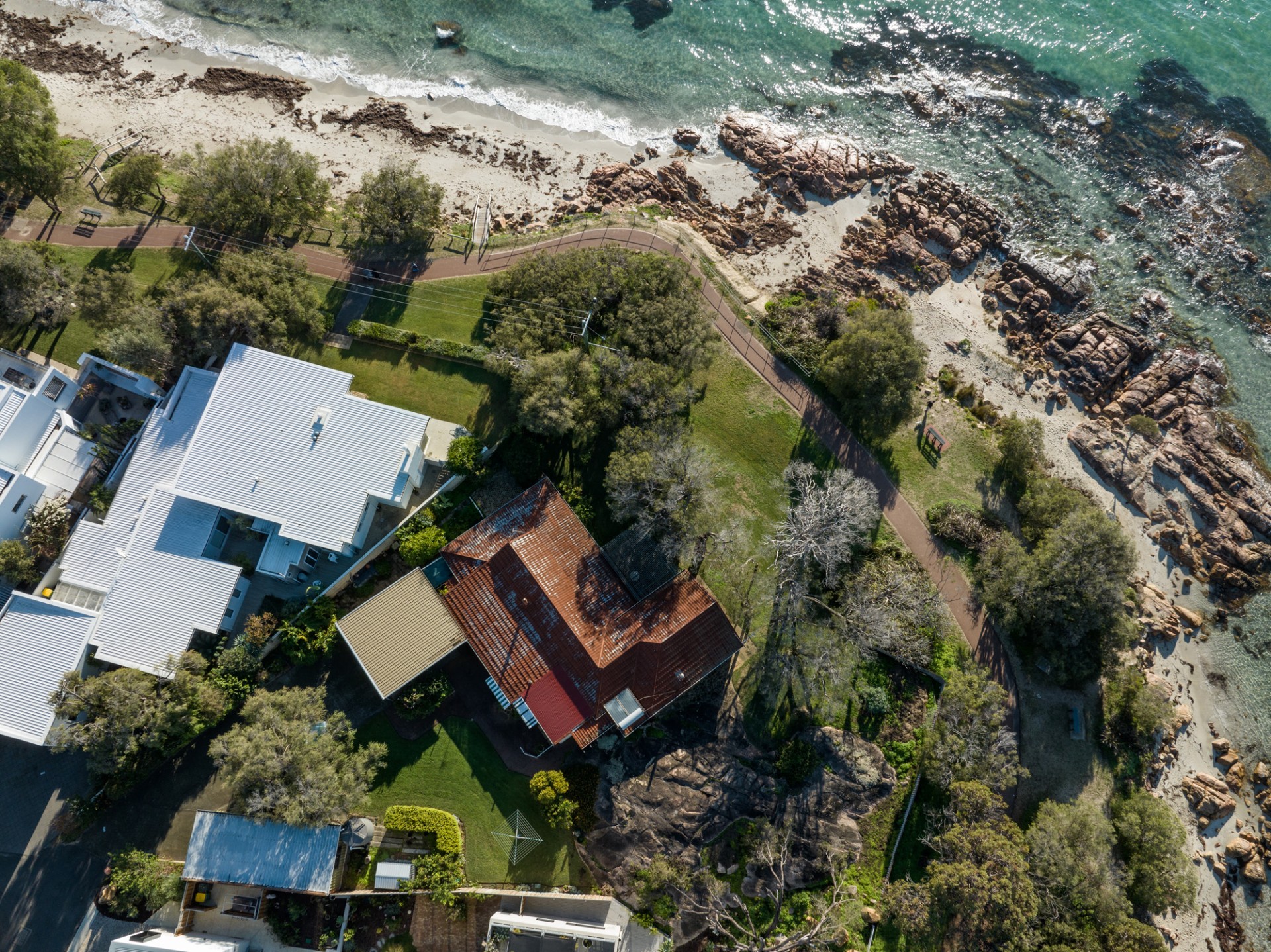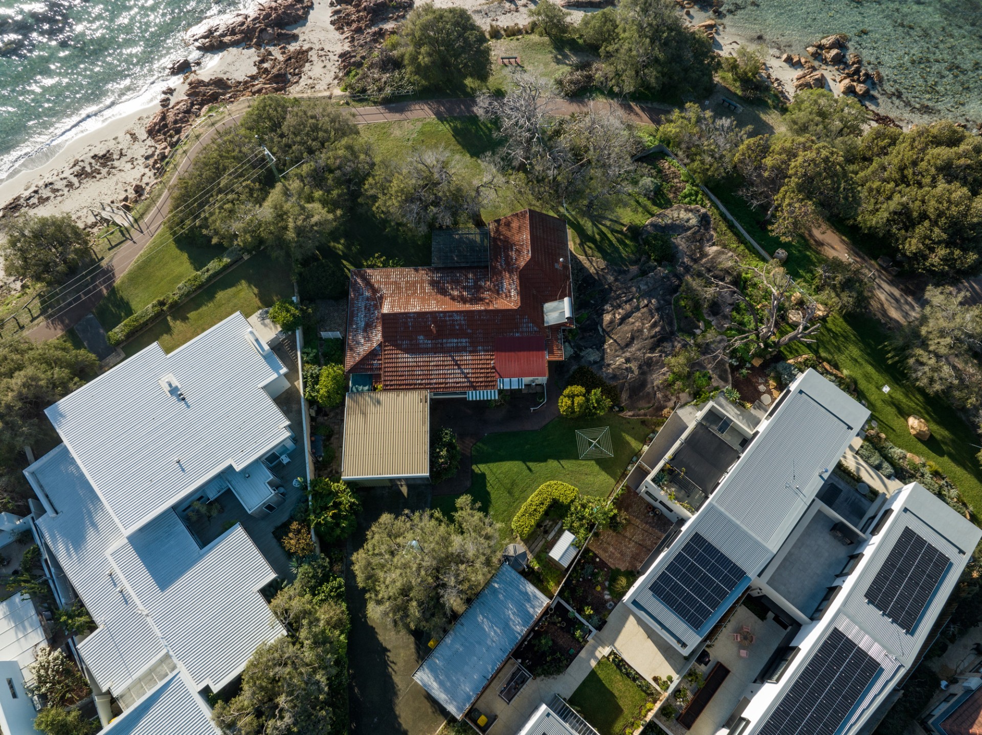 On a massive 1501 m2 block with rear access via Thurstun Lane, the property comprises a striking granite rock formation, an original beach cottage with modest additions,