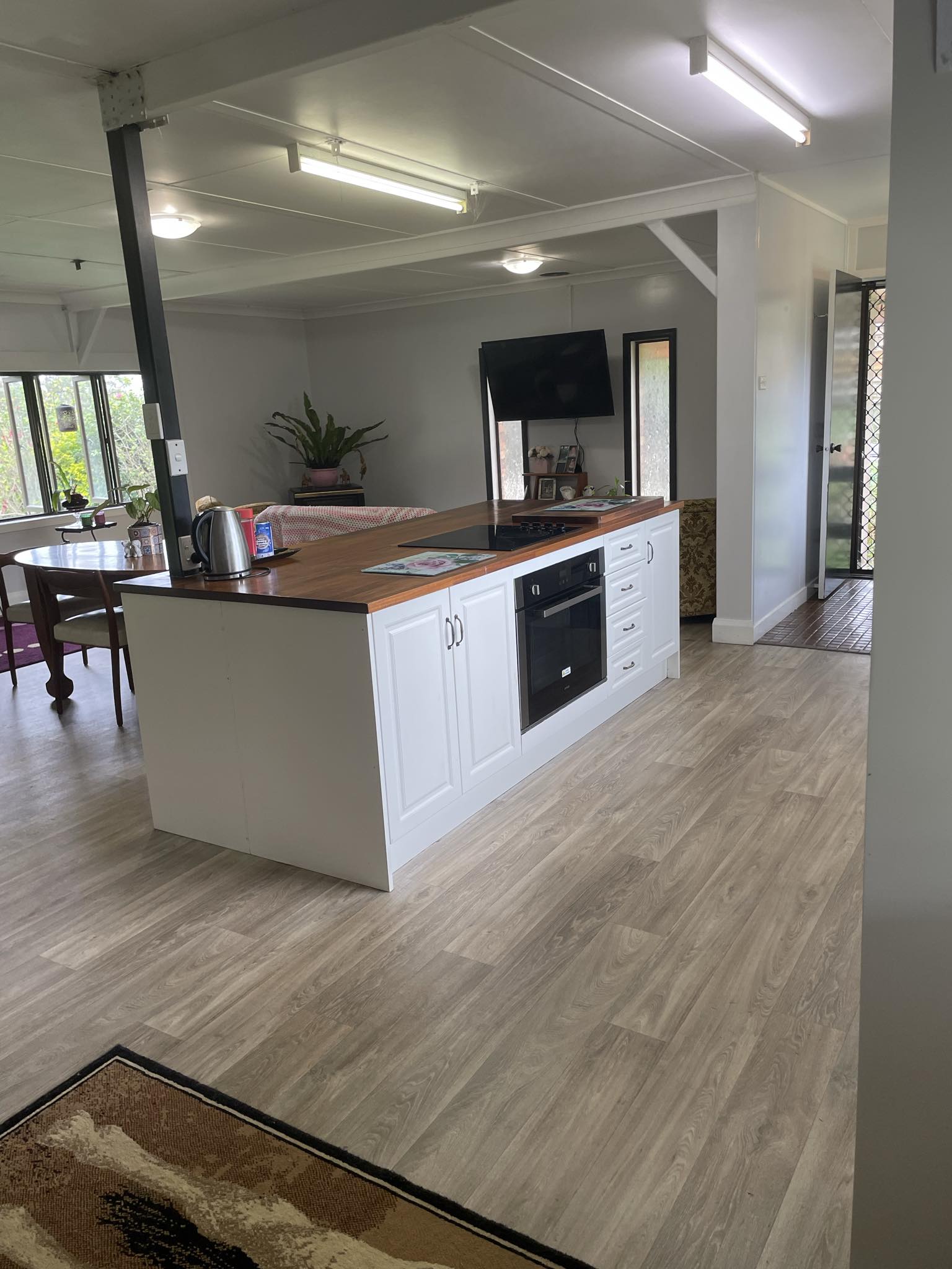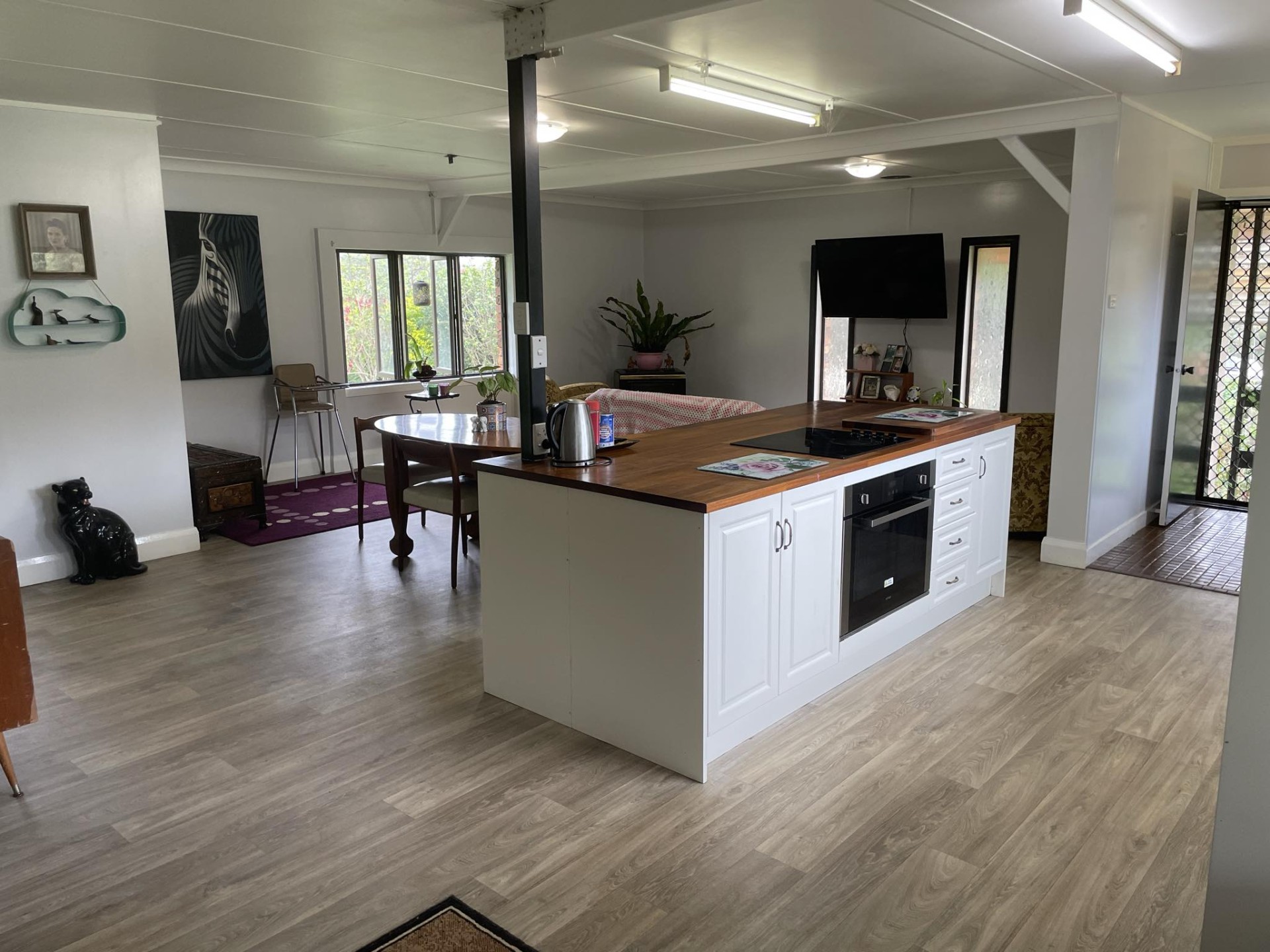 Steel framed three bedroom house, open plan living, verandas front and back, single carport at house.