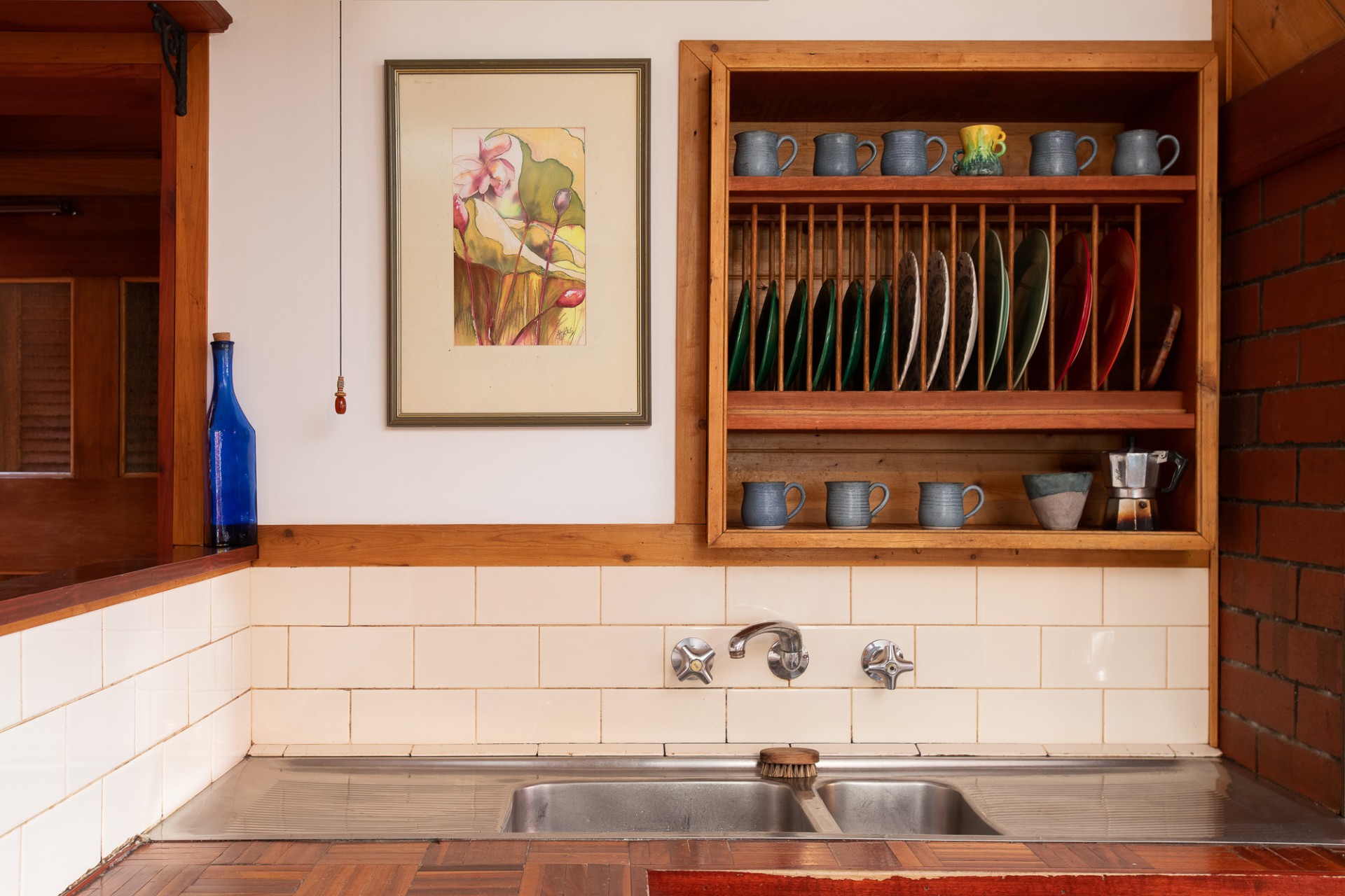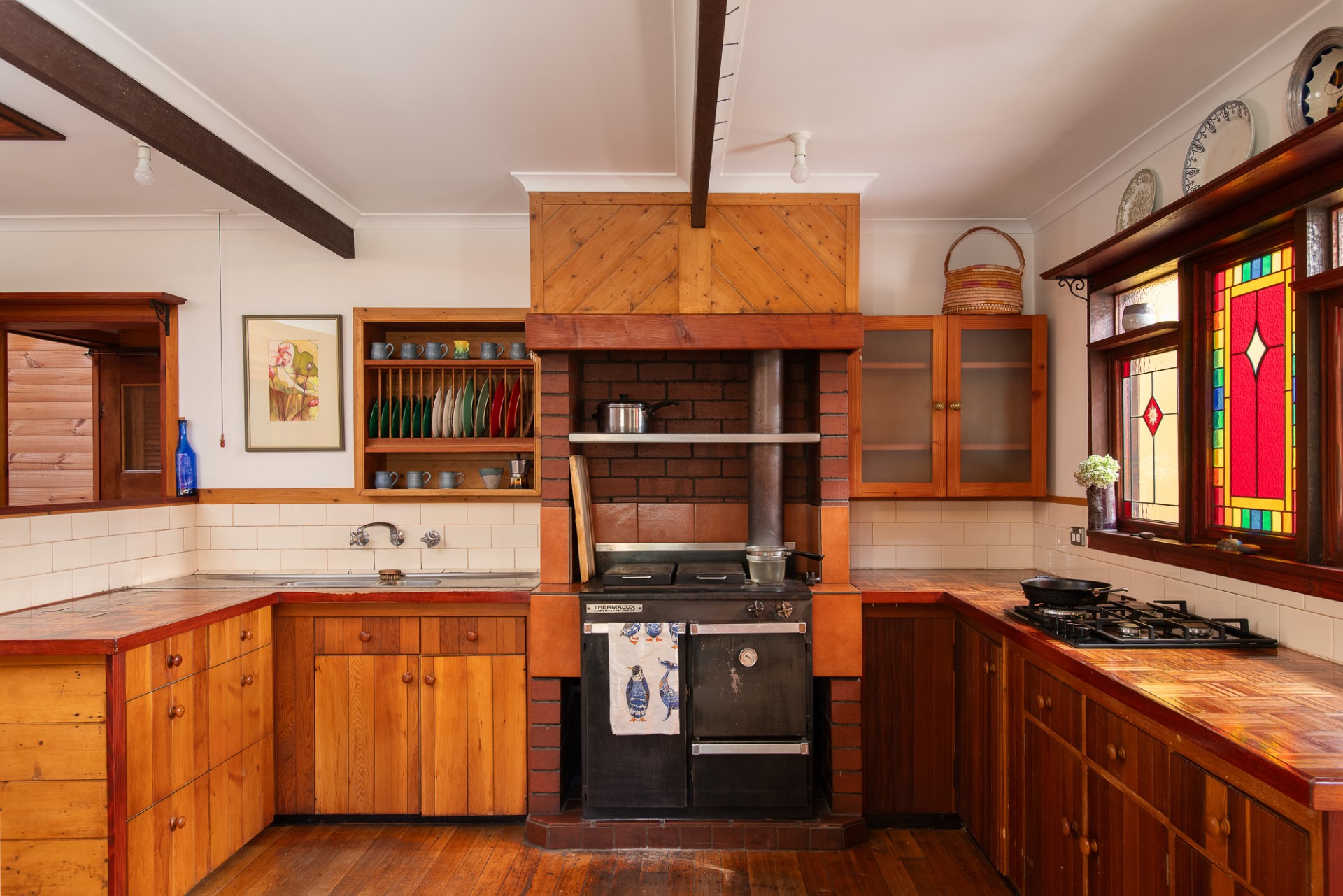 - open plan kitchen/dining room with generous wooden benches, a wood fired stove used for cooking and heating the hot water system, a gas top, a solar hot water system, and an off-the-grid fridge.