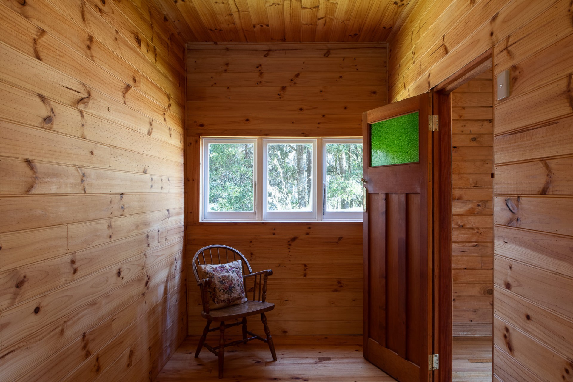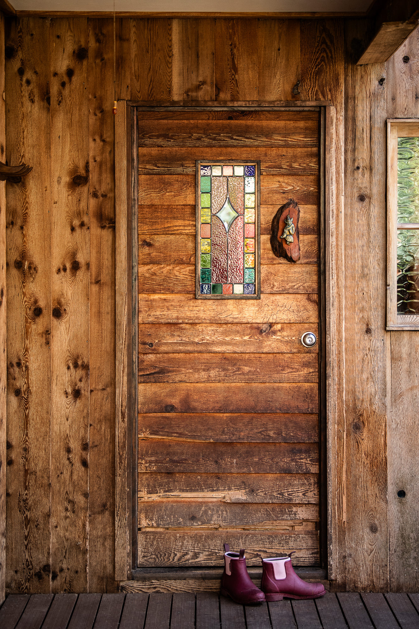 - on the north side of the kitchen is a double door that leads into a sun-drenched sunroom looking out onto the garden, farm, and forest.