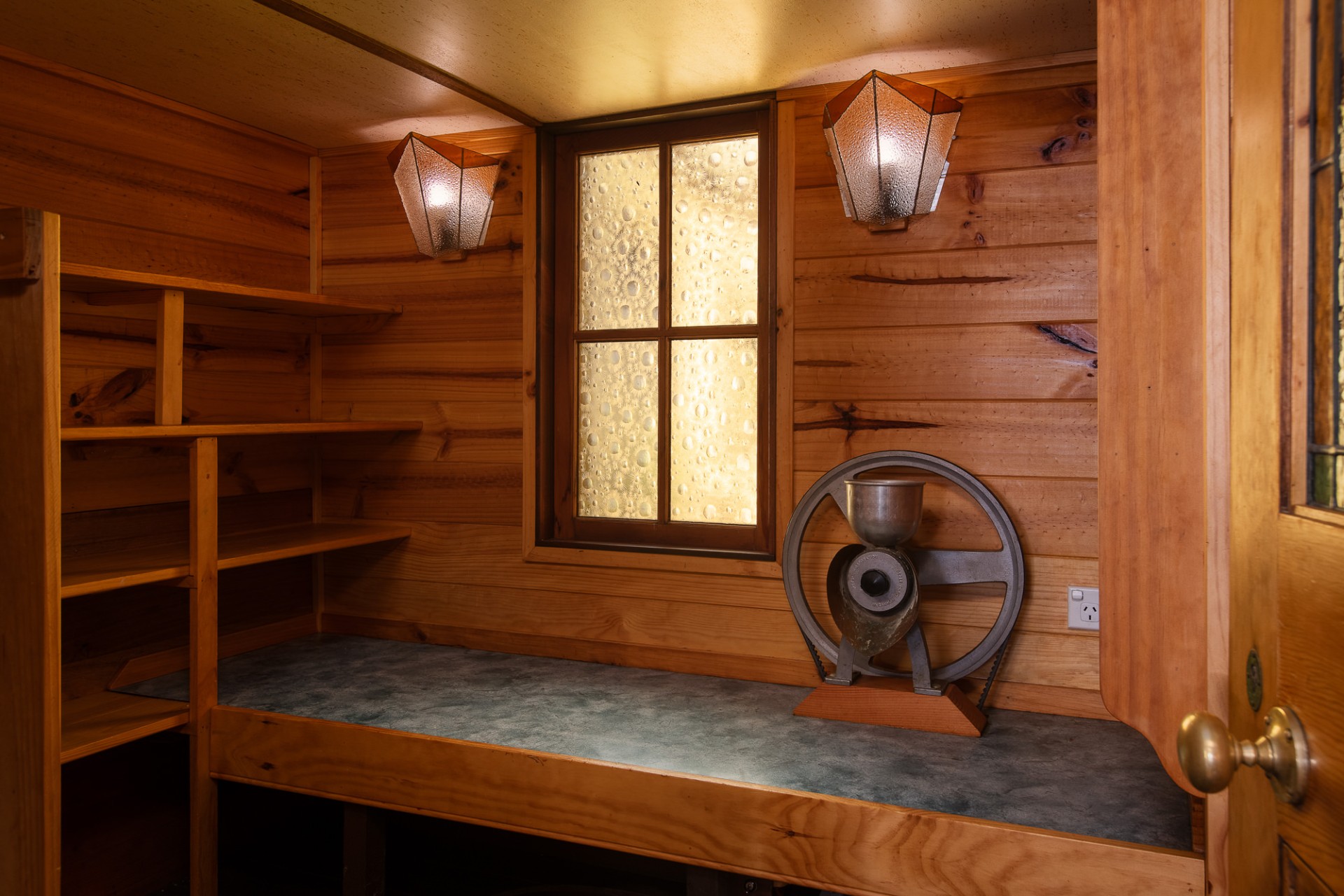 - large pantry on the south side of the kitchen with more bench space, shelving, and flour mill.