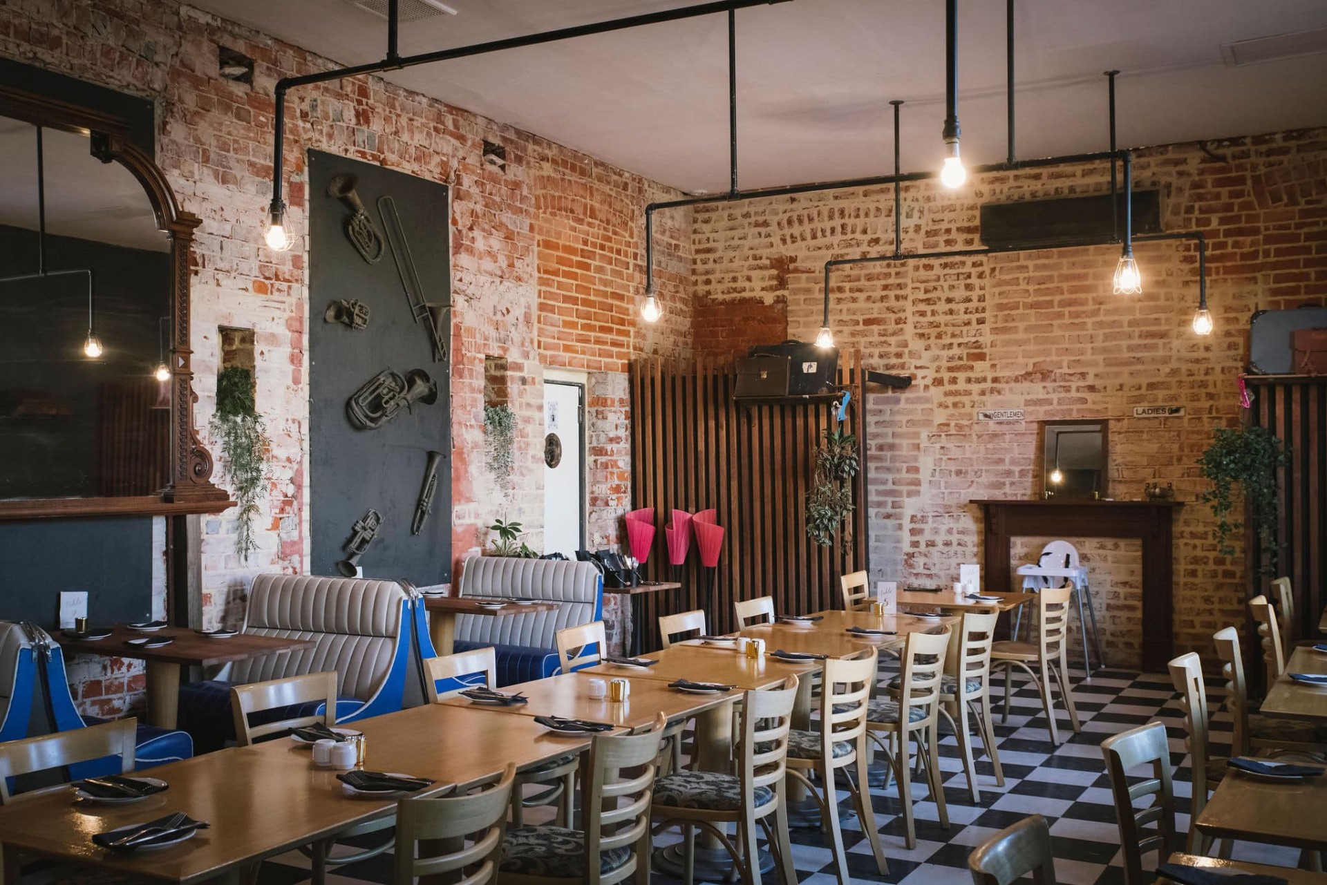 Renovated to exposure the original brickwork the restaurant area has a chequered floor with numerous railway memorabilia. The bench seats from the railway carriage outside have been relocated to the restaurant and provide a comfortable alternative to traditional restaurant seating. The exposed wall has a display of old musical instruments, battered and bent with many stories to tell. The gentleman's bathroom showcases an innovative use for beer kegs which results in regular exclamations on existing of "you've got to see this" The restaurant also has its own bathrooms which enable the area to be booked privately with staff access directly to the kitchen.