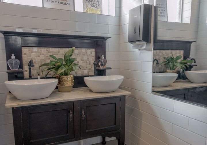 Outside the lounge at the bottom of the grand staircase there is the disabled unisex bathroom and another ladies bathroom. Conveniently located for both guests inside or out.
