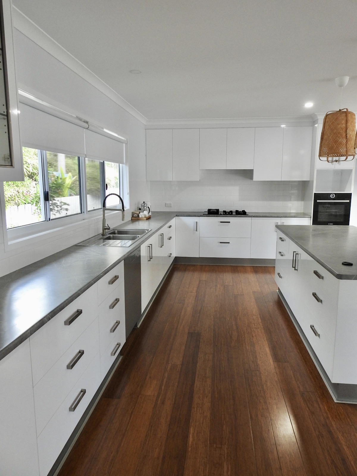 The large entertainer's kitchen with gloss white cabinets, lots of drawers, a huge walk in pantry, gas cooking and breakfast bar is at the heart of the home.