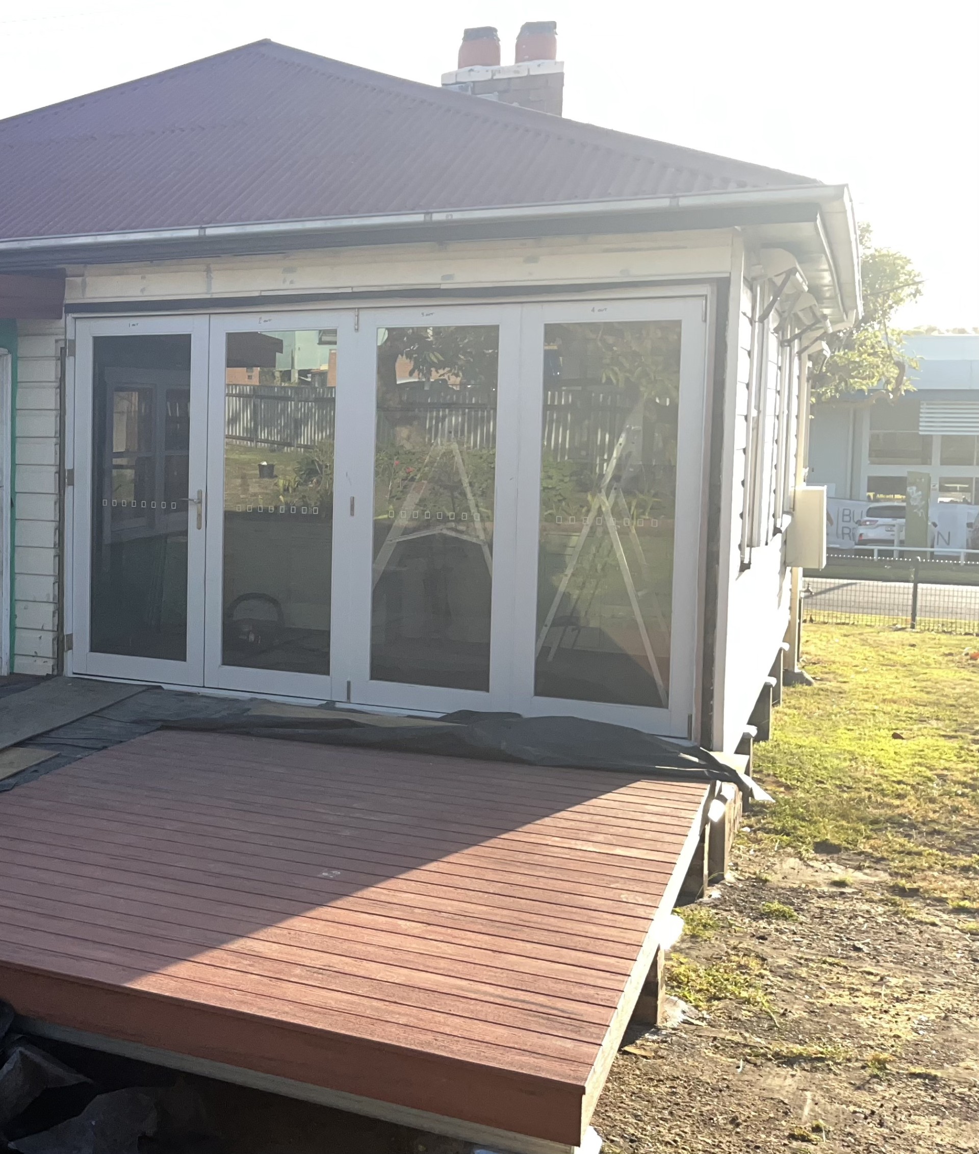 Opening onto a new rear deck & entertaining area .