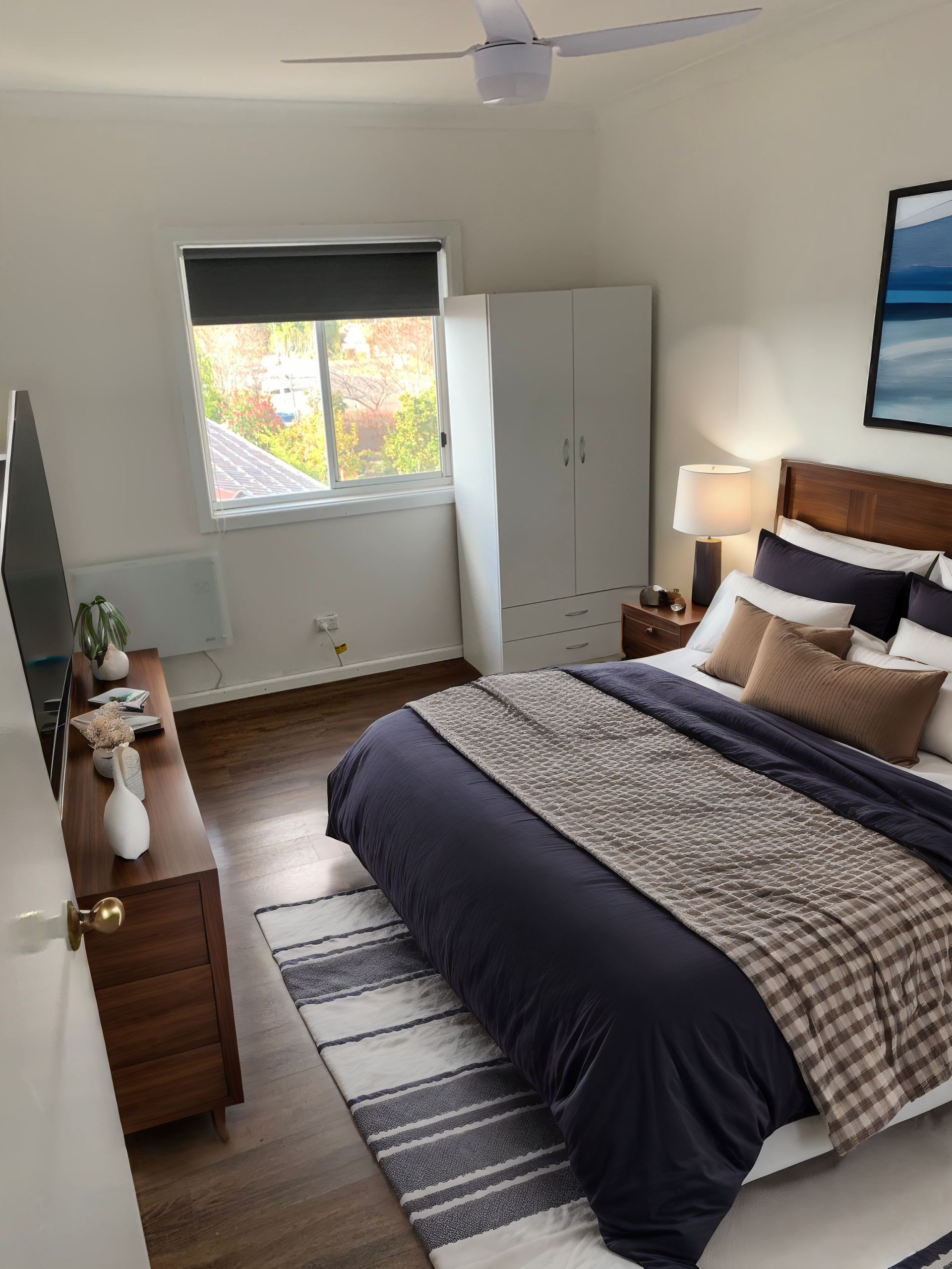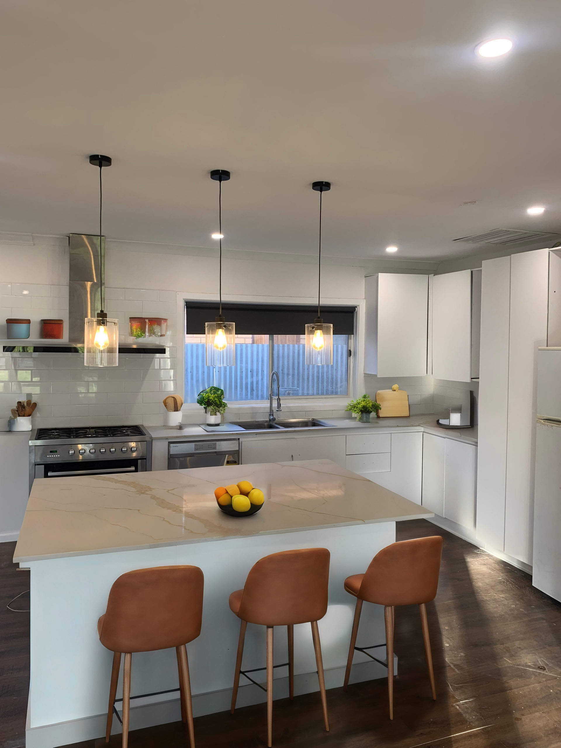 Open plan kitchen/dining/living area includes gas/electric oven, a powered kitchen island, quartz bench tops and ceiling height cabinets for plenty of storage. The living/dining area includes a 3m wide fireplace and bay window for a homely feel and plenty of natural light.